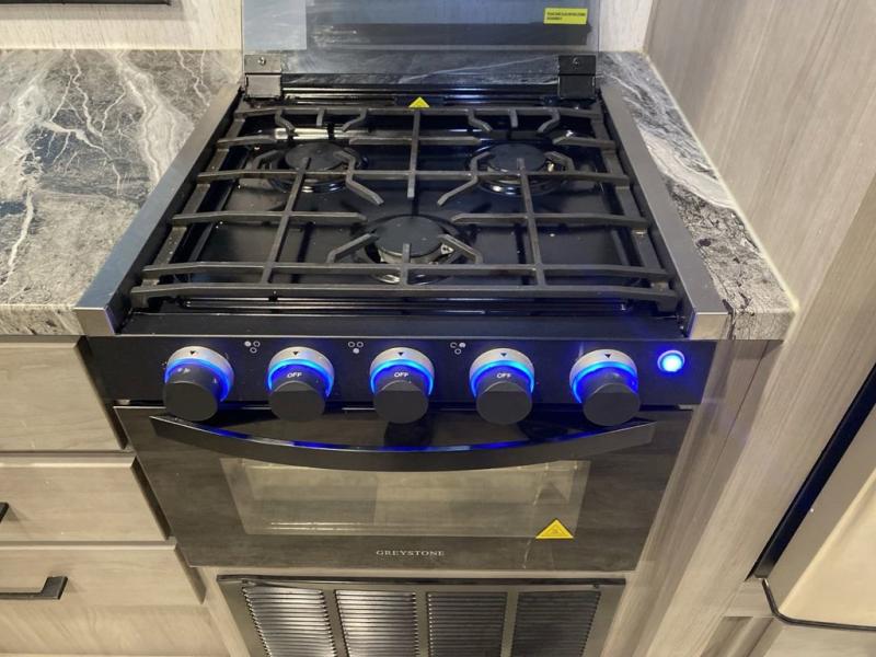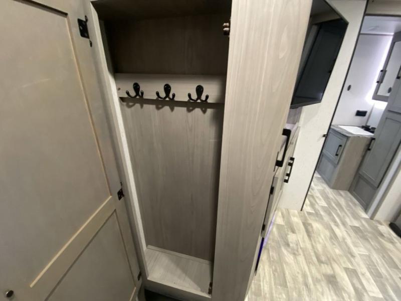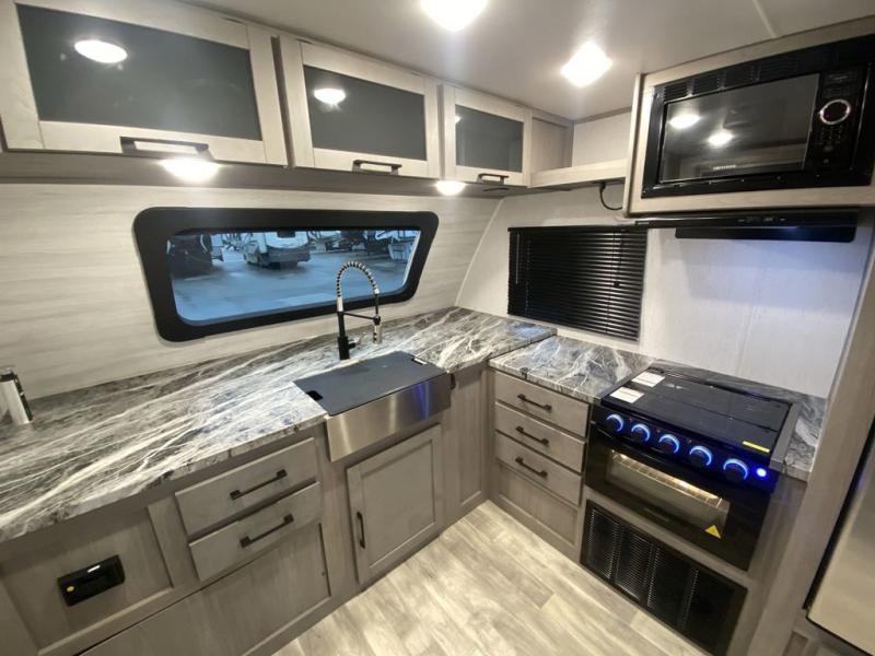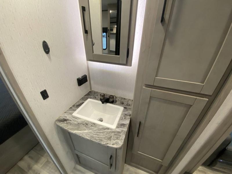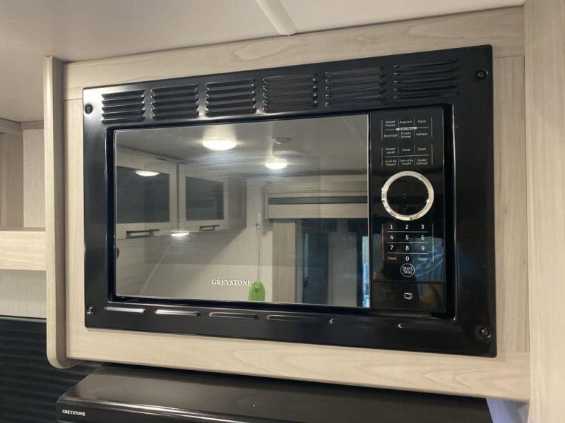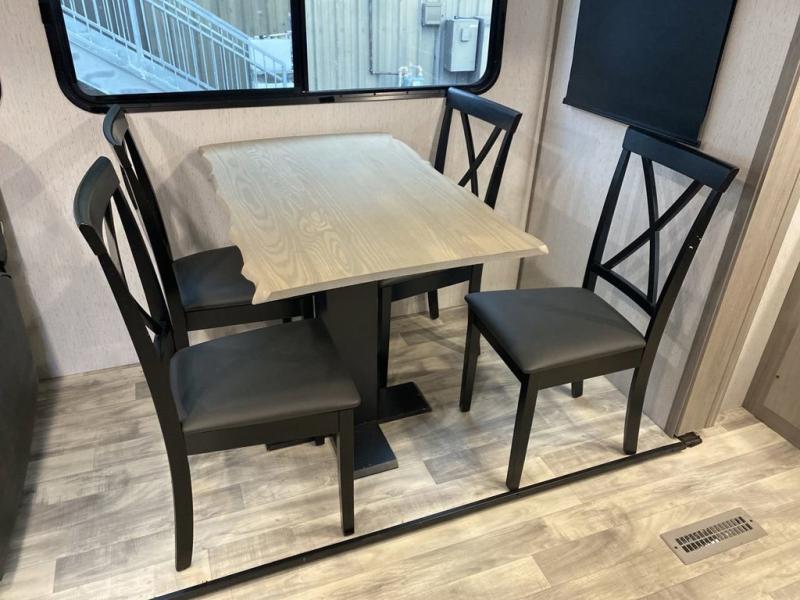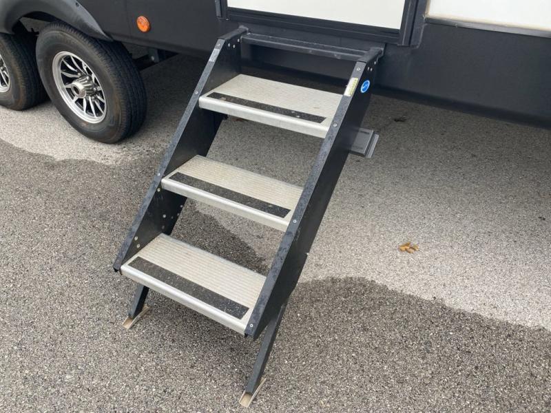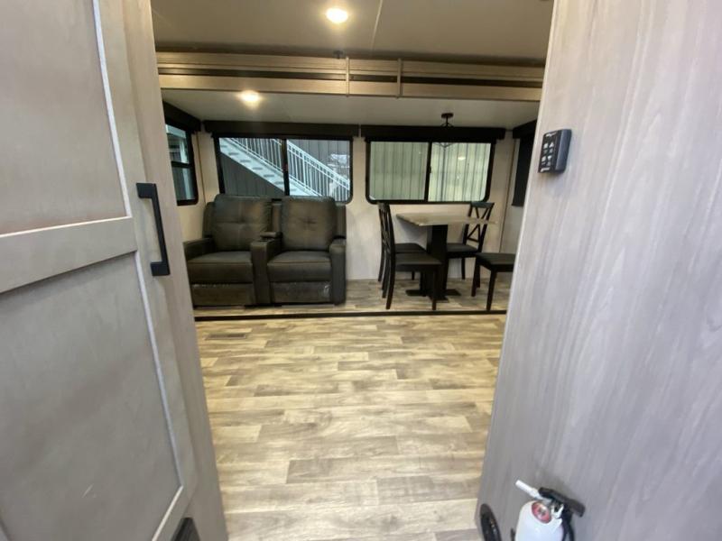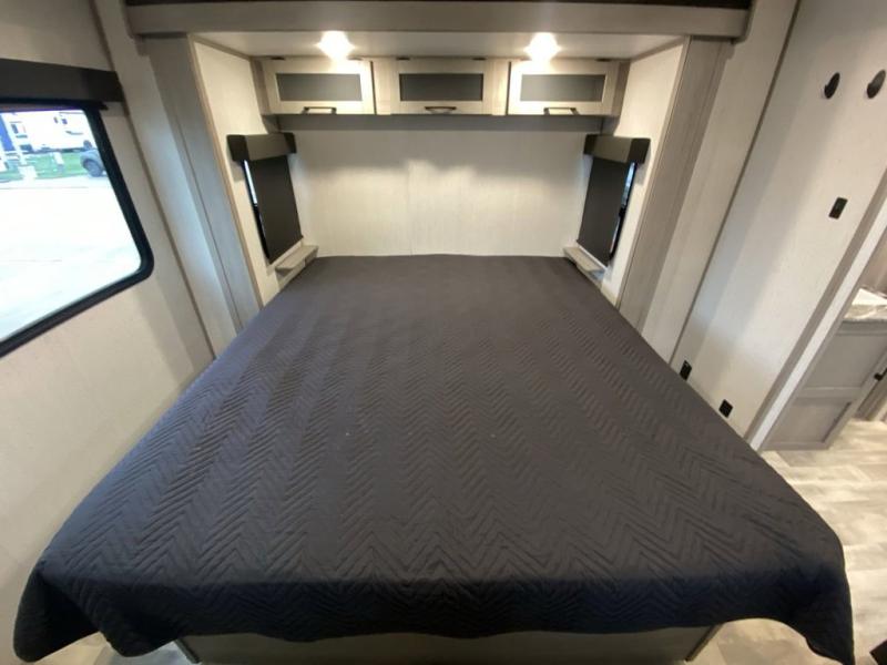 You will love every minute spent in this spacious travel trailer that includes dual slide outs! The walk through bath will create a rear master bedroom you are sure to love. You can sleep soundly on the king bed and relax in front of the bedroom fireplace. The chef of your group will have ample counter space in the kitchen to prep meals, plus there is a 10 cu. ft. refrigerator to store perishables. After dinner, get comfortable on the theater seats or play a game at the booth dinette. Or you may just want to relax outdoors under the 20' power awning with LED lights!