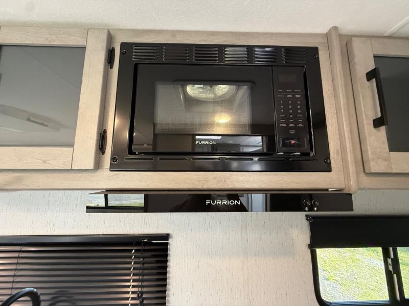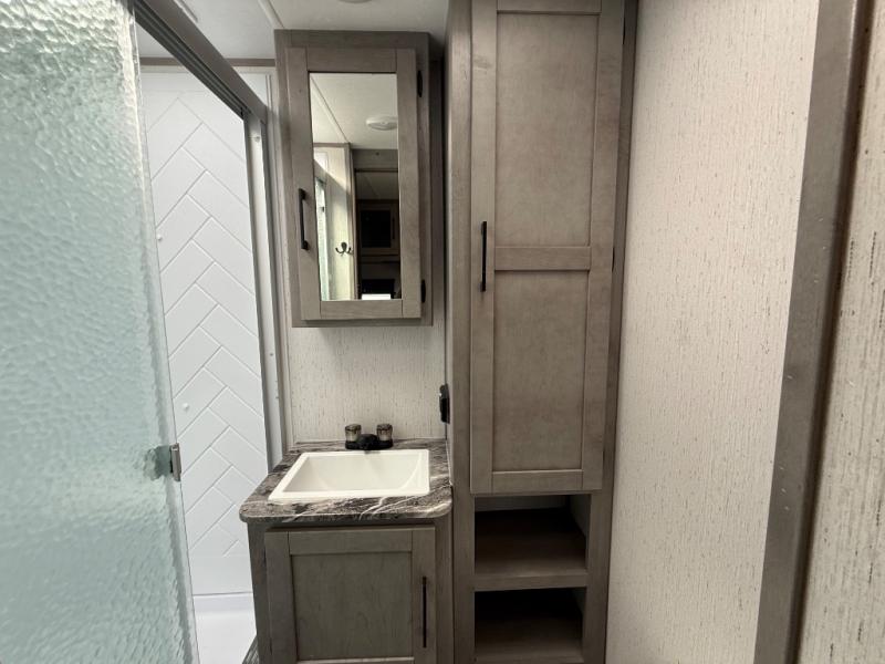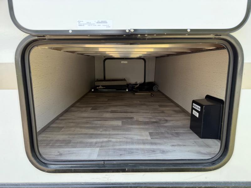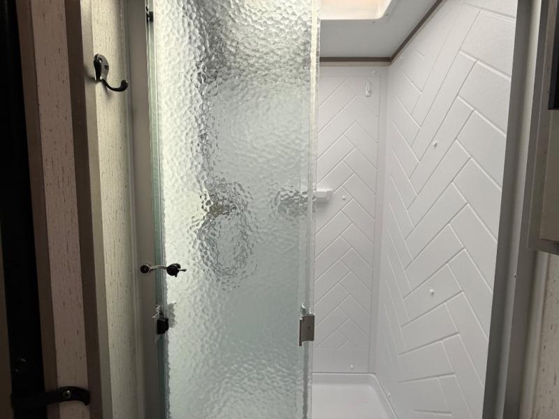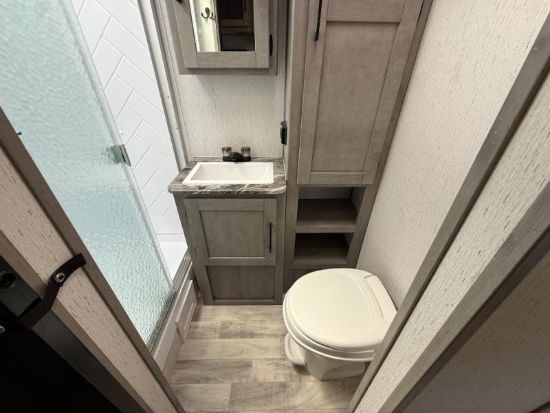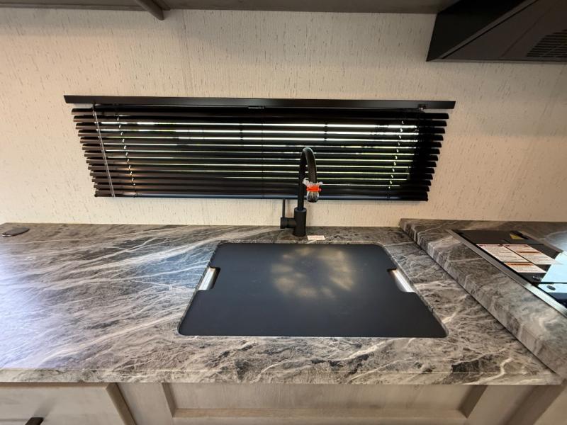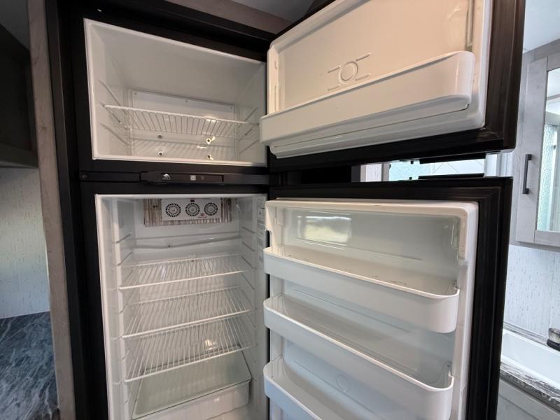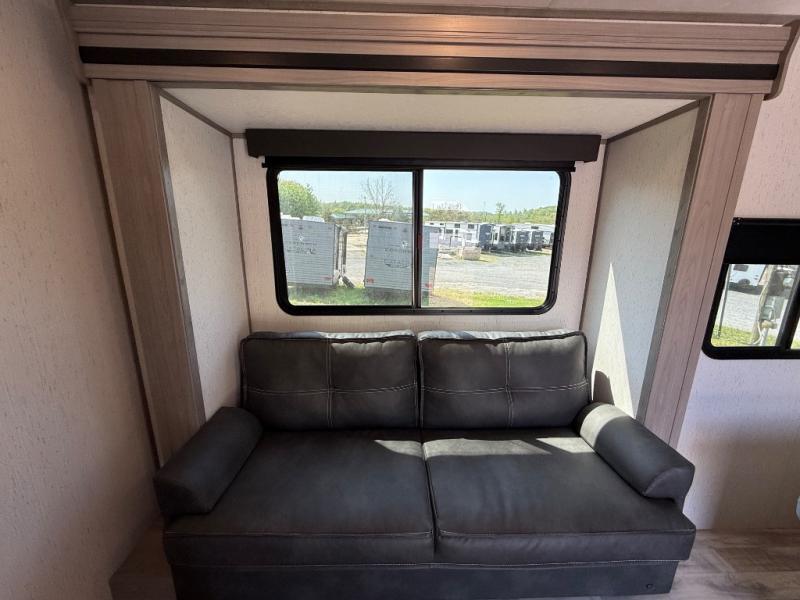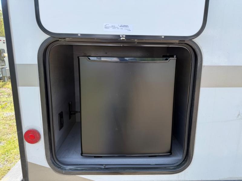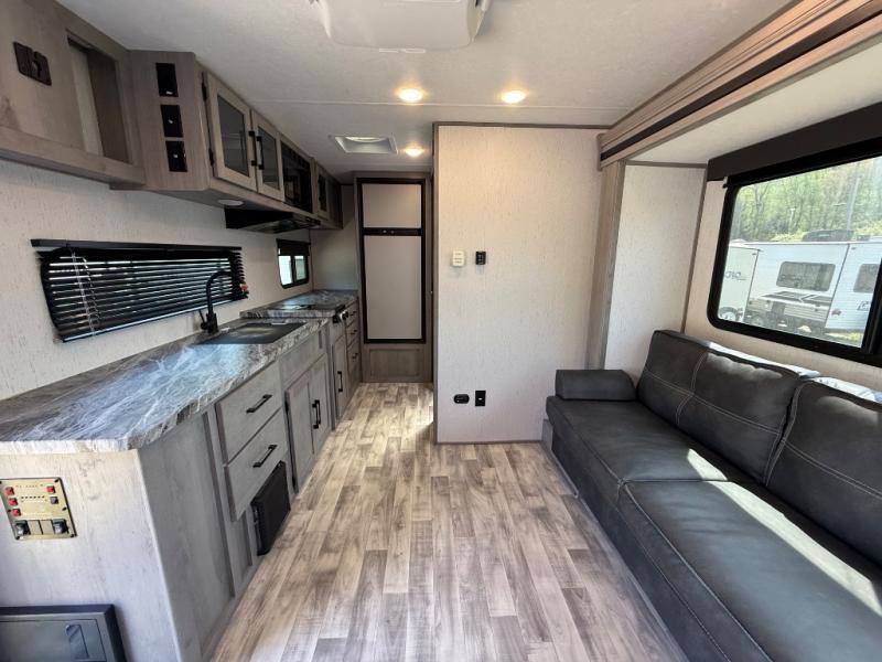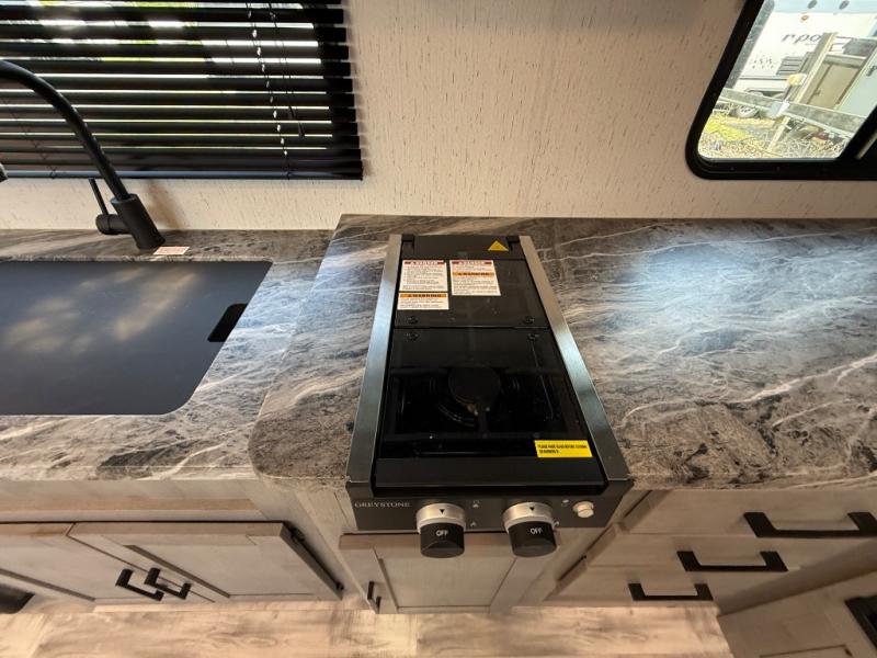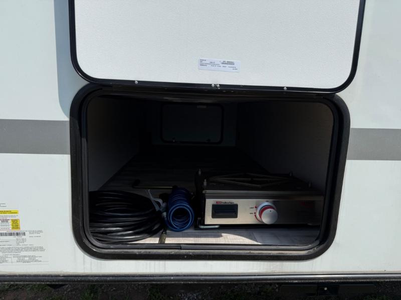 Pack your bags and hitch up this travel trailer for a fun weekend getaway! Start your mornings feeling refreshed after sleeping on the front queen bed and clean up in the rear corner bathroom with the shower that has a skylight above it. Grab some eggs and bacon from the 6 cu. ft. stainless steel refrigerator and fry them up on the two burner range with glass cover or you can cook them at the outside griddle while breathing in some fresh air. The sofa has an indoor/outdoor table for extra versatility. Store all of your outdoor gear in the exterior pass-through storage!