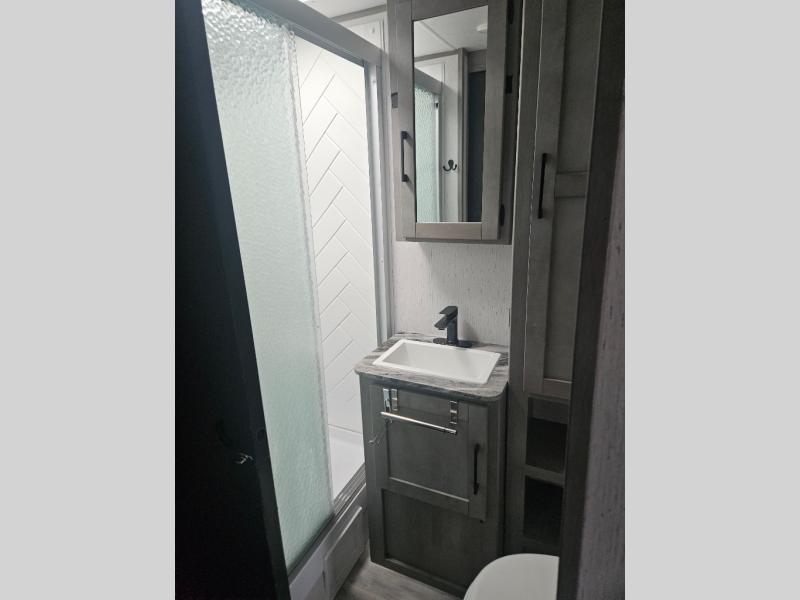 Pack your bags and hitch up this travel trailer for a fun weekend getaway! Start your mornings feeling refreshed after sleeping on the front queen bed and clean up in the rear corner bathroom with the shower that has a skylight above it. Grab some eggs and bacon from the 6 cu. ft. stainless steel refrigerator and fry them up on the two burner range with glass cover or you can cook them at the outside griddle while breathing in some fresh air. The sofa has an indoor/outdoor table for extra versatility. Store all of your outdoor gear in the exterior pass-through storage!