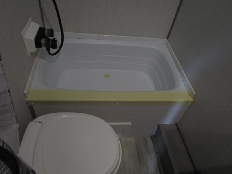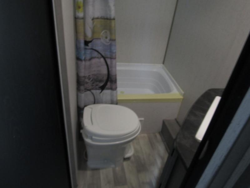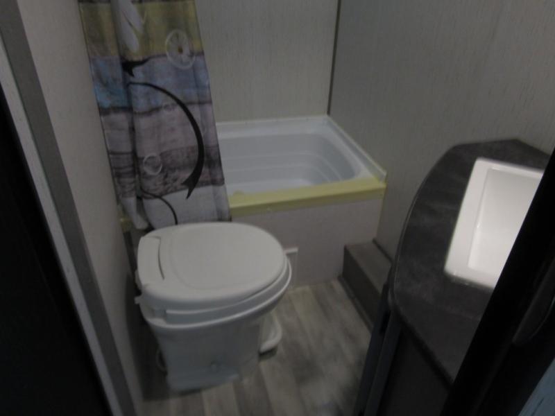 - The full bathroom includes a shower, toilet, and a vanity with storage space, giving you all the comforts you need to freshen up after a day of outdoor fun.