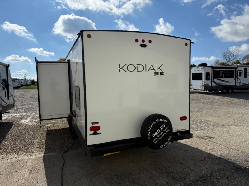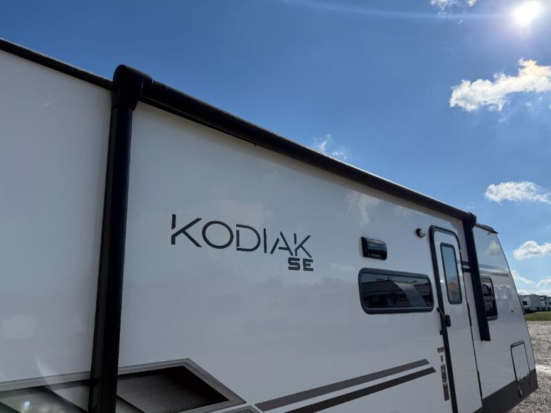 With any Kodiak SE travel trailer by Dutchmen RV, you can experience comfort while camping at a moment's notice. Each trailer includes features such as power front and rear stabilizer jacks, a power tongue jack making set-up easy, and a power awning with LED light. Each model is pet-friendly with the carpet-free slide out floor, tile flooring, and the pet leash D-ring. You can enjoy the wireless Bluetooth speaker, the LED interior and exterior lighting, and the 80" interior height. From the floor structure which includes a fully enclosed underbelly to the laminated walls with aluminum frame and block foam insulation, any Kodiak SE is built lightweight and ready for adventure!