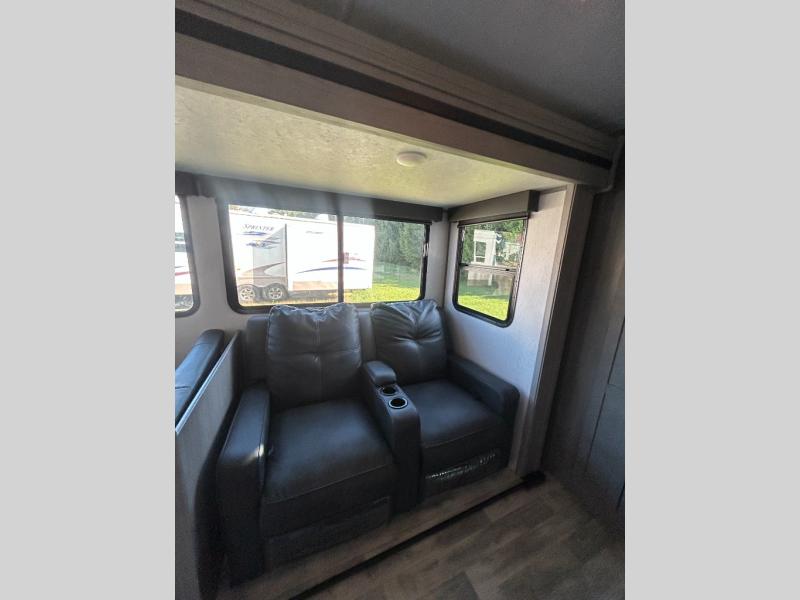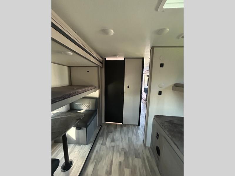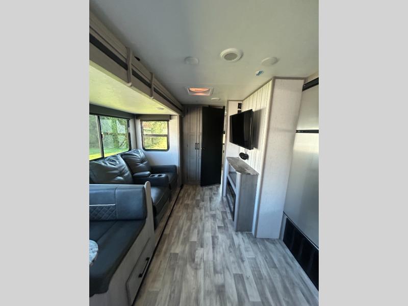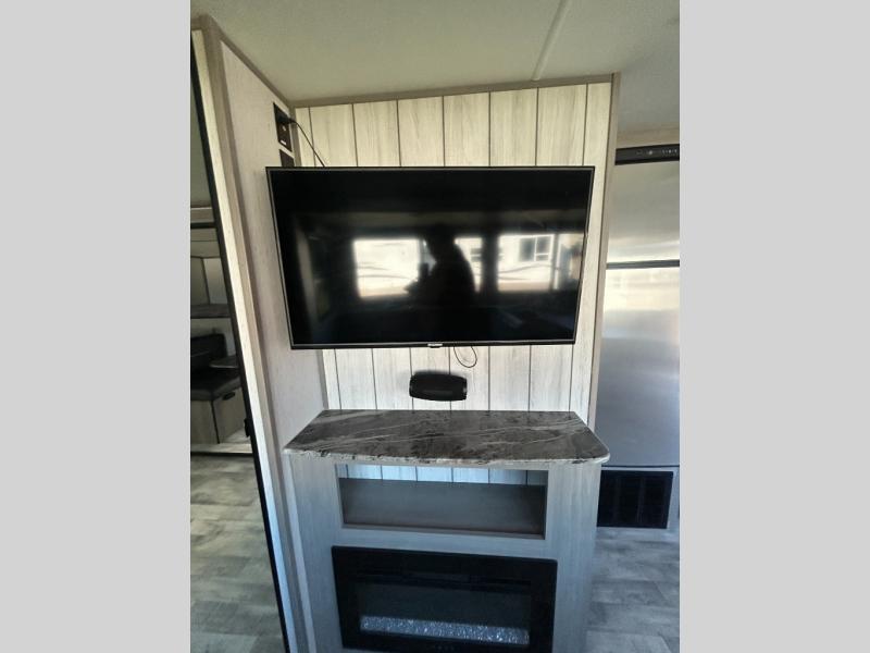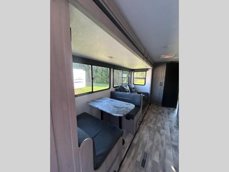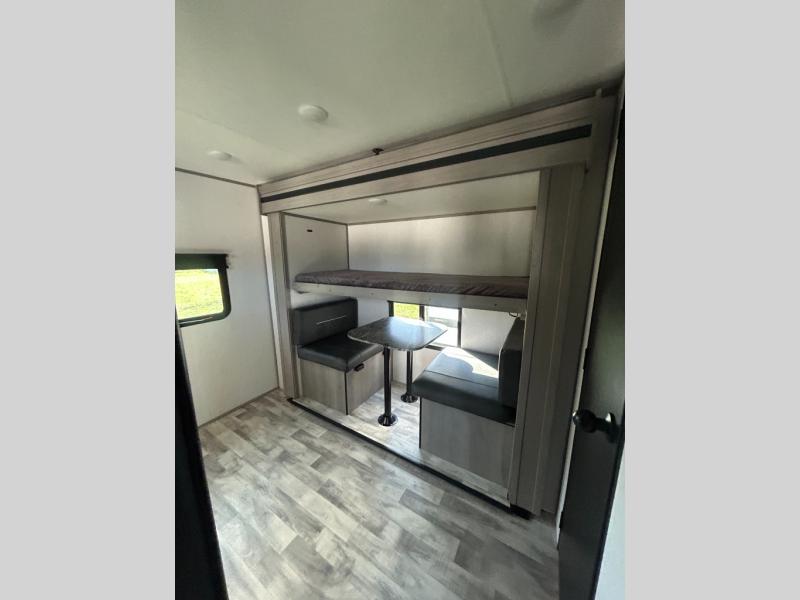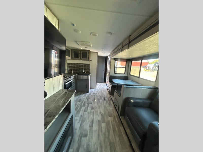 This travel trailer can comfortably sleep seven people each night, so invite your grandkids or neighbor friends along! There is a full bath close to the front bedroom, plus a half bath in the private bunkhouse for convenience, and the outdoor kitchen will be a hit with everyone! If a rainy day is ruining your plans, you can relax on the sofa across from the fireplace, or play board games at the booth dinette. And don't forget to check out the front private bedroom with a king bed!