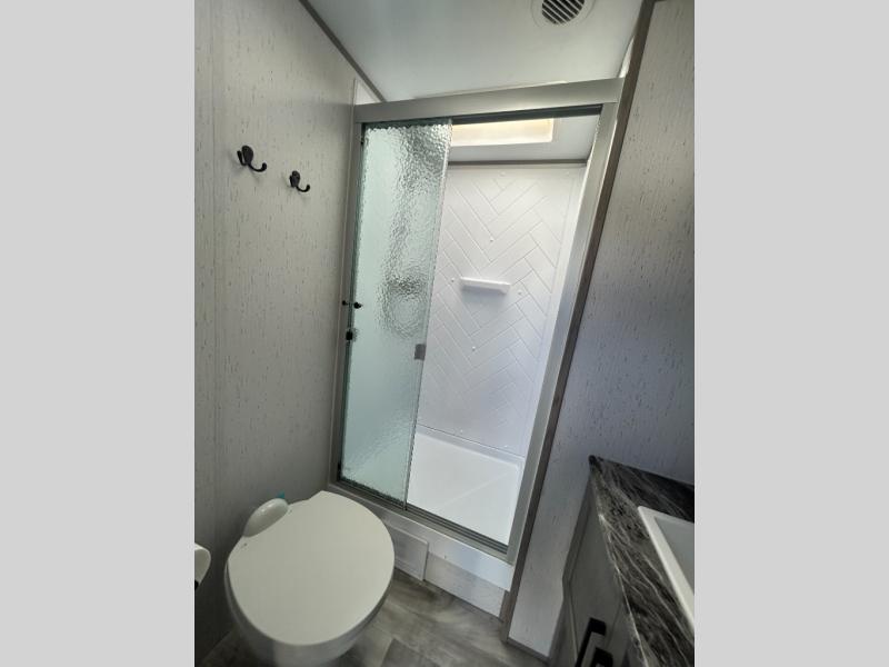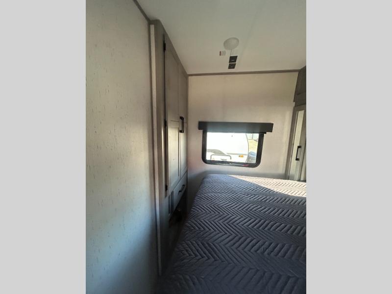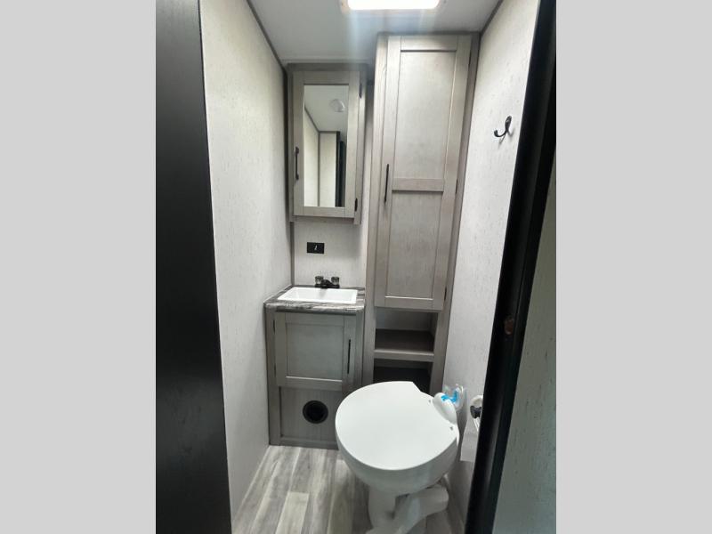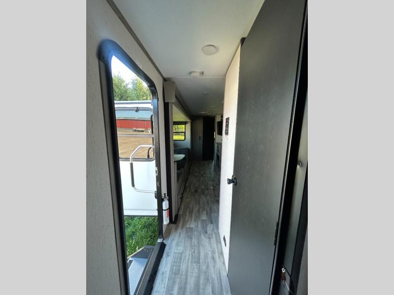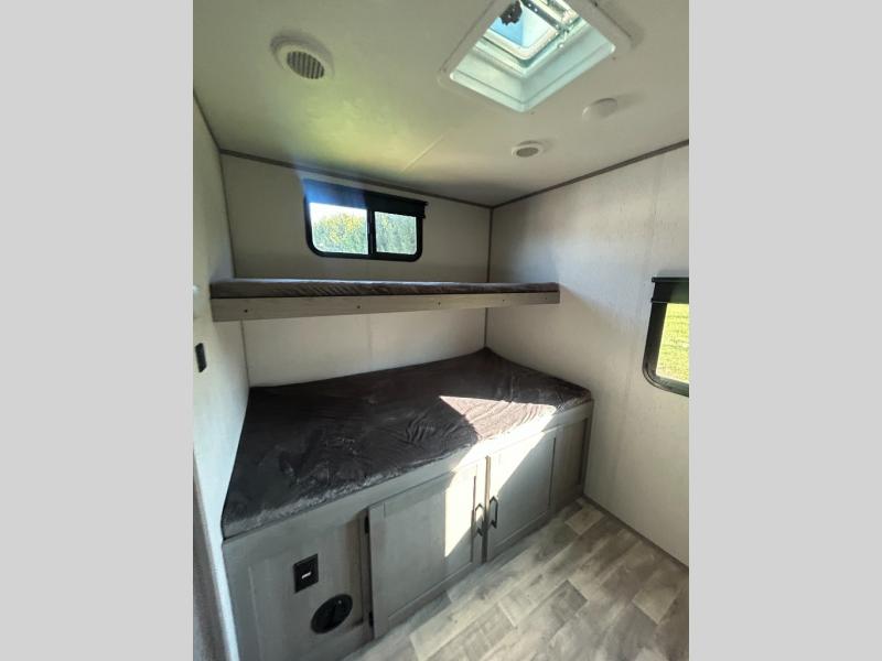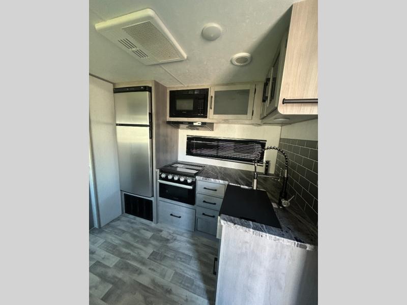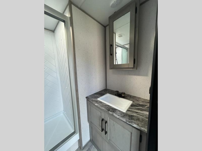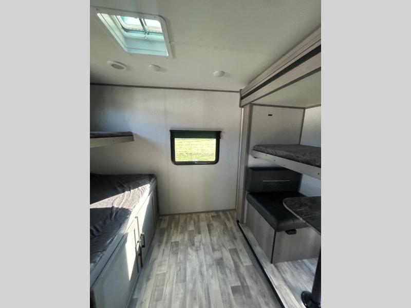 This travel trailer can comfortably sleep seven people each night, so invite your grandkids or neighbor friends along! There is a full bath close to the front bedroom, plus a half bath in the private bunkhouse for convenience, and the outdoor kitchen will be a hit with everyone! If a rainy day is ruining your plans, you can relax on the sofa across from the fireplace, or play board games at the booth dinette. And don't forget to check out the front private bedroom with a king bed!