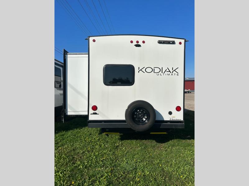 Each Kodiak Ultimate travel trailer by Dutchmen is constructed with a laminated crowned roof, a gel coat high gloss fiberglass exterior, and diamond plate front rock guard to protect your RV from rock and debris on the way to the campground. The hybrid aluminum entry steps are not only dependably, but they collapse and expand quickly so you can get on the road in no-time! These models feature HyperDeck flooring that includes fiberglass reinforced polypropolene and a fully enclosed underbelly, and the Bear Cave storage allows you to bring along all of your hiking and fishing gear. Some of the other interior features you are sure to love are the kitchen and bath skylights, the oversized dinette windows, night shades throughout, and more. Your next adventure starts with a Kodiak Ultimate travel trailer!
