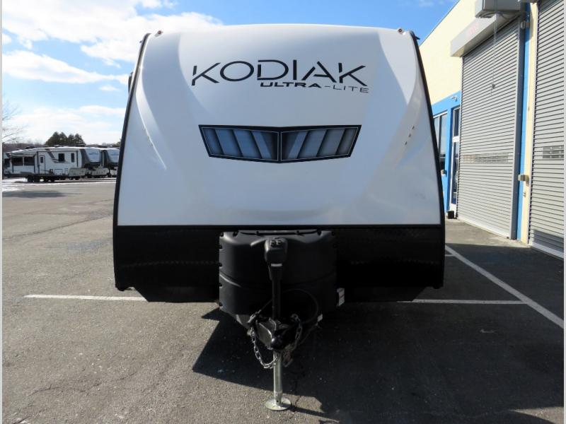 Each Kodiak Ultra-Lite travel trailer by Dutchmen includes a laminated crown roof, aluminum framing, and bear cage construction for a lightweight, yet durable RV. The HyperDeck flooring features fiberglass reinforced polypropylene, a higher density foam core, and a steel powder coated main frame. Head indoors to find seamless countertops, night shades throughout, and USB ports for your electronics. These travel trailers come with a power tongue jack and power stabilizer jacks for easy set-up, and easy lube axles to ensure smooth towing. Since the Kodiak Ultra-Lite is prepped for WiFi 4G LTE you can choose to get some work done while you're away from home, and you might even want to add the 32" LED TV available on some models!