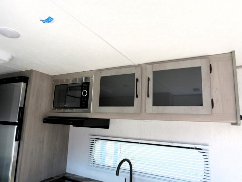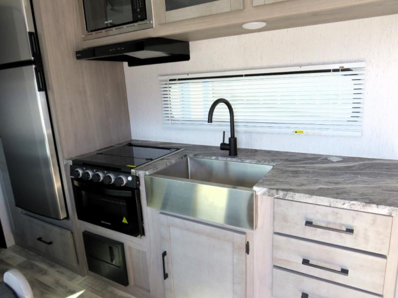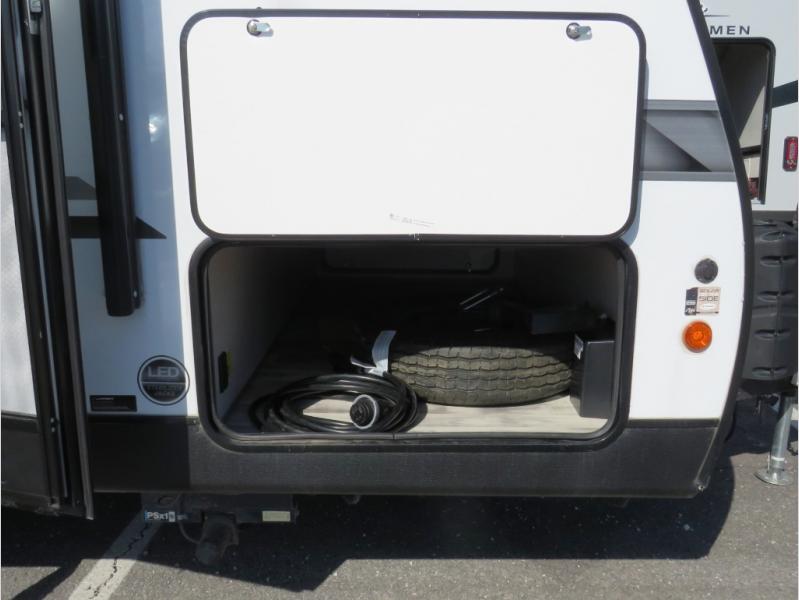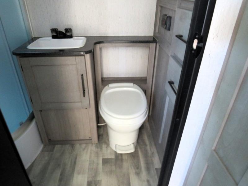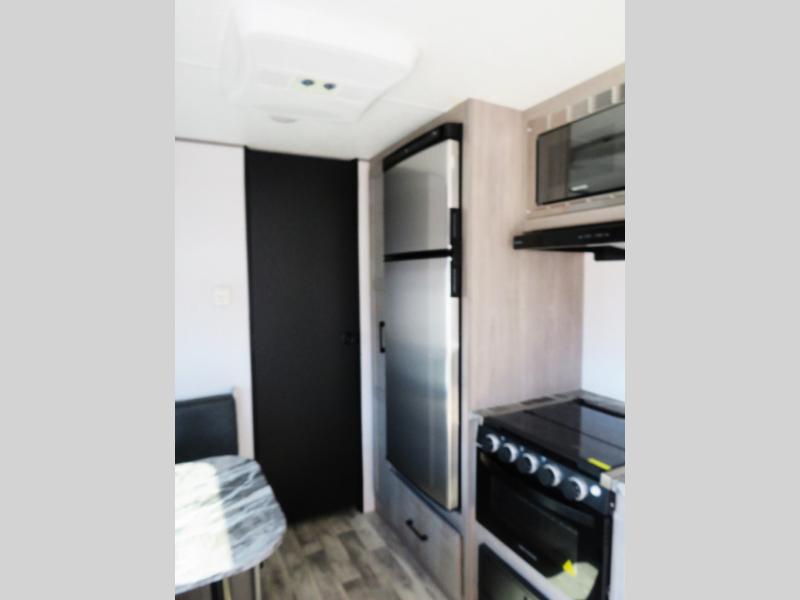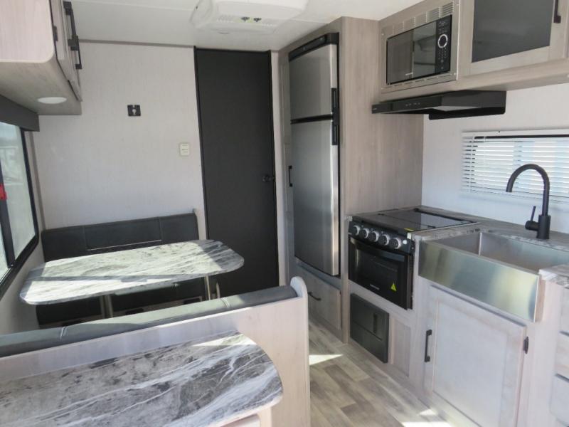 This couple's trailer is perfect for weekend excursions or extended getaways at your favorite state park. You will have your own queen bed up front with storage space for your things, and the full rear bath will add privacy and convenience. Prepare your meals on the three burner range or in the microwave oven, and you can dine together at the booth dinette. The dinette can also be used as additional sleeping space for one guest or two kids.