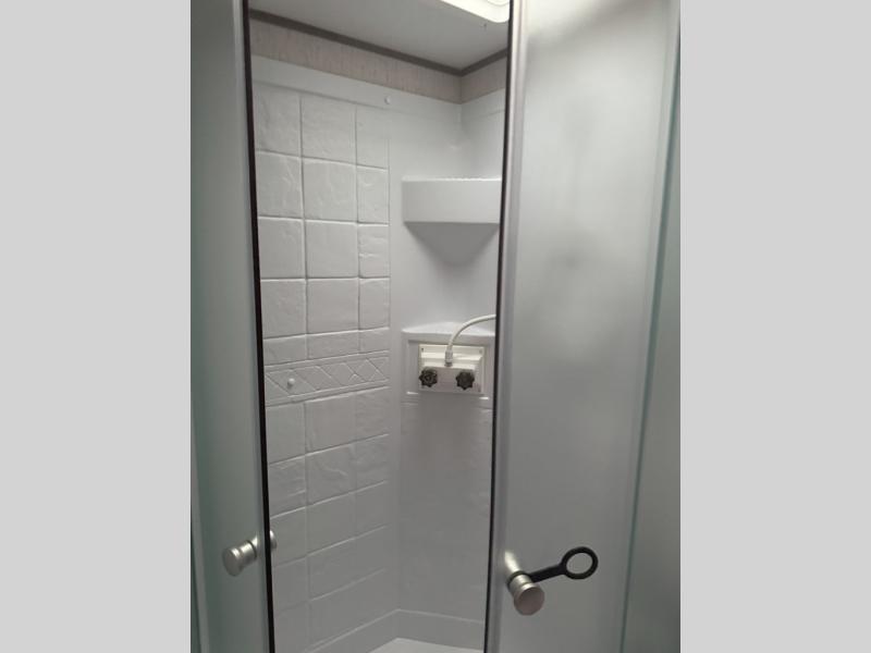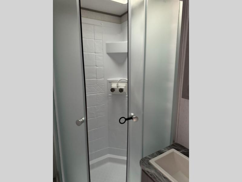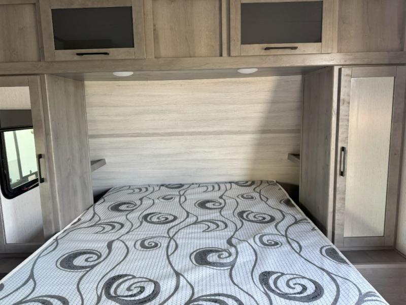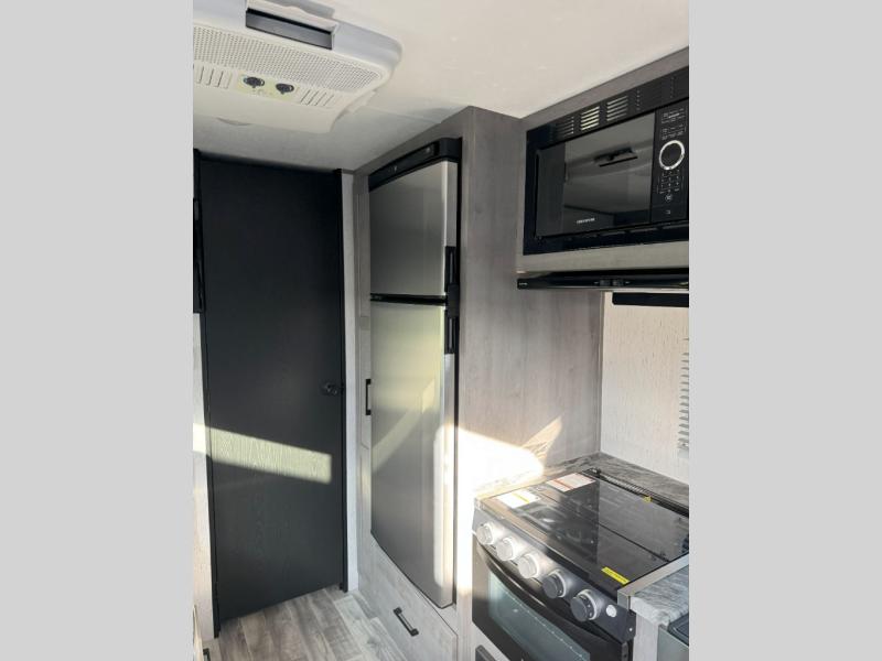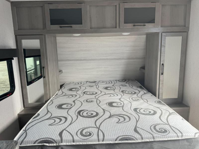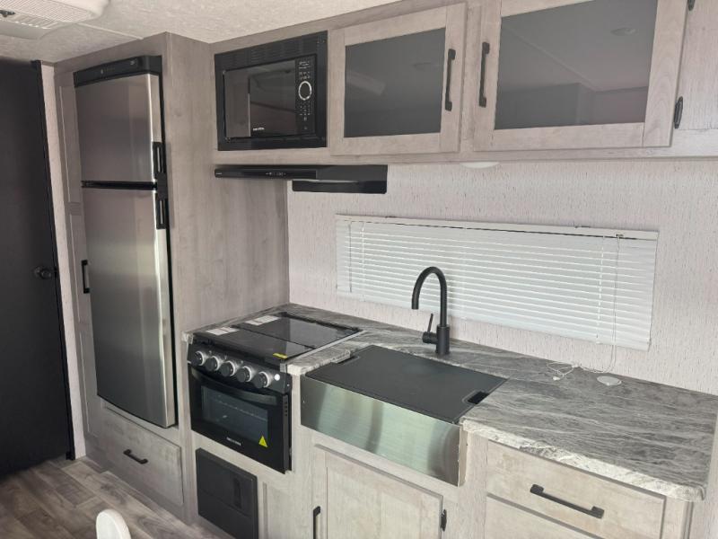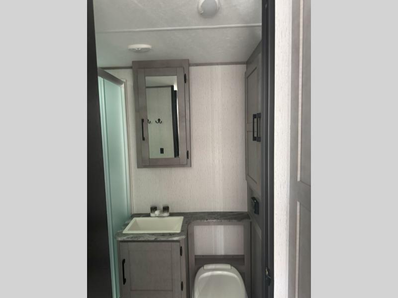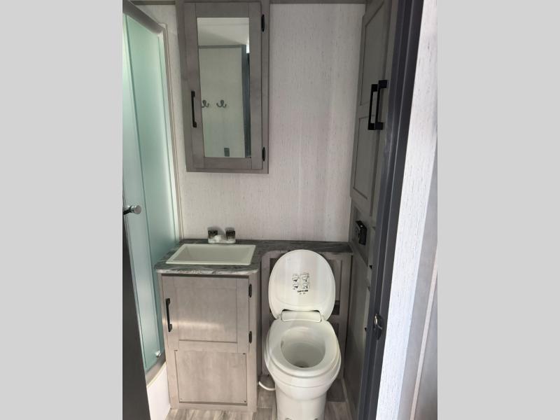 This couple's trailer is perfect for weekend excursions or extended getaways at your favorite state park. You will have your own queen bed up front with storage space for your things, and the full rear bath will add privacy and convenience. Prepare your meals on the three burner range or in the microwave oven, and you can dine together at the booth dinette. The dinette can also be used as additional sleeping space for one guest or two kids.