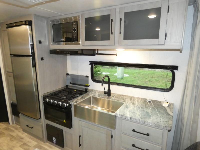 If you're looking for a lightweight travel trailer with more sleeping space, your search is over with this Kodiak Ultra-Lite. When you arrive at the lake, set up the 18' power awning with LED lights, then grab the fishing poles from the pass-through storage. When you return with your catch, you can cook it on the outside kitchen, then head indoors to freshen up in the full bath. The little ones may want to take a rest on the double-size bunks, while the adults enjoy the queen bed up front. This model includes plenty of storage space, including a pantry in the kitchen for snacks!