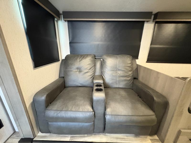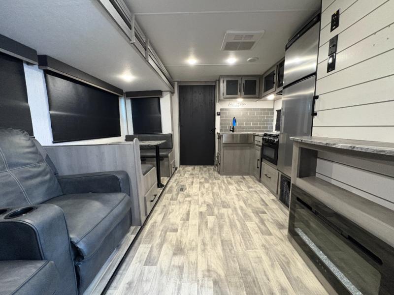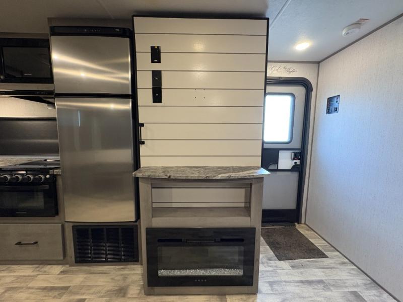 From the spacious full rear bath with a large bath wardrobe to the front private bedroom with a queen bed, you'll love everything about this travel trailer. The large slide out will provide enough space to move about freely, and here you can relax on the theater seats across from the fireplace, or dine around the U-shaped dinette. A large pantry and a 10 cu. ft. refrigerator can store your food for the week, and the exterior pass-through storage will be perfect for your large camp gear.