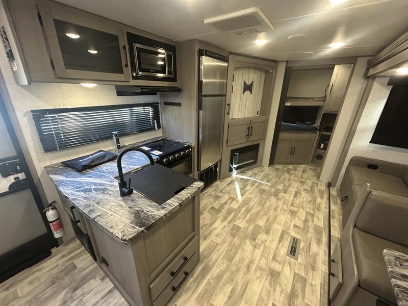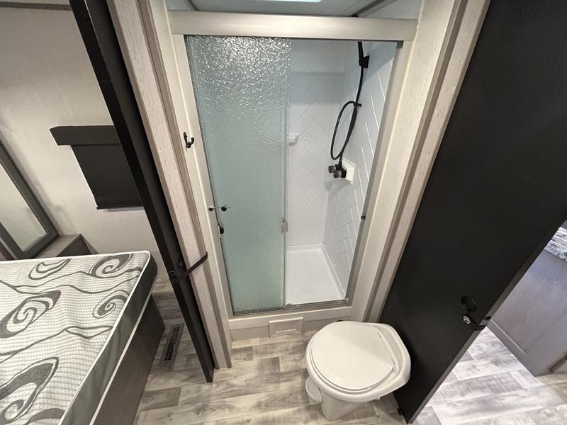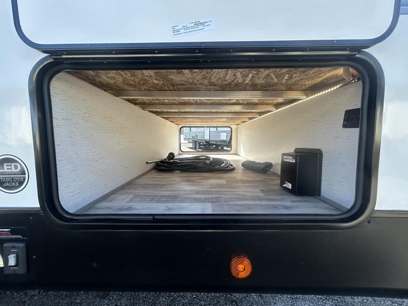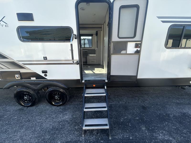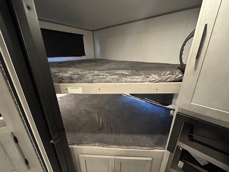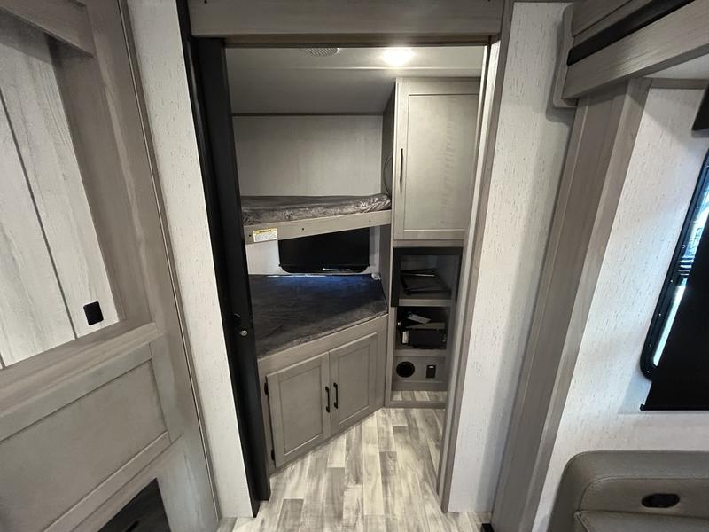 Comfort is found in this roomy travel trailer for eight! The rear bunk beds include their own door for privacy, plus there is a wardrobe here so your guests can store their things. When the large slide is out, the chef of the group can easily cook in the full kitchen, or they can use the outside kitchen if they need some fresh air. You'll also find Solid Entry steps, a 21' power awning with LED lights, plus a pass-through storage outside as well. You will love the front master bedroom with its queen bed with storage space on either side of the bed, plus the walk-through bath will be easily accessible for everyone to use!