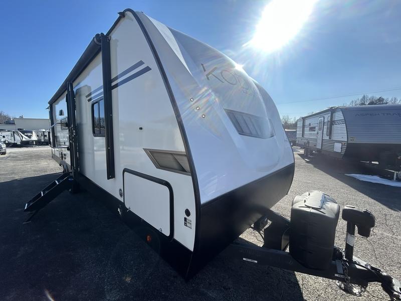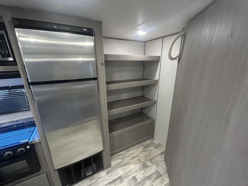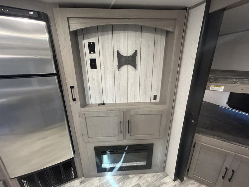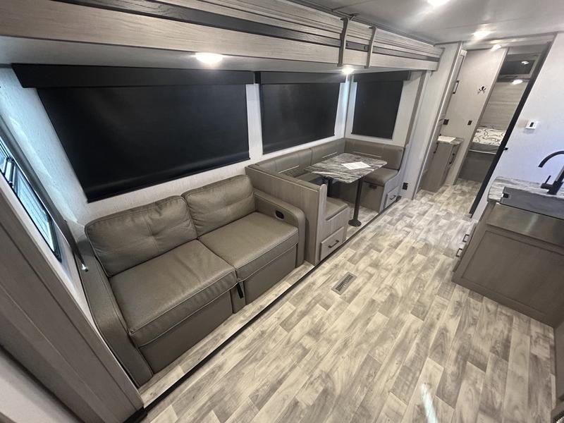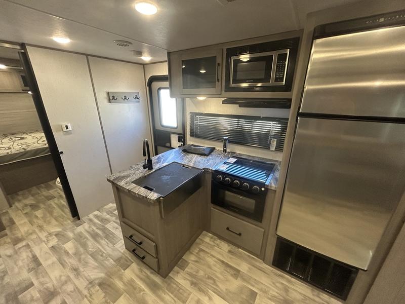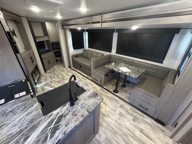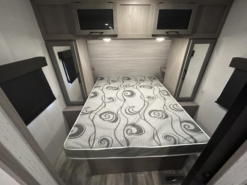 Comfort is found in this roomy travel trailer for eight! The rear bunk beds include their own door for privacy, plus there is a wardrobe here so your guests can store their things. When the large slide is out, the chef of the group can easily cook in the full kitchen, or they can use the outside kitchen if they need some fresh air. You'll also find Solid Entry steps, a 21' power awning with LED lights, plus a pass-through storage outside as well. You will love the front master bedroom with its queen bed with storage space on either side of the bed, plus the walk-through bath will be easily accessible for everyone to use!