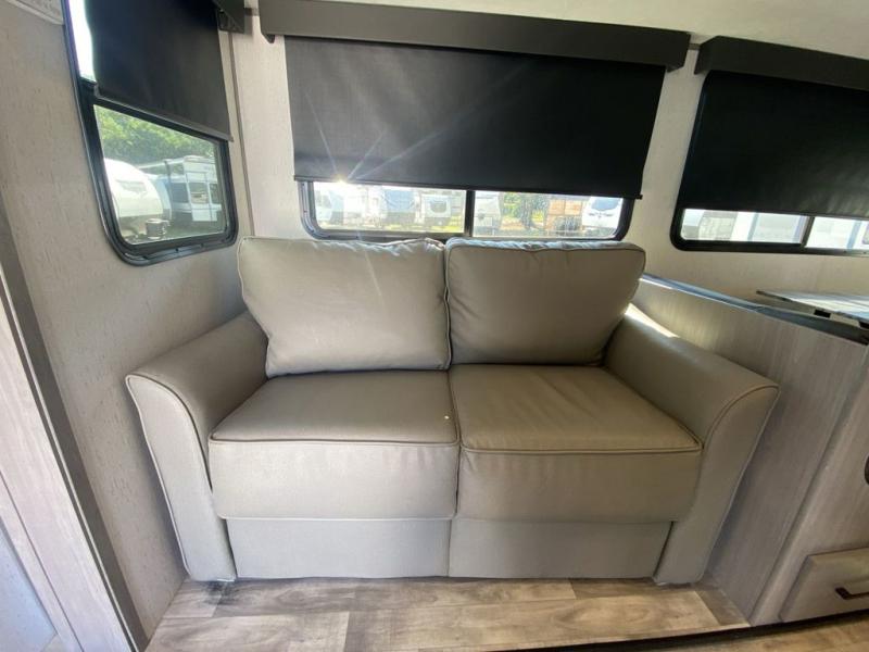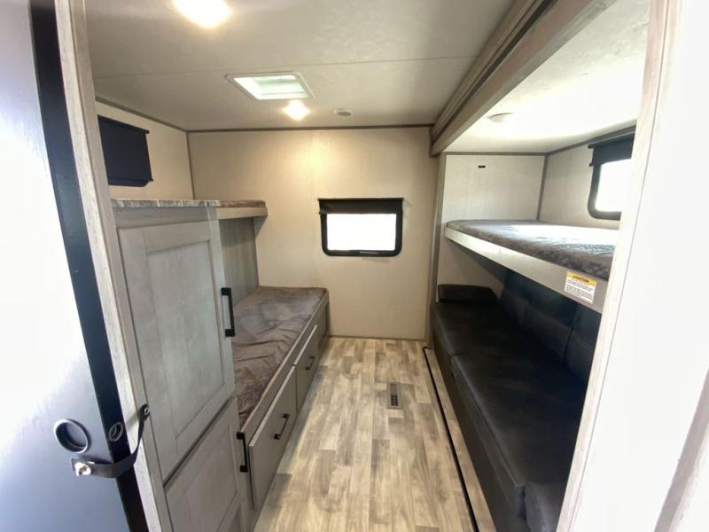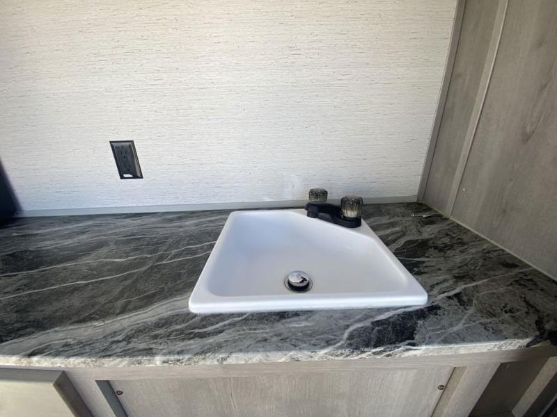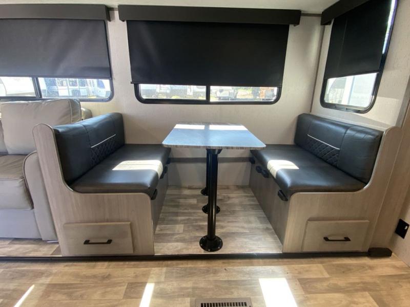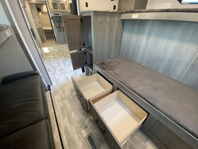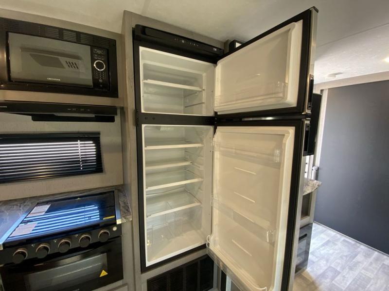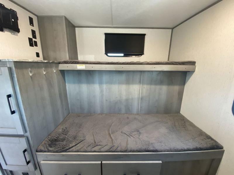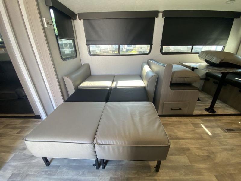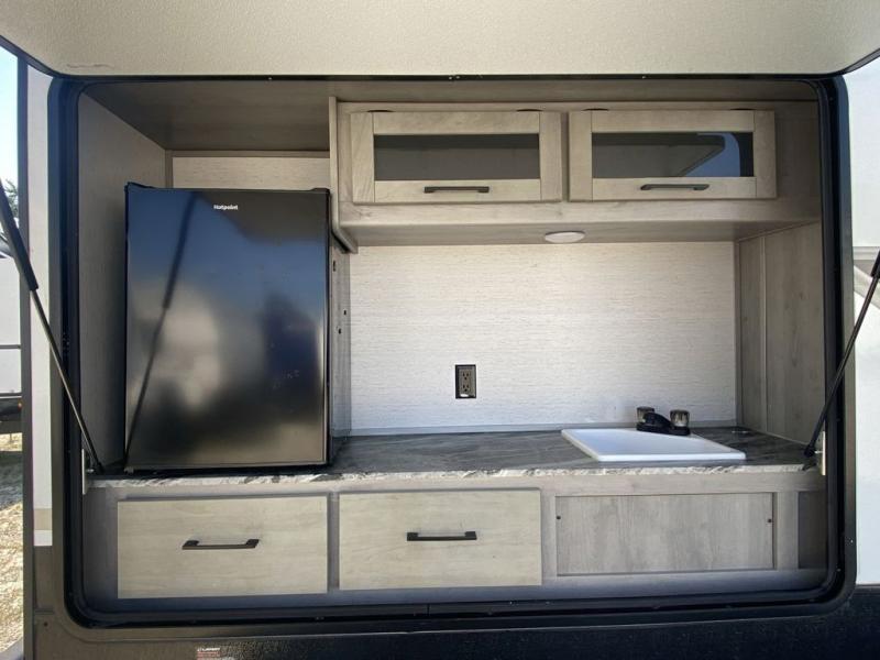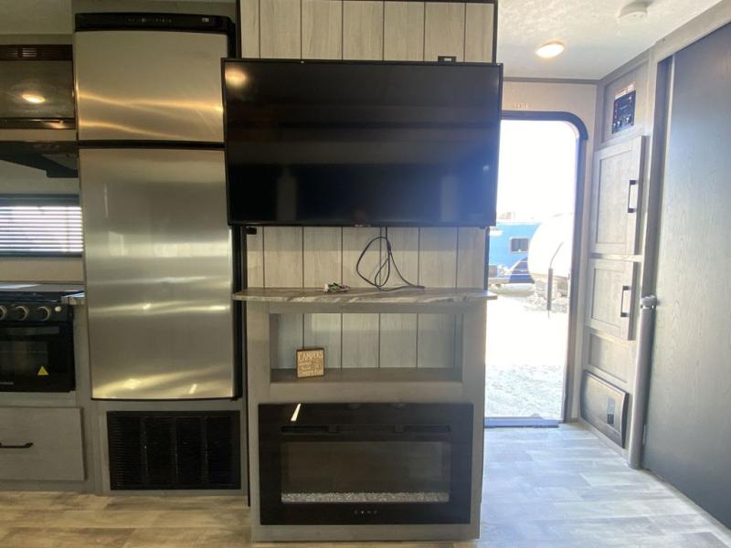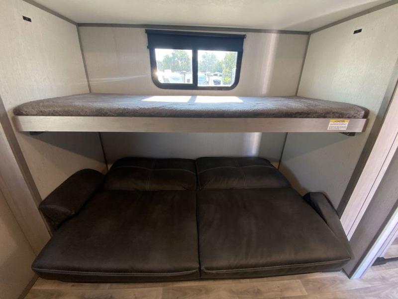 It will be so easy camping with friends in this spacious travel trailer with double slides and a rear private bunkhouse. Once you're set up at the campsite, prepare lunch on the outside kitchen and relax under the 18' power awning with LED lights. You may just decide to grab the fishing poles from the pass-through storage and head down to the river. Everyone can meet in the main living area around the U-shaped dinette or on the sofa, and the fireplace here will make it feel more like home.