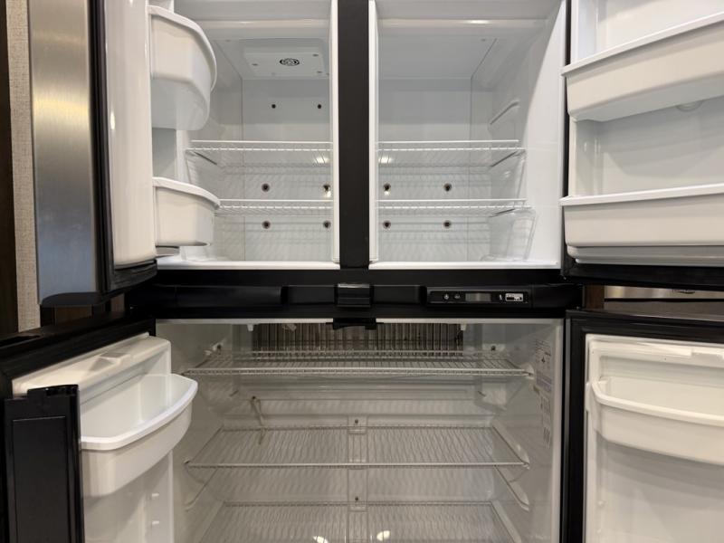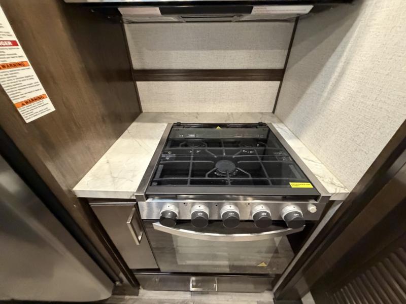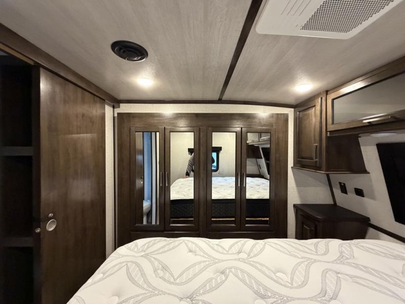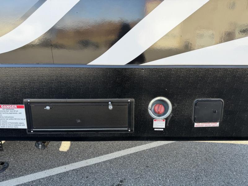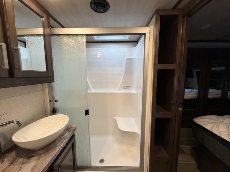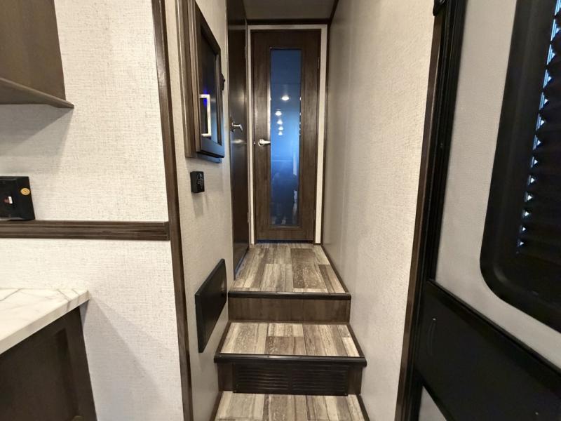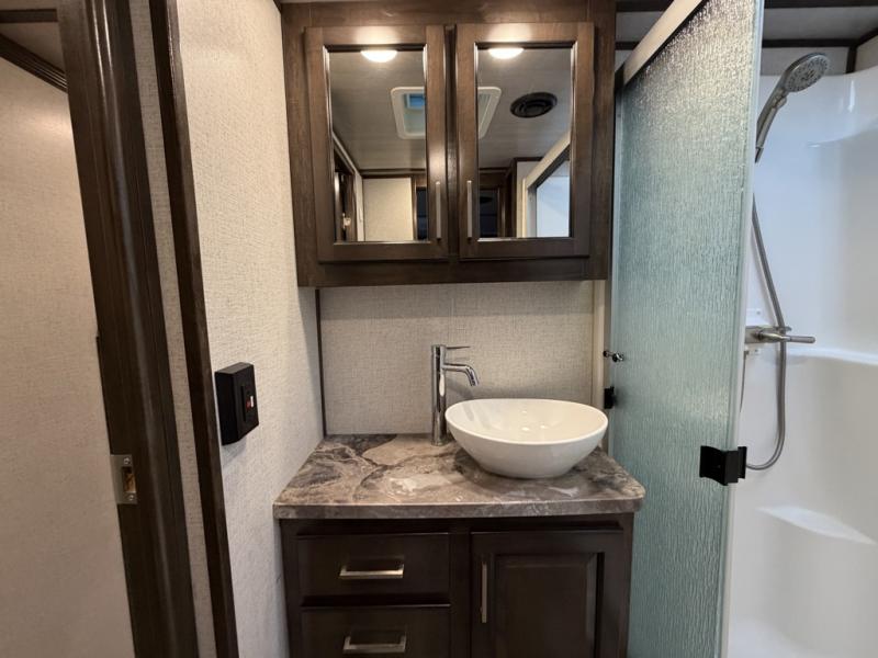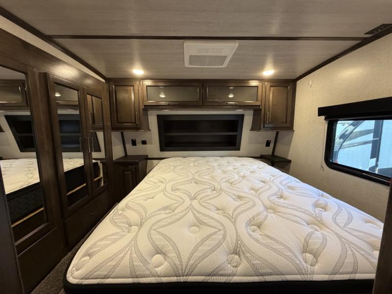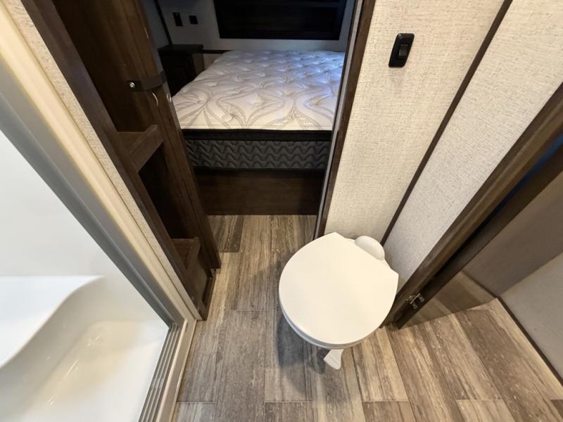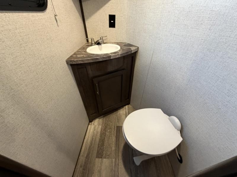 Camping with a larger group has never been easier than in this toy hauler with a 11' separate garage, sleeping space for nine, and dual entry doors. The large sofa in the living area can sit four people, and the island peninsula will allow the chef space to prep all the meals. The dual entry bath includes a shower with a seat for added comfort, and the front master bedroom has a slide out wardrobe and a king-size bed. Now, that's luxury!