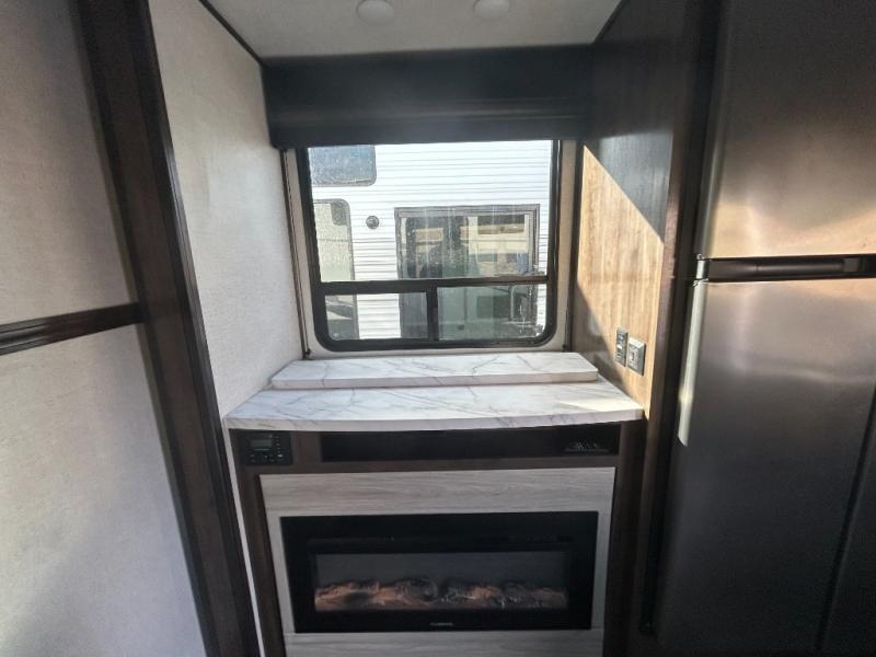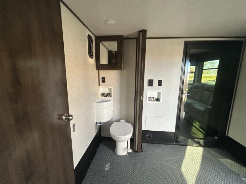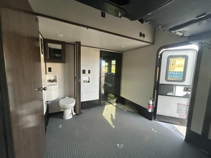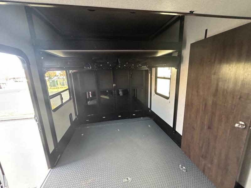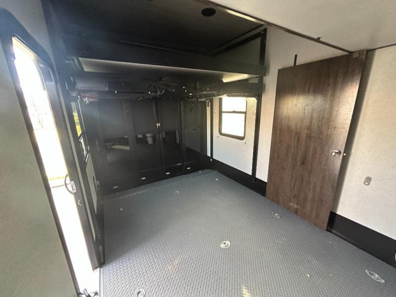 Head to the lake for unforgettable weekends riding the trails and kicking up some mud with this toy hauler in tow! Once you remove your toys from the 13' separate garage, you can set up the roll-over sofas that include a table in between them, and there is a convenient half bath here. Your guests can make this their bedroom at night, plus there is a Happi-Jack power bunk and a loft with a twin-size bed for the little ones! The main living area will be a favorite spot to hang since there are dual opposing slides for tons of space, an upgraded heat and massage sofa, plus a 50" TV with a fireplace below it for a more cozy feel. And check out the front private bedroom with a king-size bed and a slide out wardrobe to keep your clothes neat and tidy!