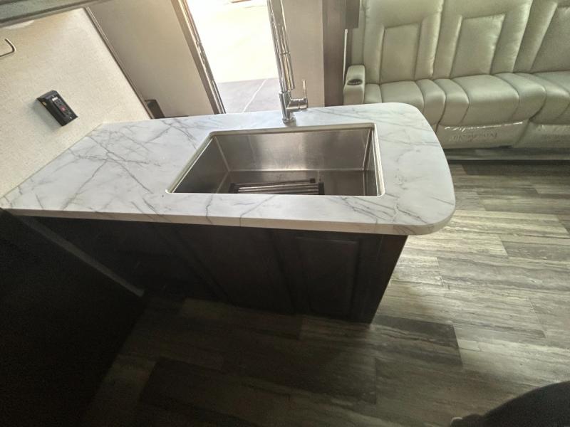 With any Voltage Triton toy hauler fifth wheel by Dutchmen you will appreciate the economical price point while still including many luxury features. The 7' slide boxes provide you with space to stretch out, plus there are oversized windows to let the sun through each morning. Some of the other interior comforts you are sure to love are the pleated night shades throughout the entire coach, the stainless steel kitchen sink, the upgraded heat and massage sofas, and more. Each model includes a 30" residential microwave, a 12 gallon water heater, plus two upgraded A/C's to keep you cool all summer long. The Triton garage is ready to house your favorite toys with 2,500 lb. tie-downs and a Tuff Ply floor, and you can add the optional ramp door patio system for more fun. You will also enjoy the two indoor/outdoor speakers, plus a pull down screen to keep the bugs out when you want to dine at the table.