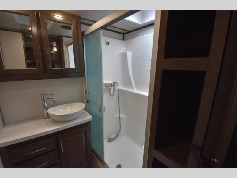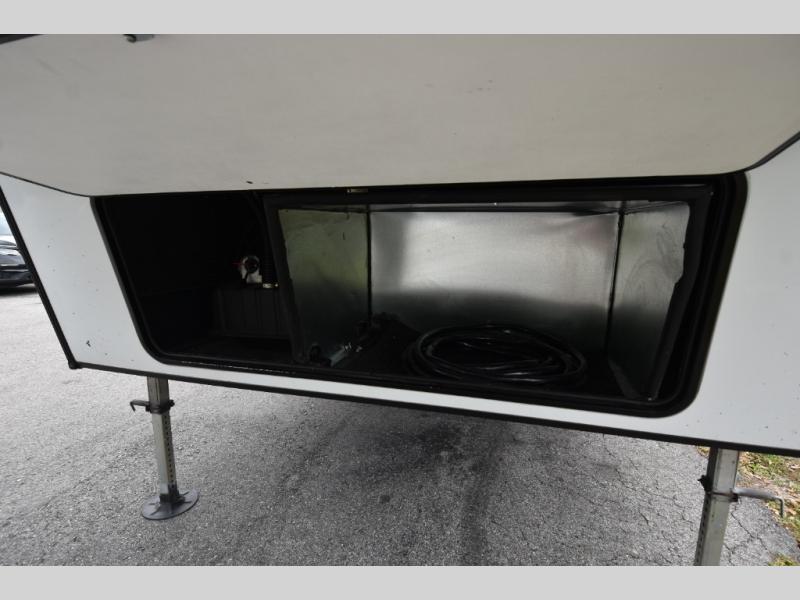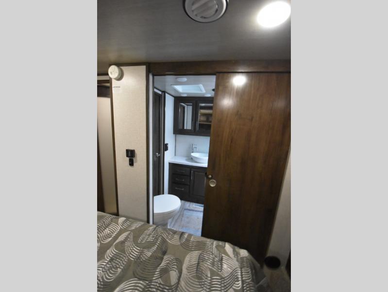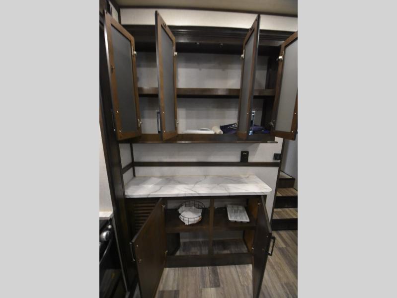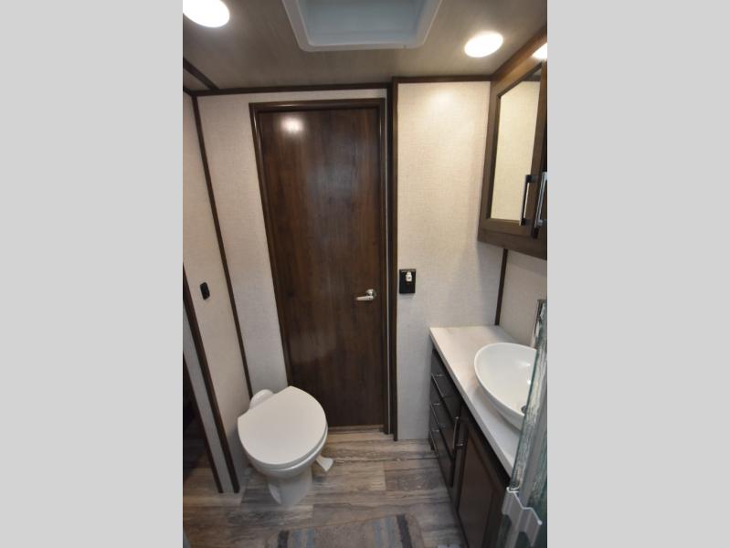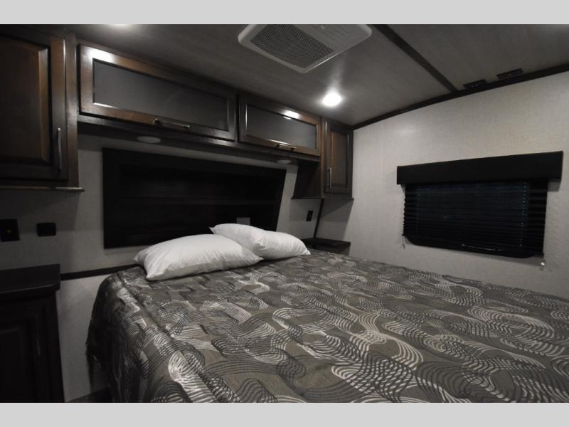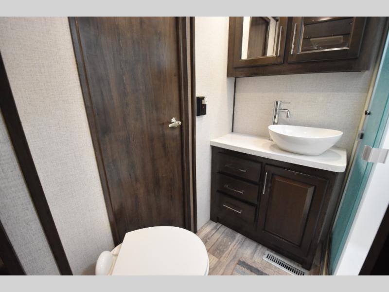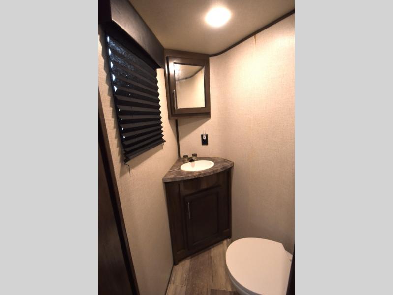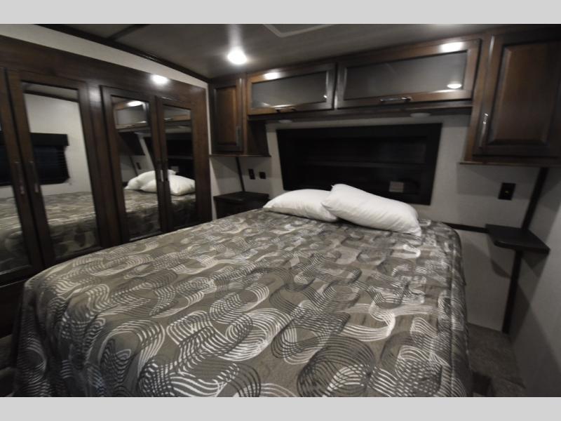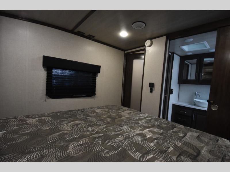 Camping with a larger group has never been easier than in this toy hauler with a 11' separate garage, sleeping space for nine, and dual entry doors. The large sofa in the living area can sit four people, and the island peninsula will allow the chef space to prep all the meals. The dual entry bath includes a shower with a seat for added comfort, and the front master bedroom has a slide out wardrobe and a king-size bed. Now, that's luxury!