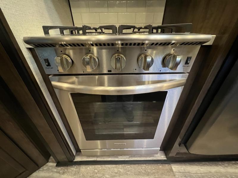 The Dutchmen Voltage toy hauler is an amazing RV that won't disappoint! These elegant units have more durability and luxury than you ever thought possible. They include an All Weather Package, 16" custom wheels, a gel-coat fiberglass exterior finish, MorRyde CRE 3000 suspension, Secure Stance entry steps, and a second fuel tank for a total of 60 gallons. There is a second power awning over the garage entry door, and you will even find a third awning above the ramp patio. The tinted frameless windows will protect you from outside prying eyes and harsh sunlight, and the interior solid-surface countertops in the kitchen will withstand many years of chopping and dicing. You'll also have a 12" diamond plate in the garage for protection, and there is an aluminum four-step entry that leads right into the garage.