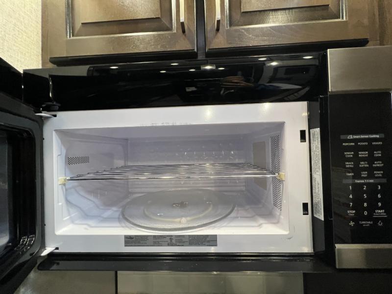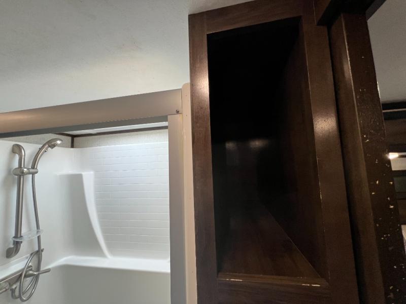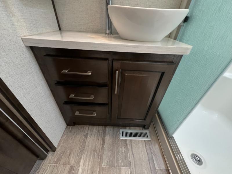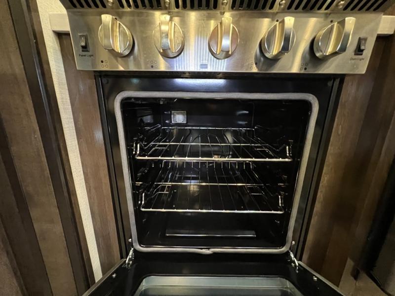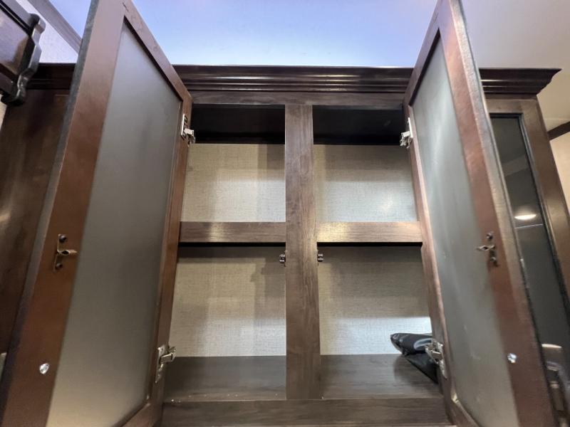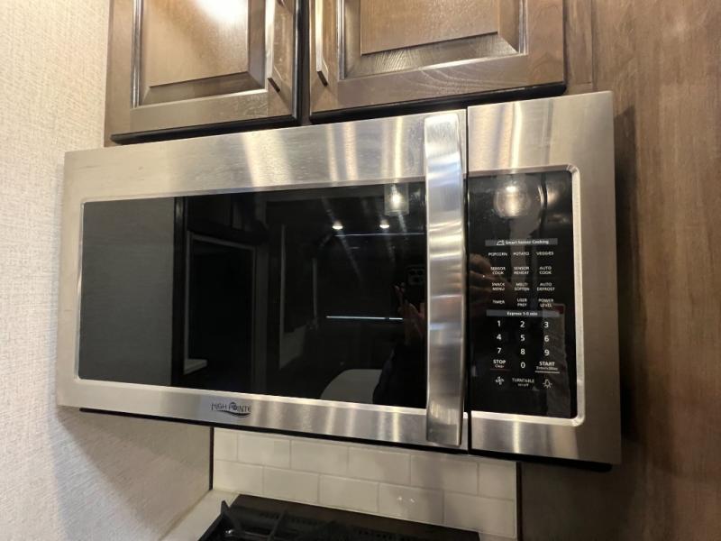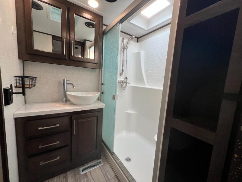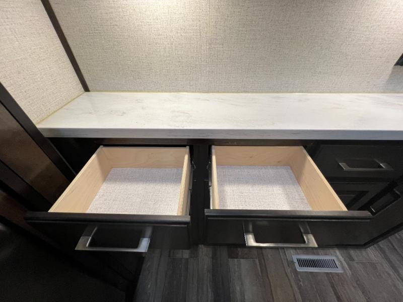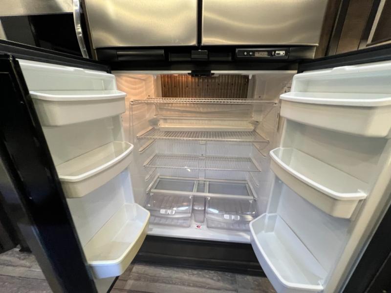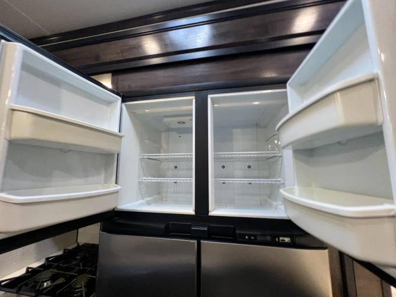 The full and half bathroom are what really add luxury to this Voltage toy hauler! Each bathroom is incorporated into a sleeping space, so you have a master suite up front and a guest suite in the garage. The main living area has opposing slides, so you won't get crowded as you work around the kitchen island, and the heated/massaging residential sofa sits right across from the kitchen and entertainment center. At any time throughout the day, you can reach into the 18-cubic foot refrigerator to grab a cold drink, and then you can head to the sofas with table top in between to sit down and enjoy that drink.