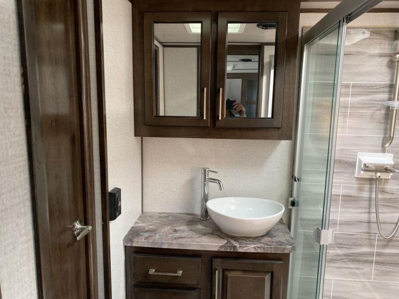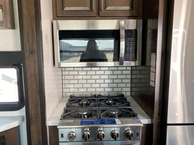 The full and half bathroom are what really add luxury to this Voltage toy hauler! Each bathroom is incorporated into a sleeping space, so you have a master suite up front and a guest suite in the garage. The main living area has opposing slides, so you won't get crowded as you work around the kitchen island, and the heated/massaging residential sofa sits right across from the kitchen and entertainment center. At any time throughout the day, you can reach into the 18-cubic foot refrigerator to grab a cold drink, and then you can head to the sofas with table top in between to sit down and enjoy that drink.