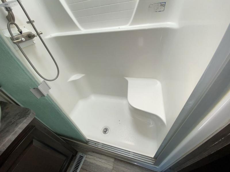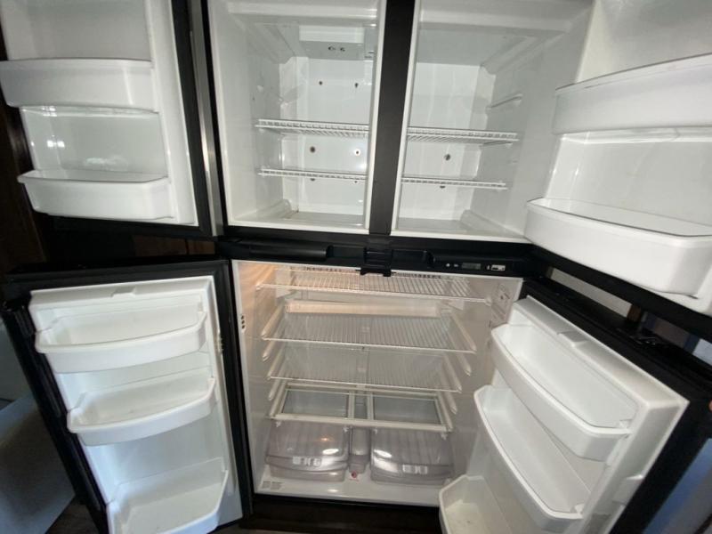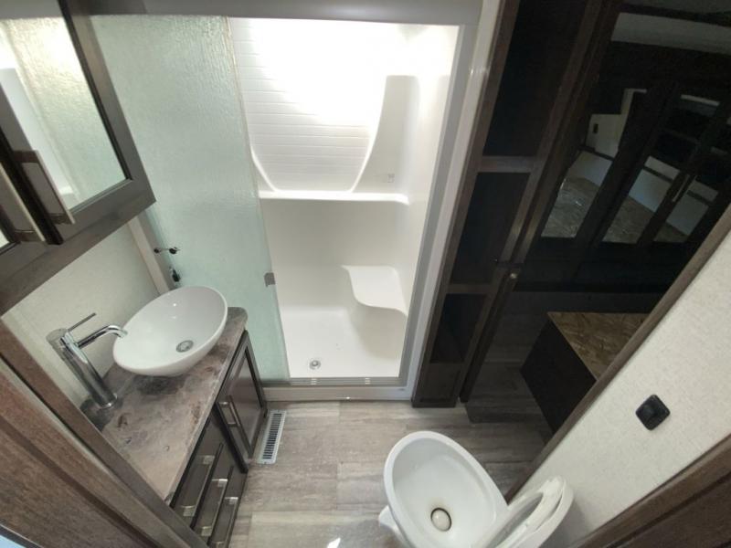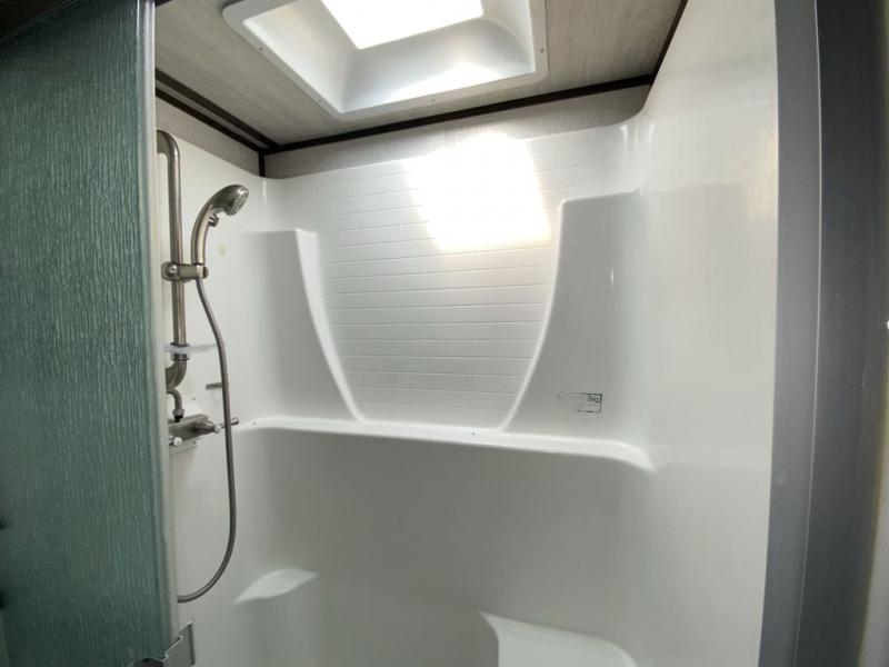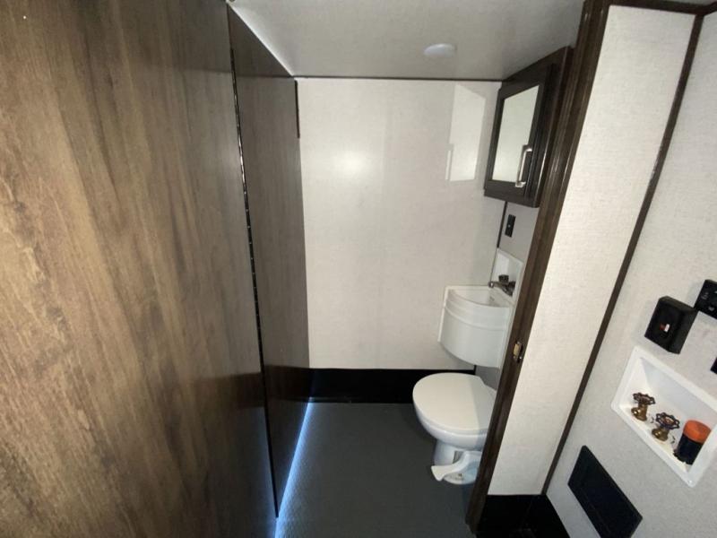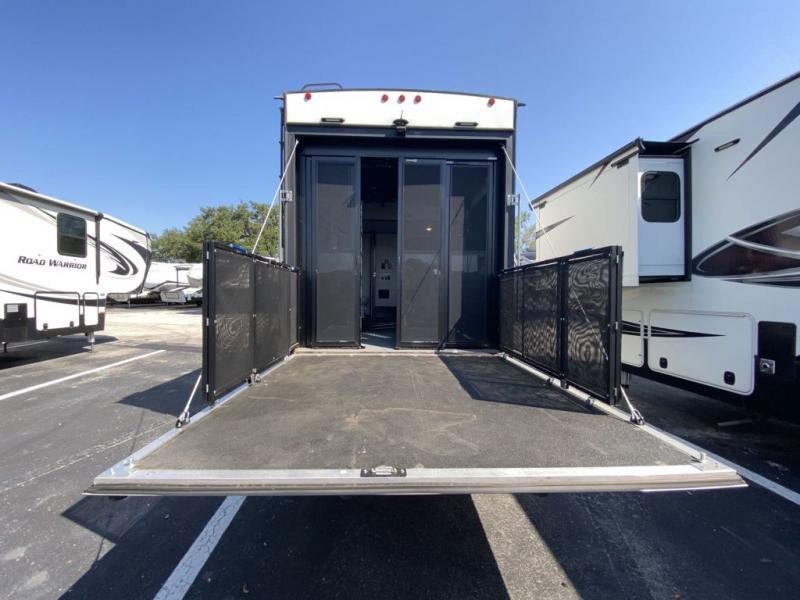 Wow! Check out this spacious toy hauler with a bath and a half, triple slides for added space, and sleeping space for up to ten if the living room sofas are used. The living area includes three sofas, plus a 50" TV to keep you busy on those rainy days. Head to the kitchen to prepare lunch at the U-shaped counter, and there is a three burner cooktop with a 21" oven if you want to bake a casserole for dinner. The 13' separate garage will be perfect to carry all your favorite ride-on toys, plus your guests can stay here since there is a Happi-Jack power bunk, two roll-over sofas, a loft, plus a half bath!