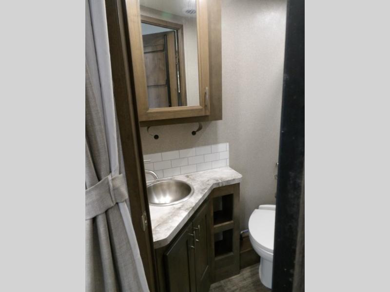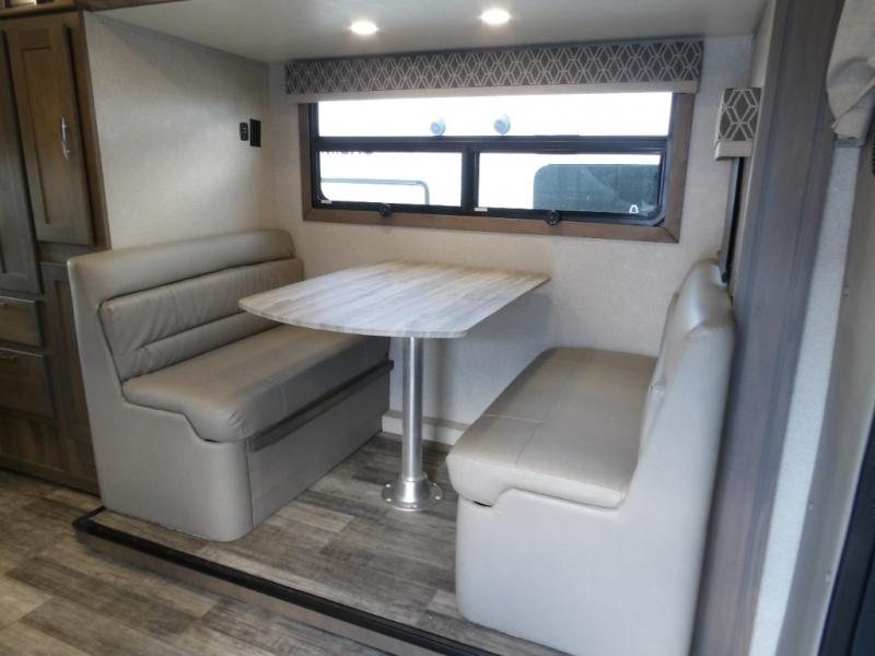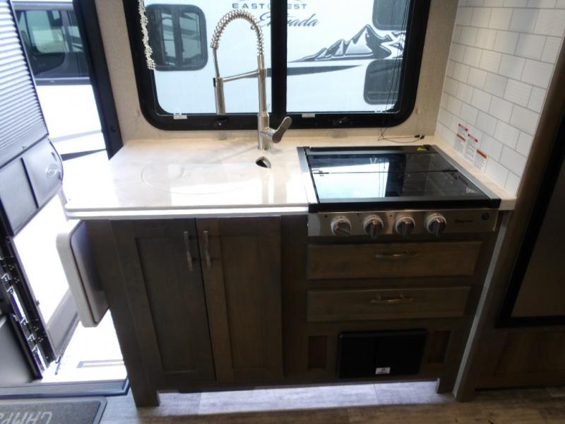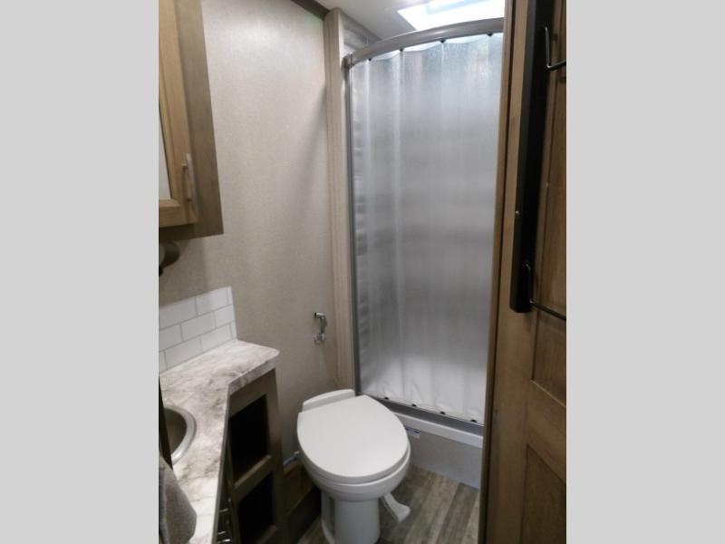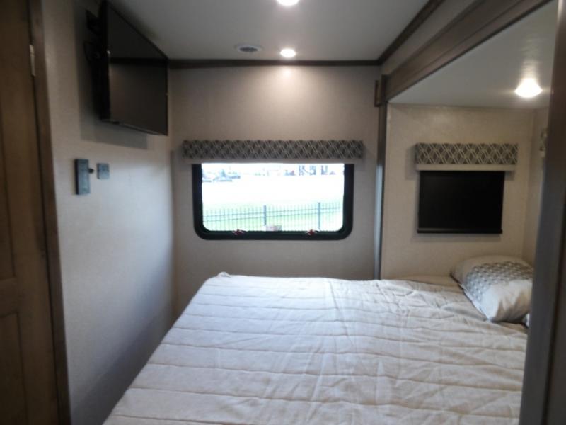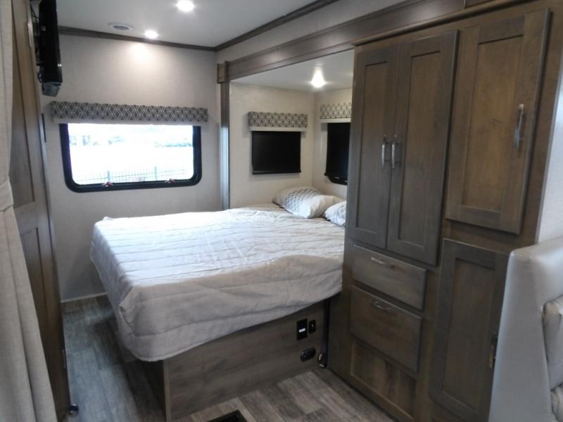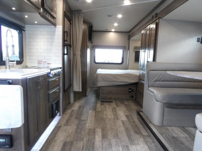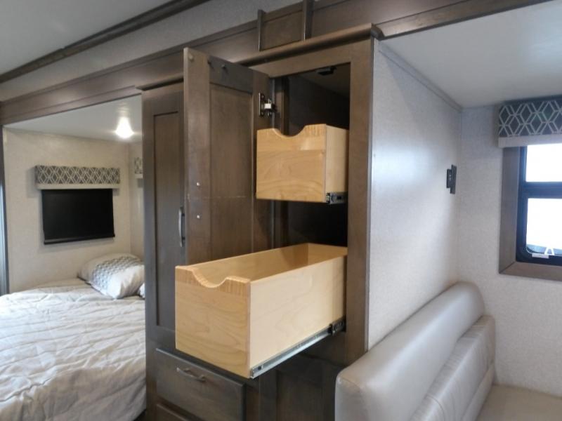 Take this motorhome on your greatest adventures yet! Start each morning feeling well rested after sleeping on the corner queen bed then head to the rear corner bathroom to freshen up in the shower with an Oxygenics body spa RV shower head and a skylight above for added headroom and natural lighting. Now that you're ready for the day, you can grab some eggs from the 6 cu. ft. double door refrigerator and fry them up on the three burner cooktop then enjoy them at the booth dinette. The kitchen also has a countertop extension for more meal prepping space and a convection microwave oven to pop a bag of popcorn before watching your favorite movies on either the living room 32" LED TV or the 32" LED smart TV across from the bed. You could even switch things up by replacing the booth dinette for either the optional tri-fold sofa with table or the optional three seat power recliner, and even add an optional cab over bunk too!