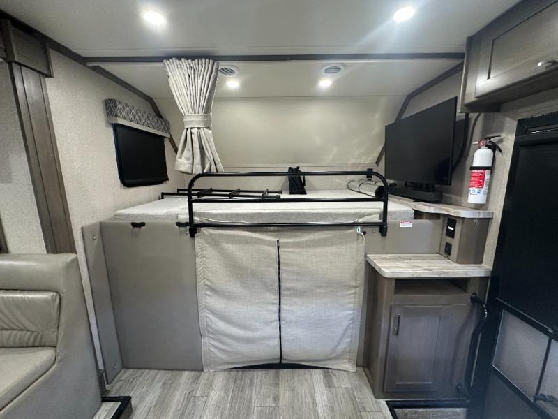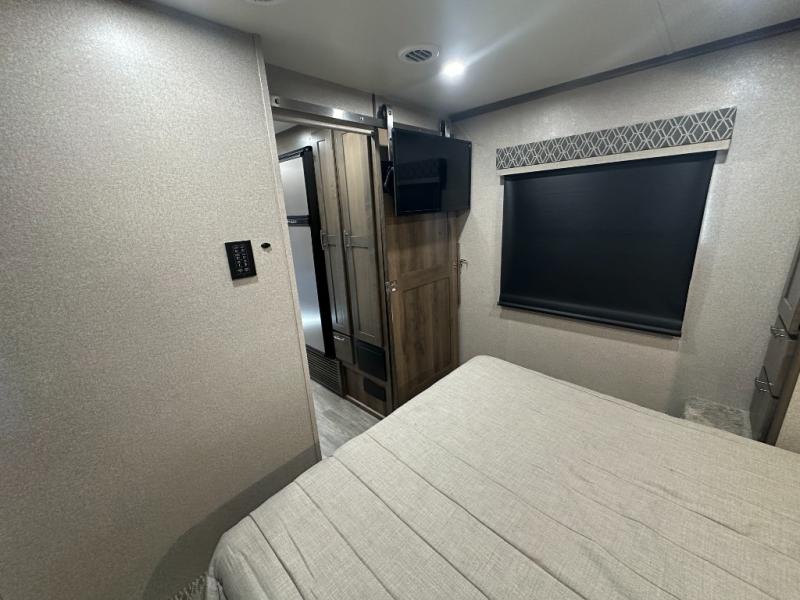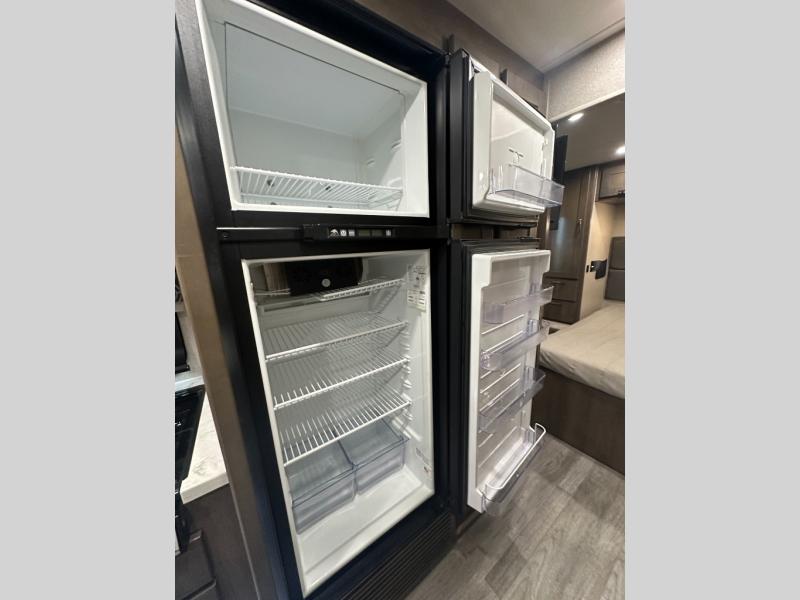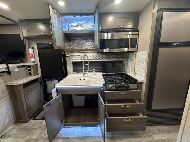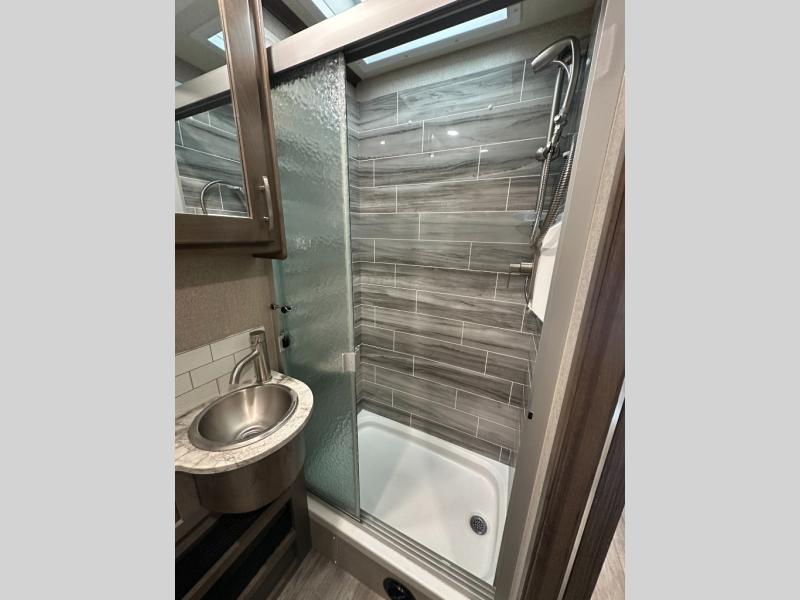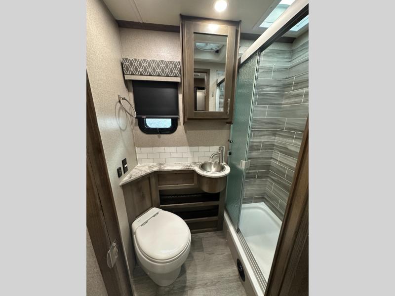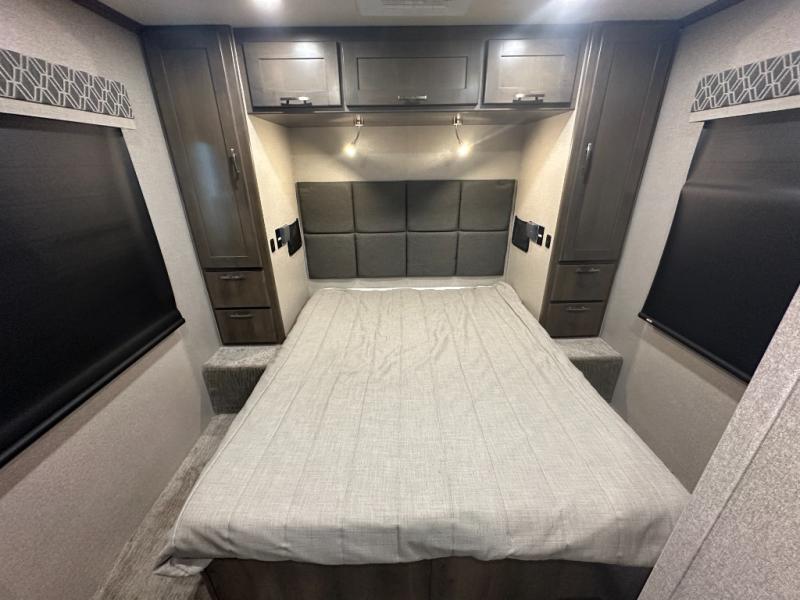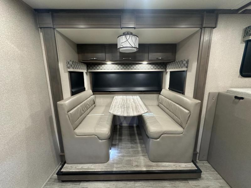 Pick a spot on the map and start traveling there in comfort with this motorhome! The rear private bedroom has a 60" x 75" gel-infused memory foam mattress for a good night's rest, LED reading lights, USB charging ports to charge your electronics while you recharge, and a 32" LED smart TV to watch movies in true comfort. The full bathroom has a designer shower with a skylight above for added head room and natural lighting and an Oxygenics body spa RV shower head for an even better showering experience on the road. The kitchen has everything you could need to prepare delicious home cooked meals including a countertop extension for more meal prepping space, and you can enjoy all of your meals at the booth dinette slide which can also transform into an extra sleeping space!