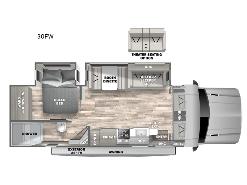 You will have plenty of space to walk about this motorhome with the dual slides! The booth dinette and sofa slide create an open concept living area and the sofa can be replaced for the optional theater seating if you prefer that instead. Freshen up after a long day of traveling in the rear corner bathroom with the designer shower that has a skylight above for more natural lighting and an Oxygenics body spa RV shower head for a more relaxing shower. Put on your comfy clothes stored in the wardrobe in the rear corner private bedroom then either lay on the 60" x 75" gel-infused memory foam mattress while you watch a movie on the 32" LED smart TV or head to the kitchen and whip up a meal with the three burner gas range and countertop extension. You could even head outside and watch a movie on the exterior 32" TV underneath the 16' dual-pitch armless awning!