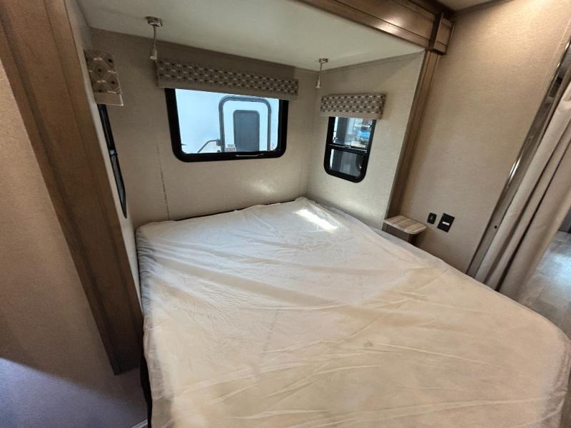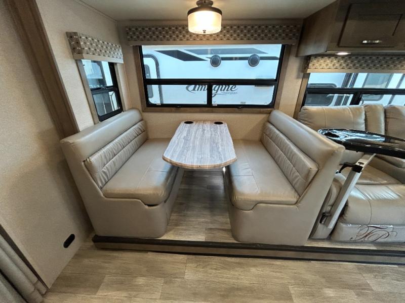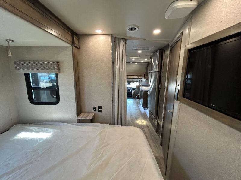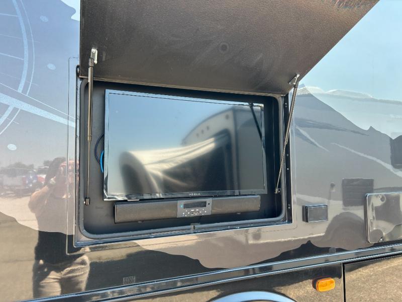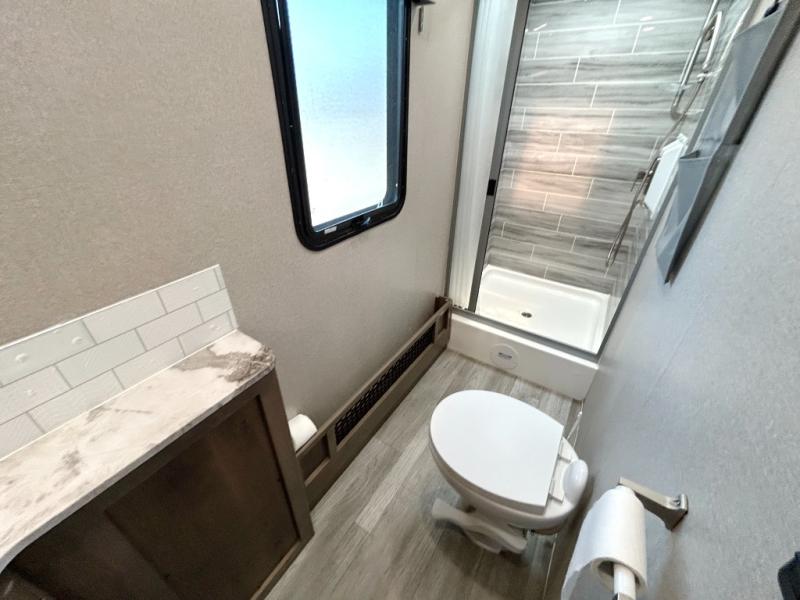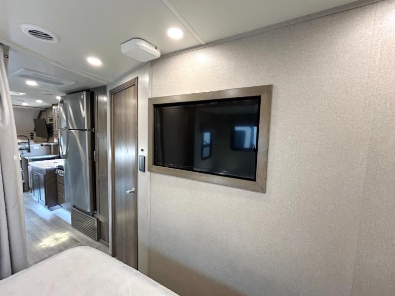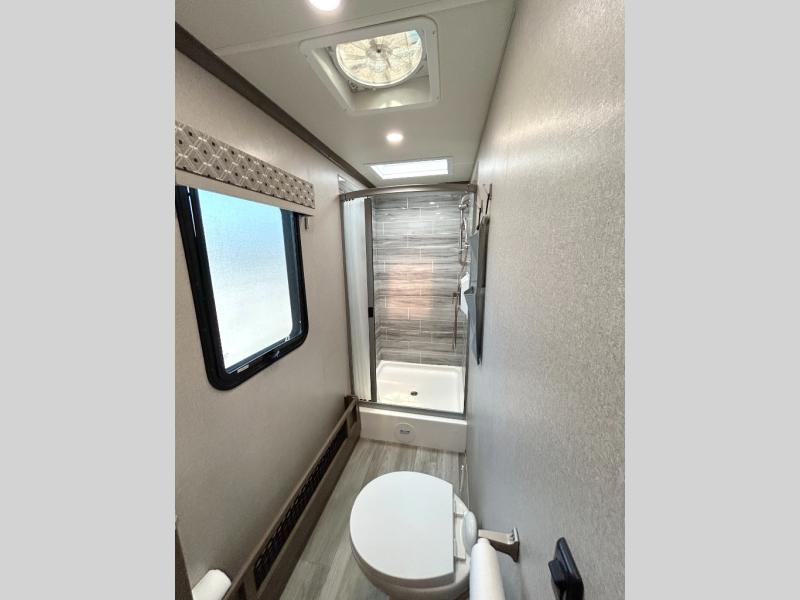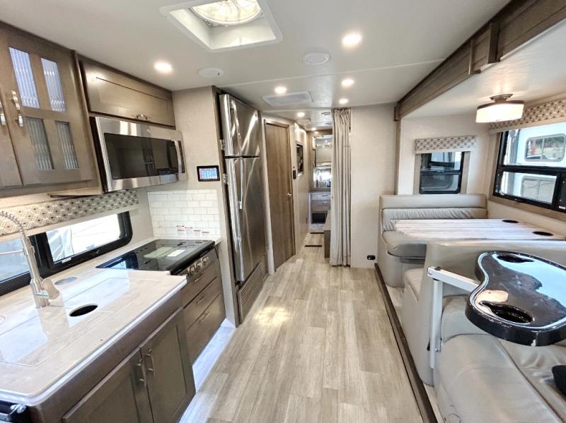 You will have plenty of space to walk about this motorhome with the dual slides! The booth dinette and sofa slide create an open concept living area and the sofa can be replaced for the optional theater seating if you prefer that instead. Freshen up after a long day of traveling in the rear corner bathroom with the designer shower that has a skylight above for more natural lighting and an Oxygenics body spa RV shower head for a more relaxing shower. Put on your comfy clothes stored in the wardrobe in the rear corner private bedroom then either lay on the 60" x 75" gel-infused memory foam mattress while you watch a movie on the 32" LED smart TV or head to the kitchen and whip up a meal with the three burner gas range and countertop extension. You could even head outside and watch a movie on the exterior 32" TV underneath the 16' dual-pitch armless awning!