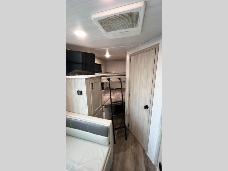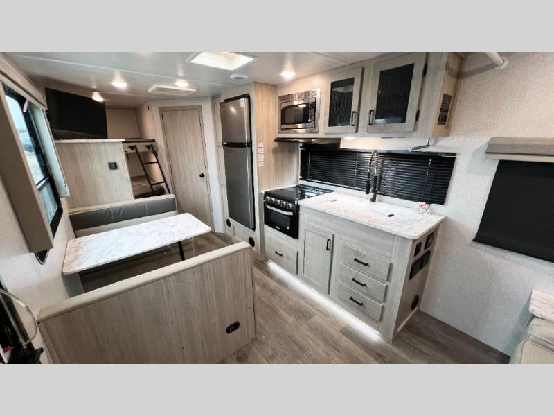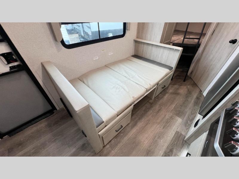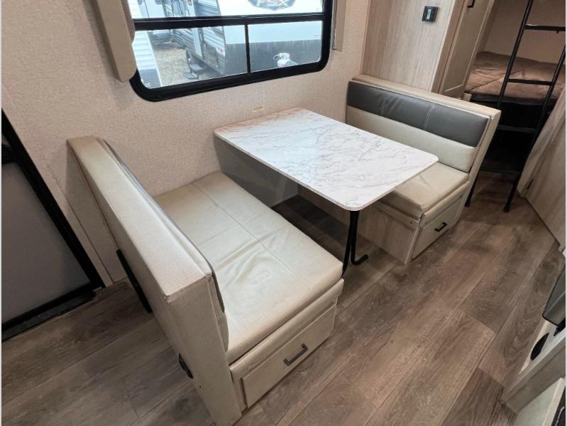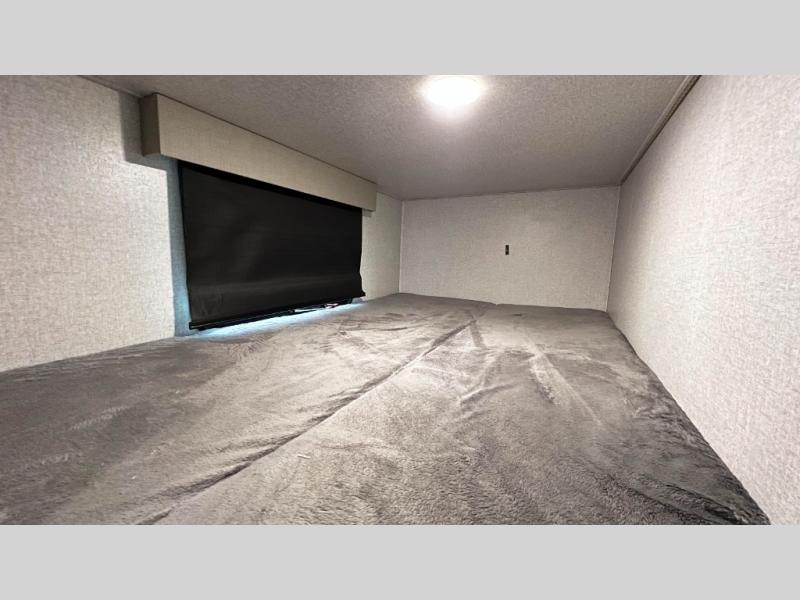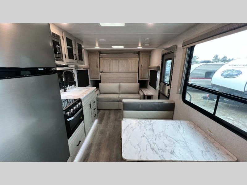 Pack up the family or make it a friends trip in this roomy travel trailer. Once you arrive at the campground, unload the pass-through storage, set up the 18' power awning with LED lights, and start lunch on the pull-out grill. You'll find a three burner cooktop and microwave oven indoors if the weather isn't cooperating, and you can dine at the booth dinette that includes under-dinette storage. You will love the versatility the queen Murphy bed adds by allowing you to relax on the sofa during they day, and sleep on the bed at night. And don't overlook the double-size bunks that will be a big hit with the little ones!