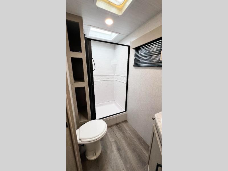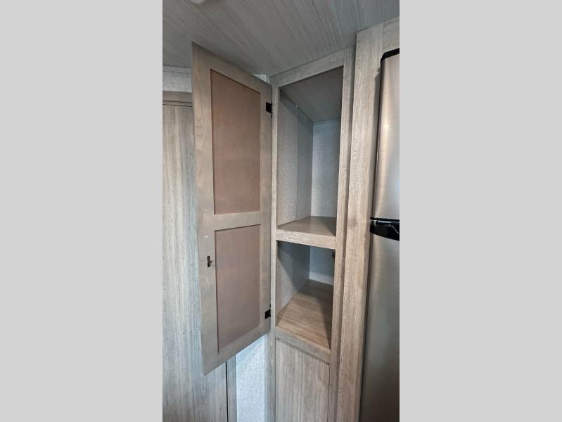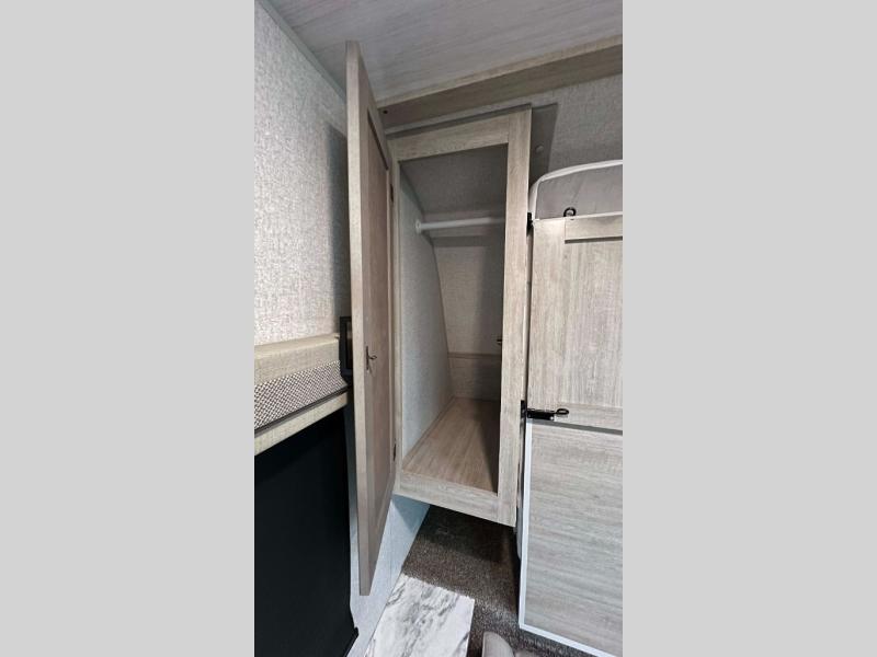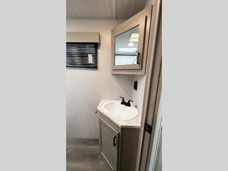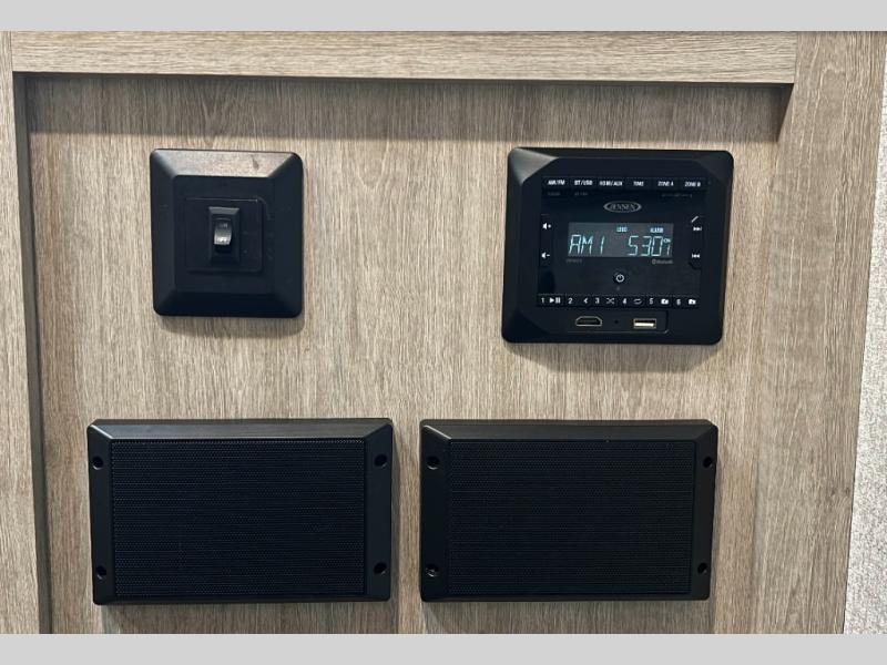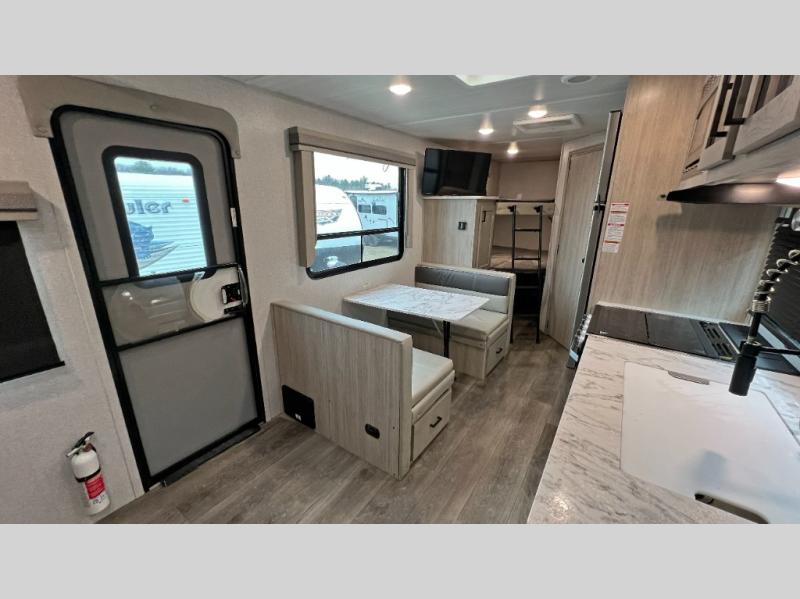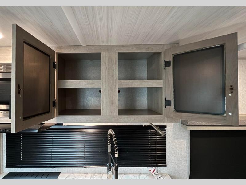 Pack up the family or make it a friends trip in this roomy travel trailer. Once you arrive at the campground, unload the pass-through storage, set up the 18' power awning with LED lights, and start lunch on the pull-out grill. You'll find a three burner cooktop and microwave oven indoors if the weather isn't cooperating, and you can dine at the booth dinette that includes under-dinette storage. You will love the versatility the queen Murphy bed adds by allowing you to relax on the sofa during they day, and sleep on the bed at night. And don't overlook the double-size bunks that will be a big hit with the little ones!