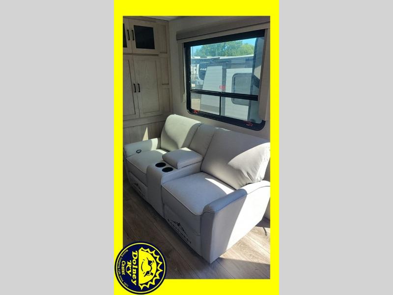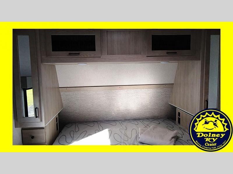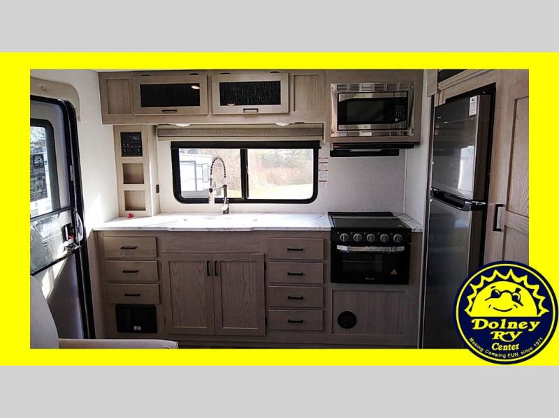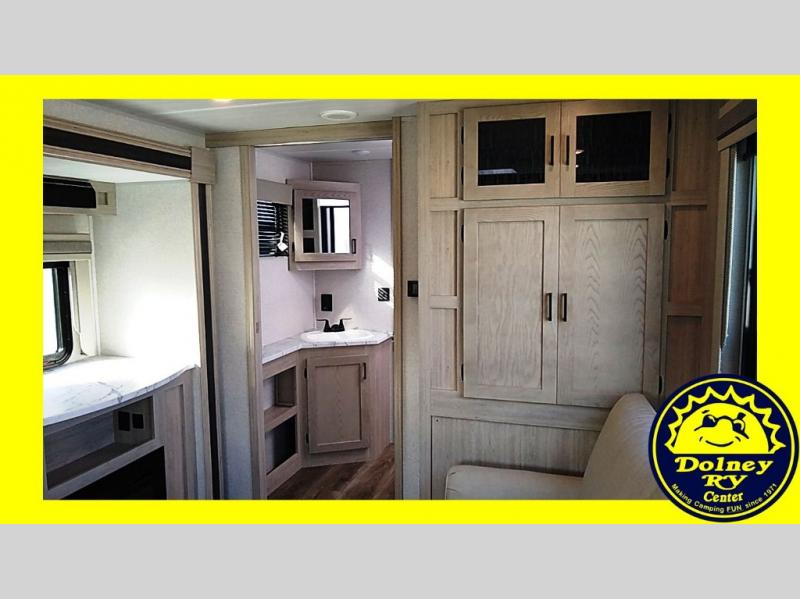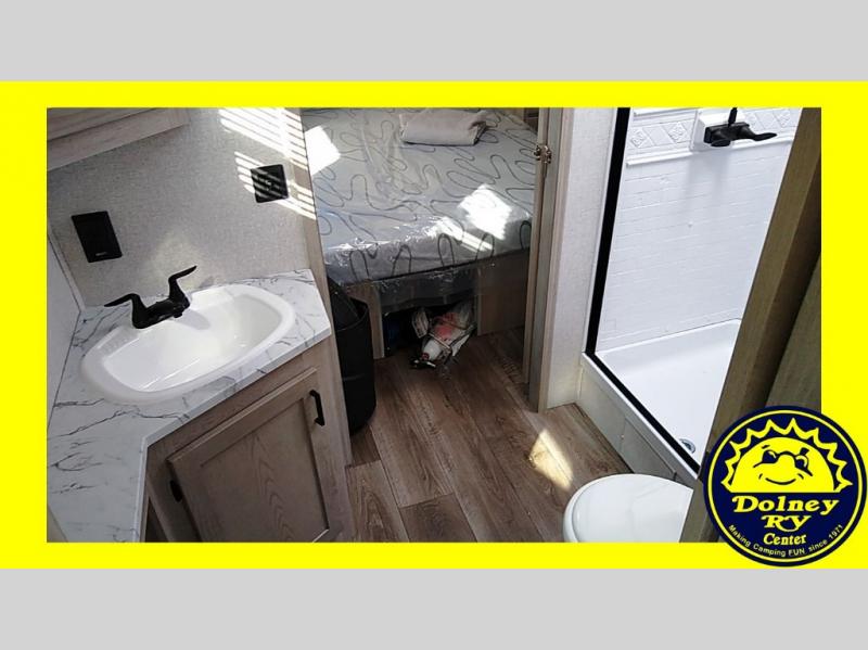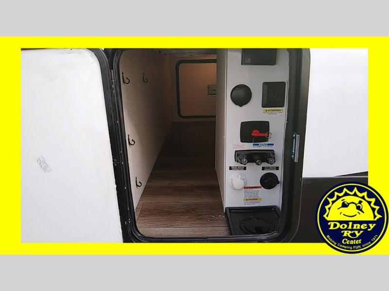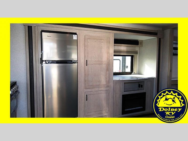 You're going to love this rear kitchen travel trailer with dual entry doors and a king bed in the front master bedroom! The booth dinette can be optioned out for a tri-fold sofa or optional theater seats, plus there is a telescoping 40" TV with a fireplace for a more at-home feel. The walk-through bath will be easy for everyone to access, and there is a shower skylight here to let more natural light in. This model is also pet-friendly thanks to the pet dish under the refrigerator and the outside spray port to hose them off after a day in the river!