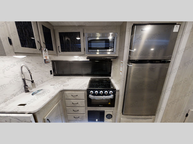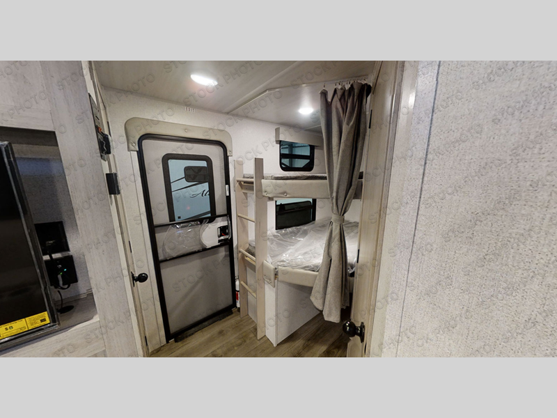 This is the ultimate family-friendly travel trailer thanks to the double-size bunks with bike storage in the back. A king king bed in the front bedroom will make you feel right at home, plus there are dual wardrobes and dual nightstands for your things. The large slide out in the main living area won't leaving you feeling confined, and the tri-fold sofa and booth dinette will provide comfortable seating space. The chef of your group can start lunch on the outside kitchen while the kids grab their scooters from the pass-through storage. And don't forget there is a universal docking station to quickly access your utilities when needed.