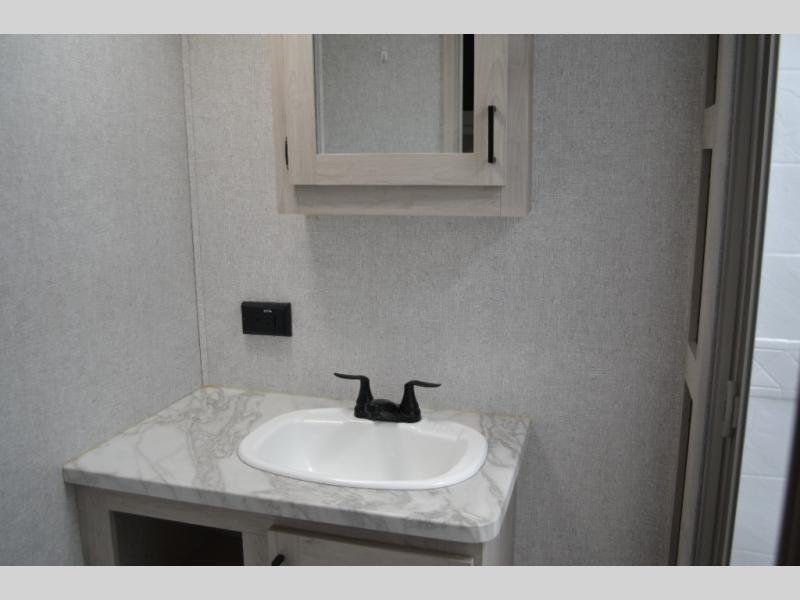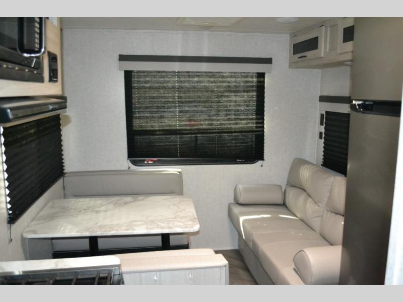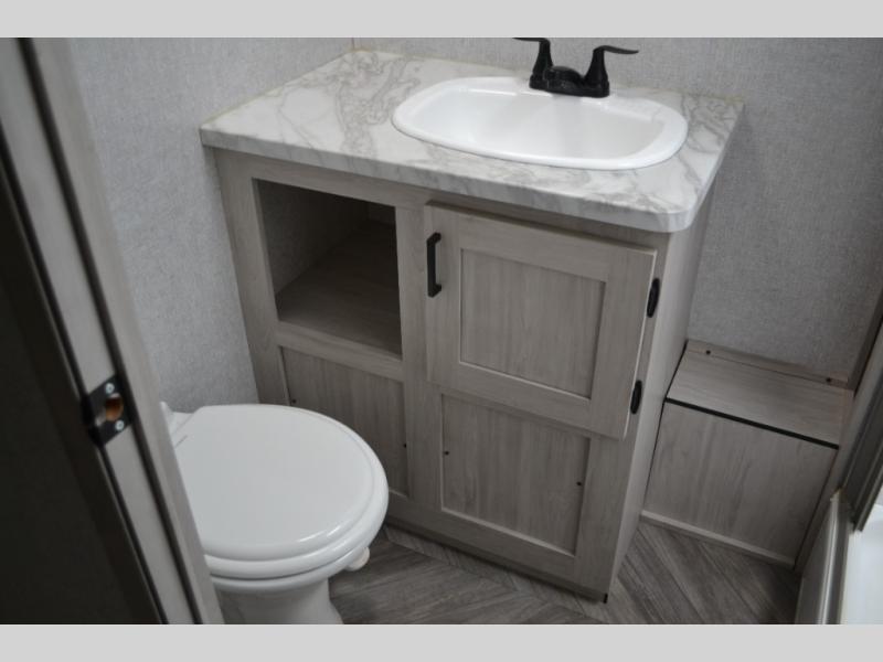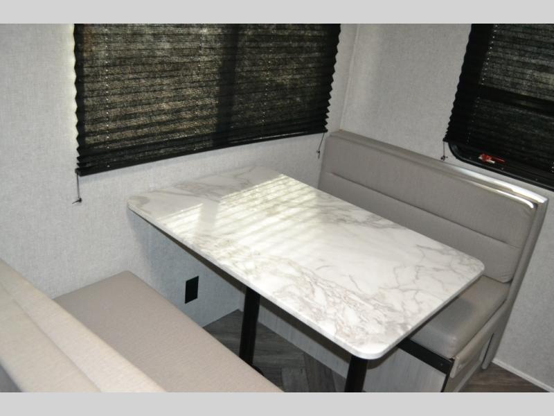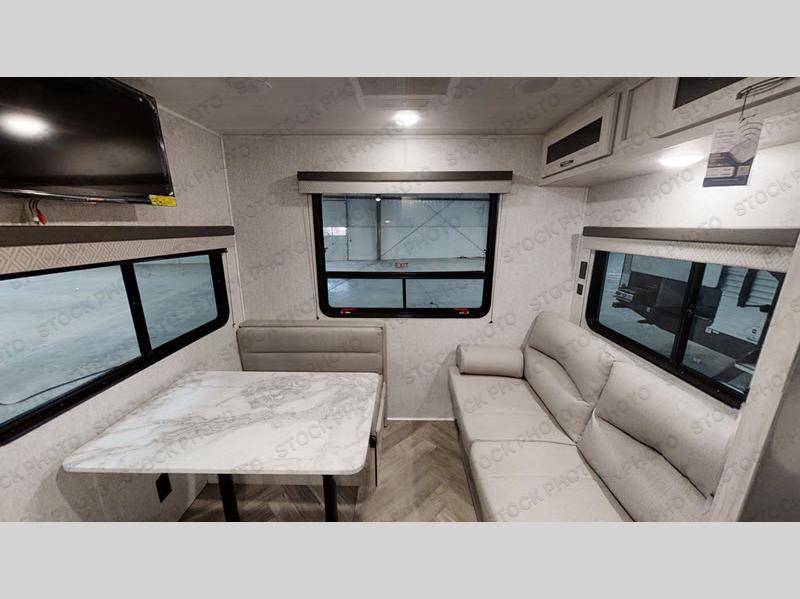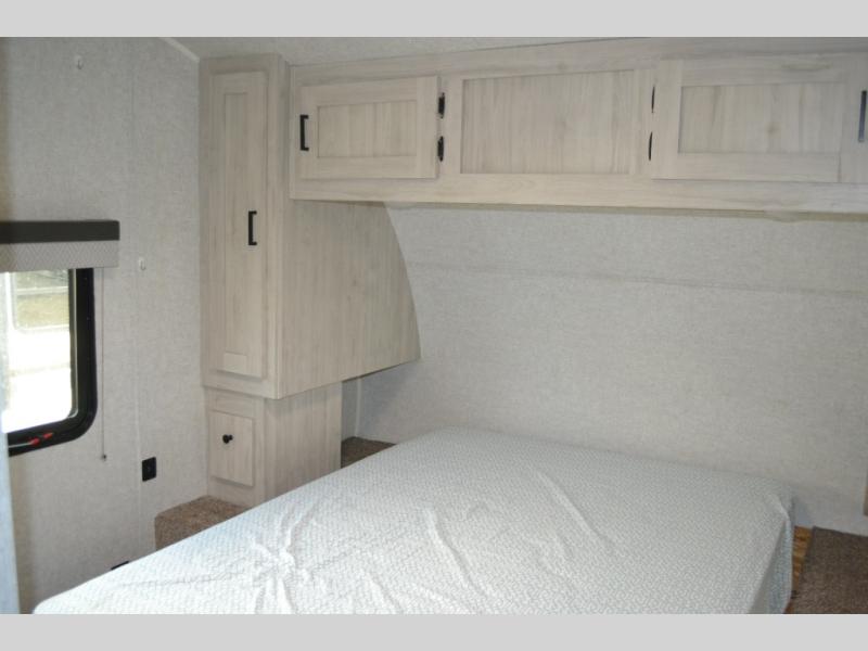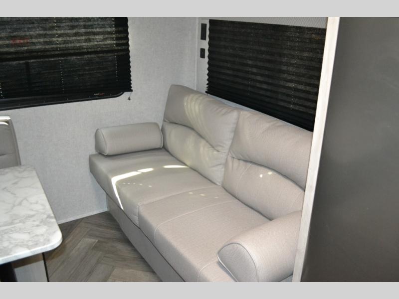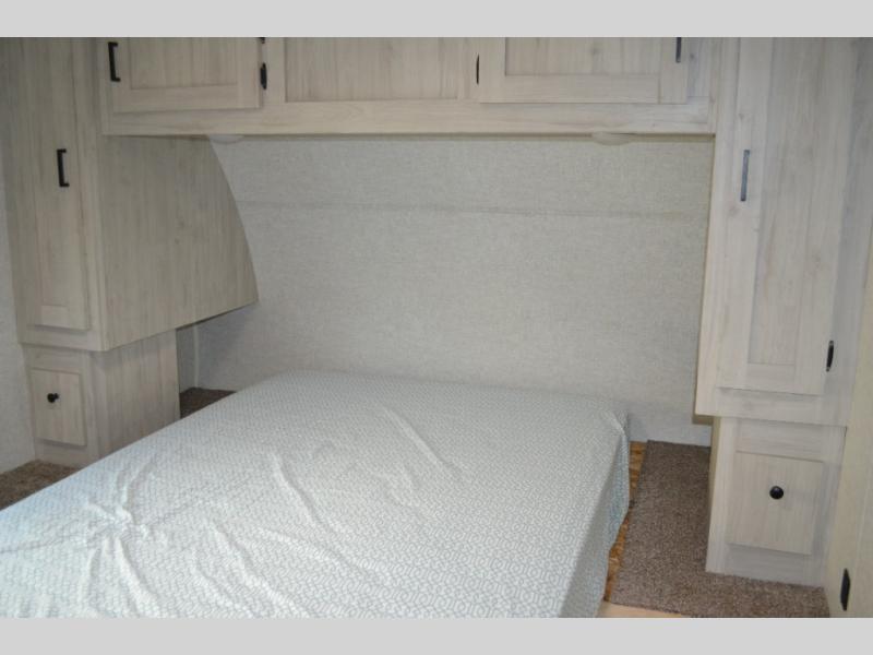 When you enjoy camping, this trailer will never let you forget it! First, you will be able to sleep like a king up front with access to the dual wardrobes to call a side your own, and there is storage underneath the bed for blankets and such, to the full bathroom that allows you to get cleaned up without having to use the campsite restrooms. There are full kitchen amenities to make hot meals including a pantry to store your dry goods and snacks and overhead cabinets for your dishes, plus you can eat at the booth dinette or while relaxing on the jack knife sofa, both also include storage underneath.