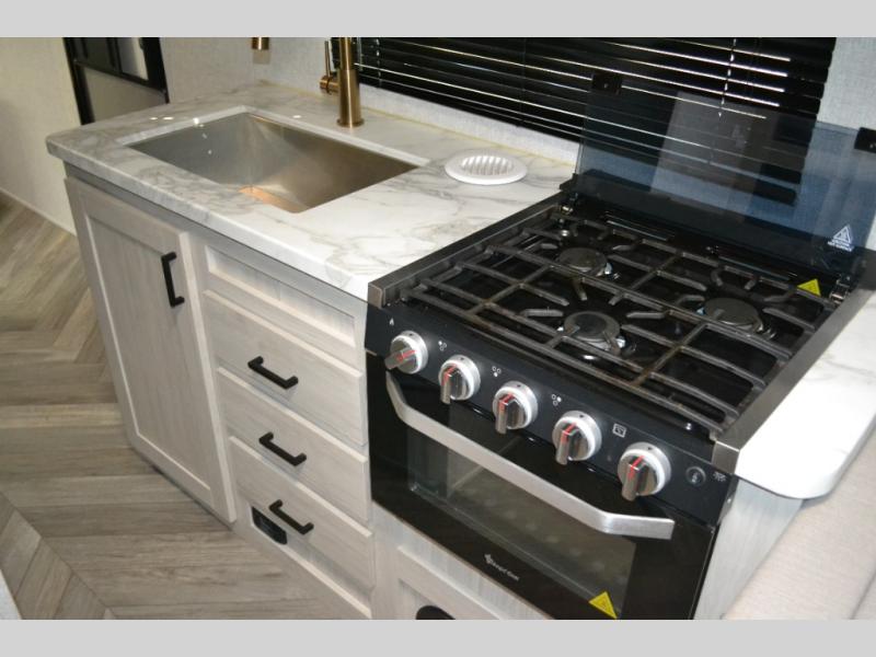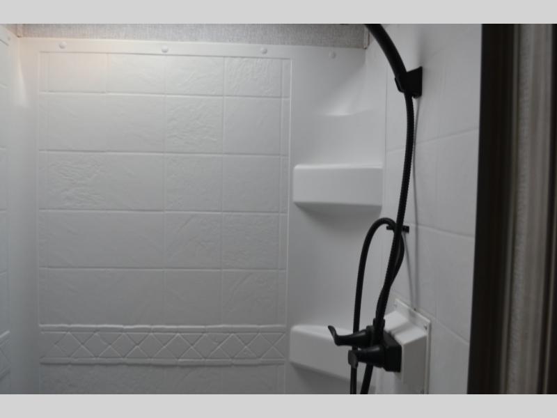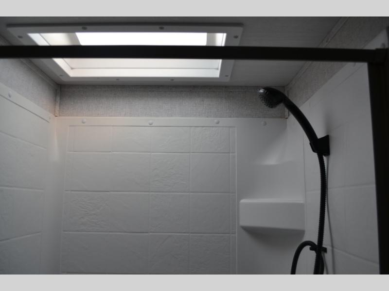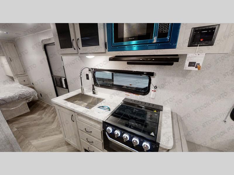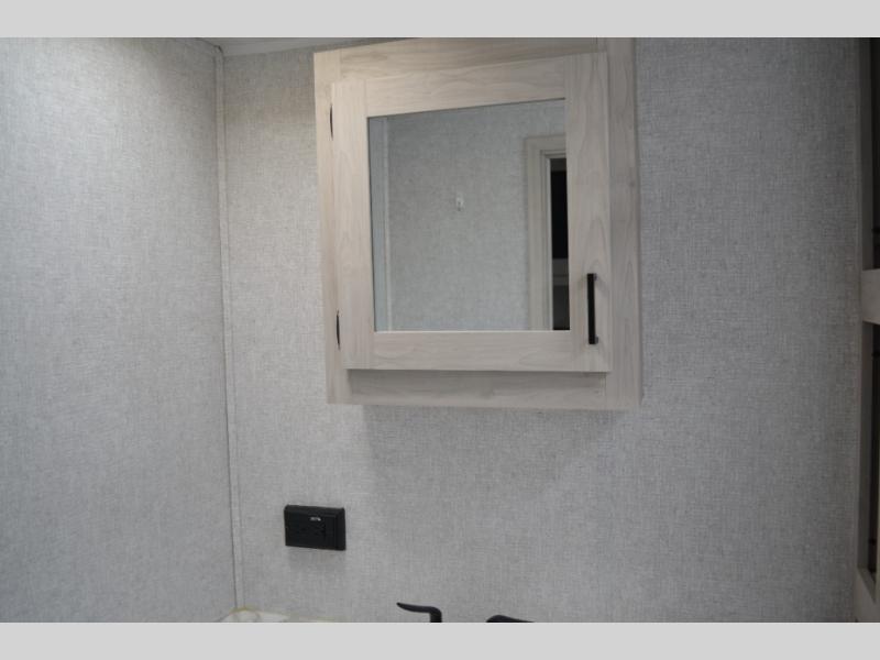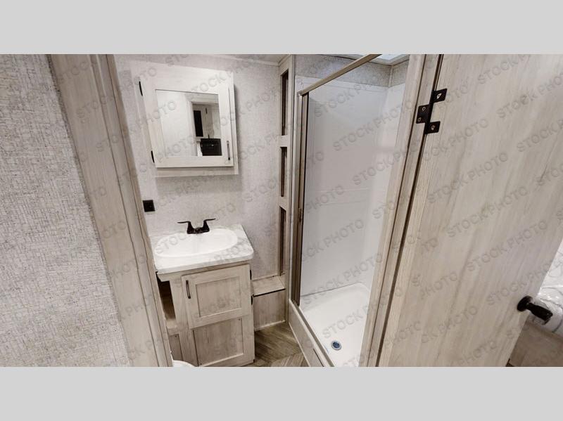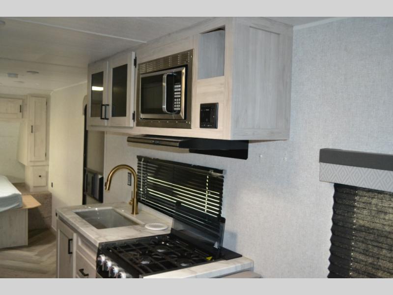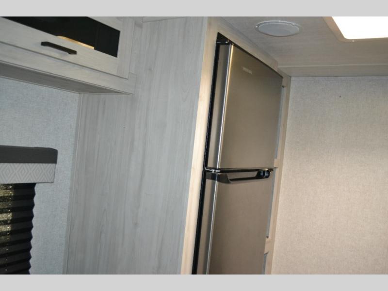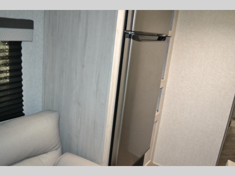 When you enjoy camping, this trailer will never let you forget it! First, you will be able to sleep like a king up front with access to the dual wardrobes to call a side your own, and there is storage underneath the bed for blankets and such, to the full bathroom that allows you to get cleaned up without having to use the campsite restrooms. There are full kitchen amenities to make hot meals including a pantry to store your dry goods and snacks and overhead cabinets for your dishes, plus you can eat at the booth dinette or while relaxing on the jack knife sofa, both also include storage underneath.