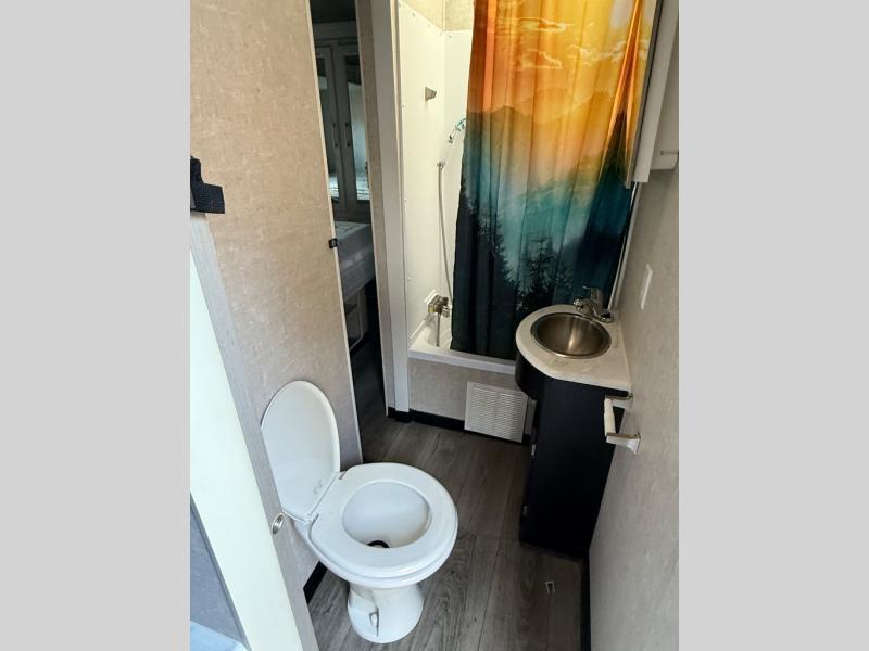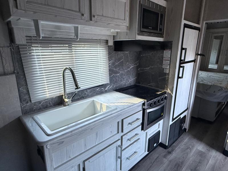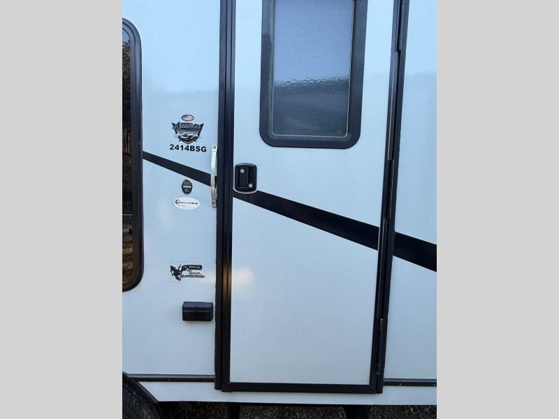 Start camping the right way with this toy hauler! Once you unload by unhooking the 2,500 lb. tie downs and using the 7' ramp door, relax on the opposing sofas in the garage before heading out. This area will also be great for overnight guests and if you need additional sleeping space, just choose the optional drop-down electric bed. Your crew will be hungry after riding all day, so whip up a hearty meal on the cooktop or throw some burritos in the microwave oven. Everyone can get freshened up in the dual entry bath which leads directly into the front corner private bedroom where there is a king bed slide for a great night's rest. Plus there are wardrobes to keep your clothes looking their best. This same layout is also available with corrugated thermal gray siding with fiberglass front cap when you select model 2414BS.