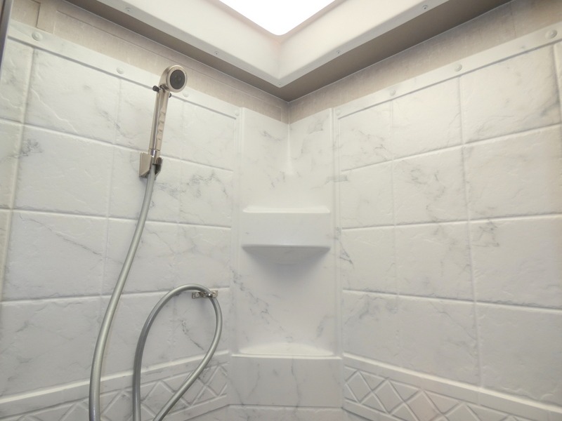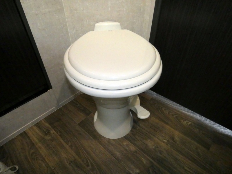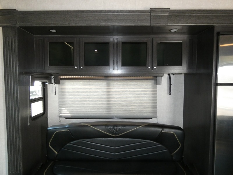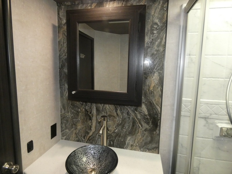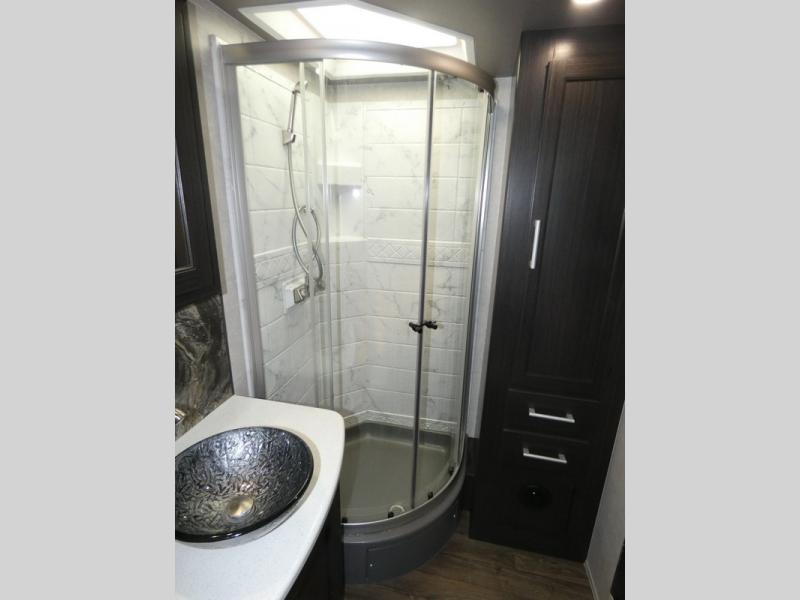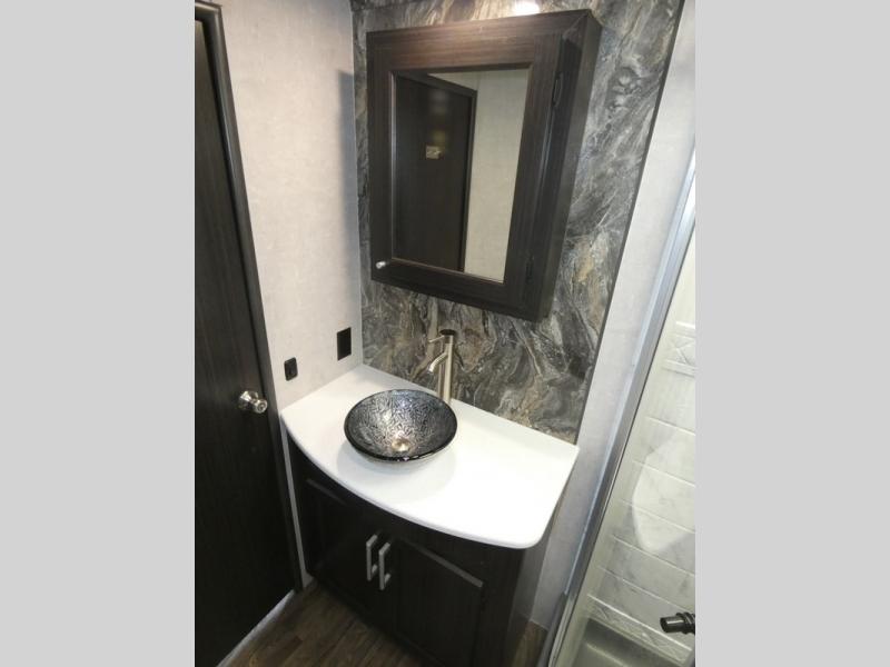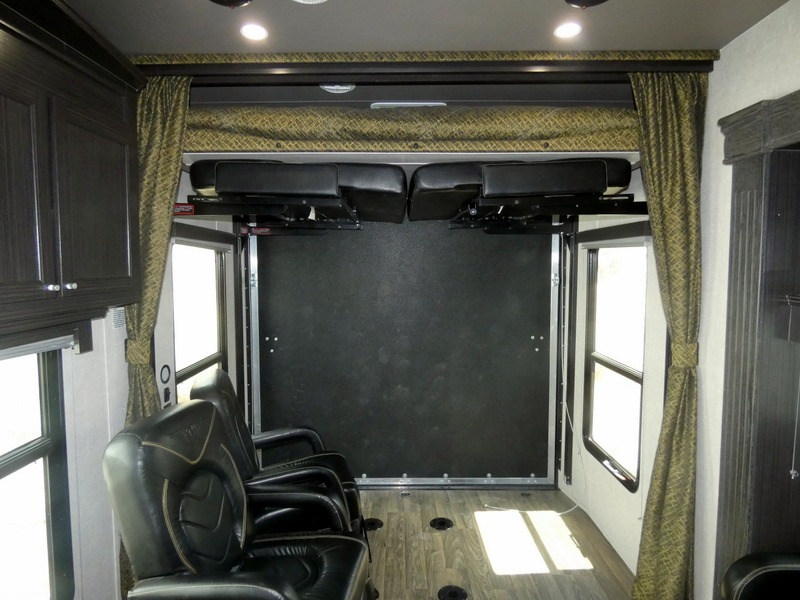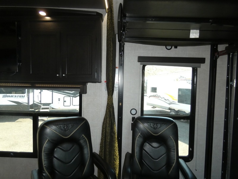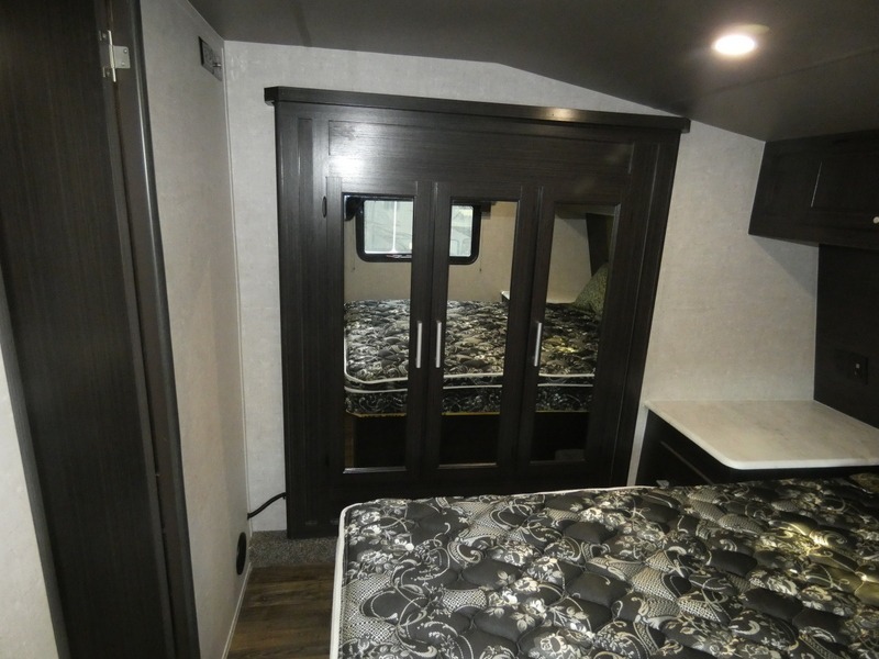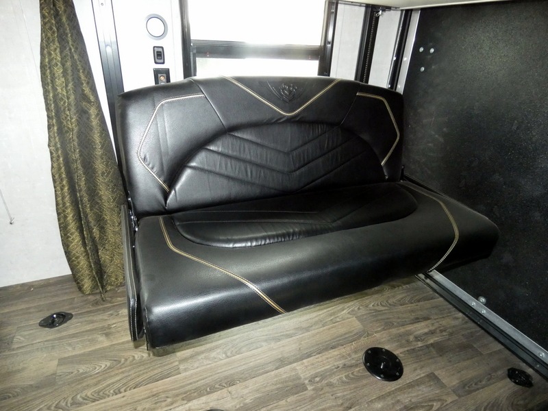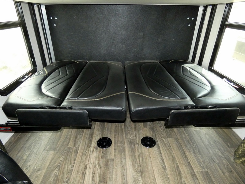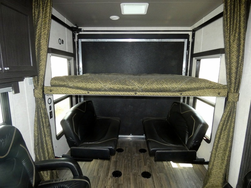 Easily find comfort and lots of legroom in this fifth wheel with a large slide out in the main living and kitchen area that is created after unloading from the cargo area. You can sleep family members between the queen bed in the front private bedroom with lots of storage for clothes and such, plus the electric bed and dinette seats in the cargo area, and the sofa next to the refrigerator. Make warm meals using the kitchen amenities, and the peninsula counter offers more space to serve food and wash the dishes. You will find storage throughout in overhead cabinets. And don't forget about the 14' to 17'7" of cargo space for your toys!