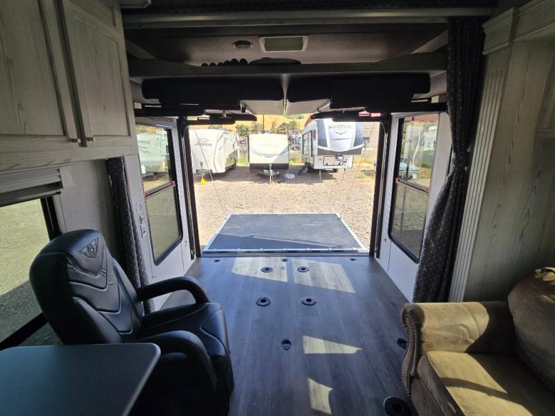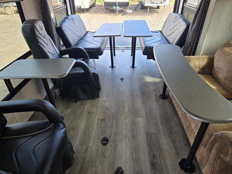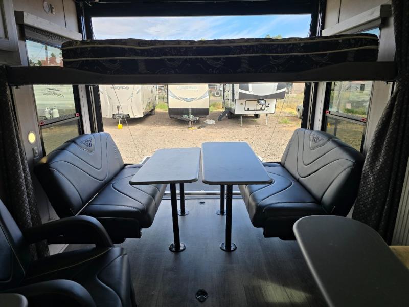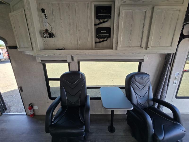 Gas up your off-road toys and load them up into this toy hauler with 17' of cargo space! You will enjoy a great night's rest on the queen bed inside the front private bedroom, plus there are wardrobes on either side of it, and you can even add the optional wardrobe slide. The dual-entry bath makes it easy for everyone to access, especially those staying in the bedroom. The rest of your guests can sleep on the rear electric bed with a dinette below that can be transformed into an extra sleeping space, and the sofa can also be a spot for one to take an afternoon nap. The Rockford Fosgate deluxe stereo comes with upgraded speakers, two amps, and a 10" sub so that you can crank up the tunes!