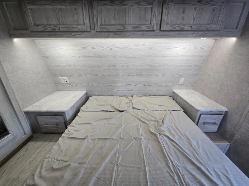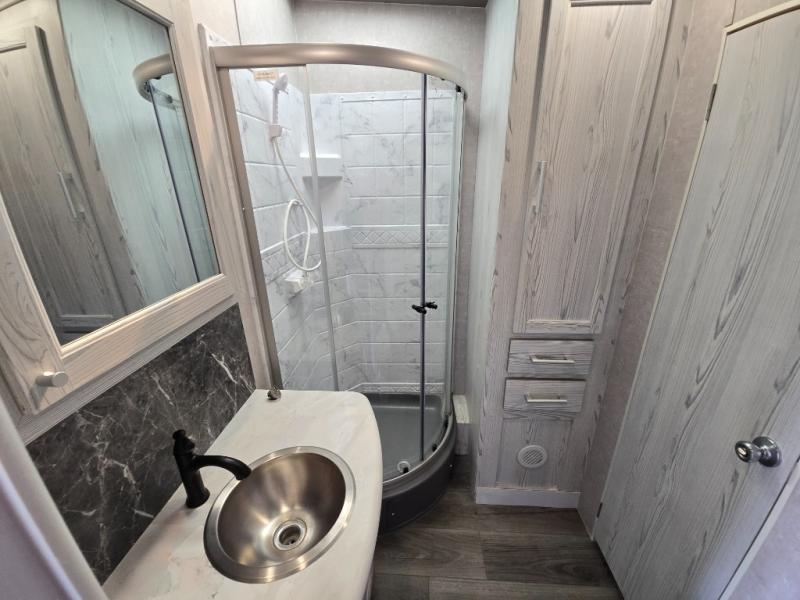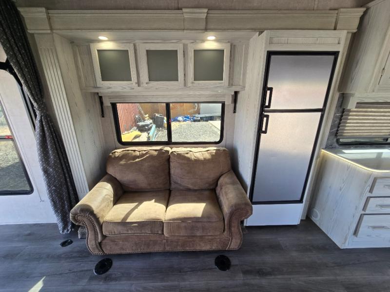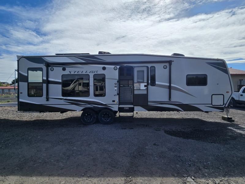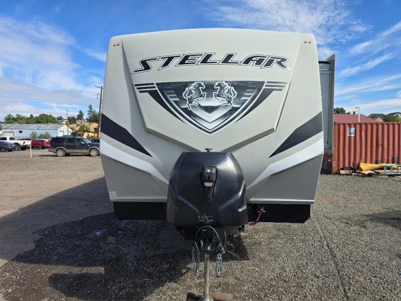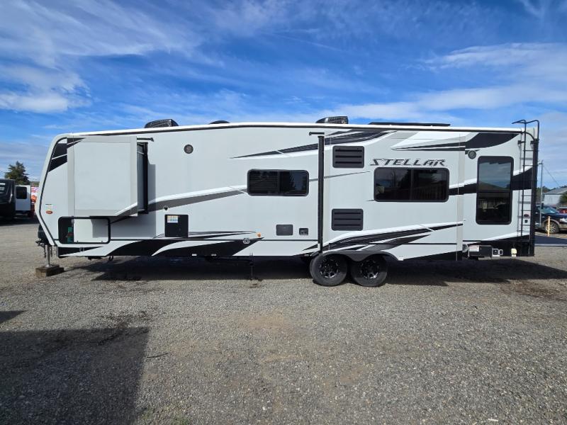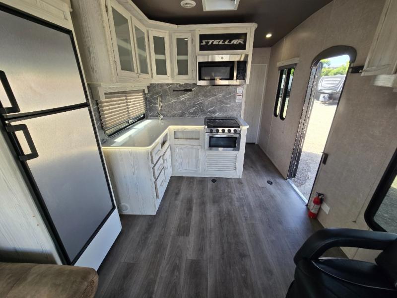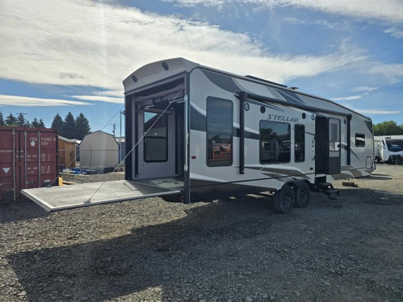 The Stellar Wide Lite toy hauler fifth wheels and toy hauler travel trailers were built with you in mind with exclusive features for outstanding comfort and functionality! You'll find great amenities from the USB chargers in the galley and bedroom and the living room TV to the 40-gallon fuel station and the exterior shower. The powder-coated chassis with a triple radius entry step, the laminated aluminum-framed fiberglass sidewalls, and the heavy-duty axles with Zerk fittings and self-adjusting brakes ensure you will have years of fun with this toy hauler. Not only does the interior have exquisite décor with a stainless steel single-bowl galley sink and a lighted solid-surface galley top, but the exterior also has an attractive design with the curbside under-glow LED lighting, the black aluminum wheels, and the front fiberglass caps with LED. Come choose your favorite model today!