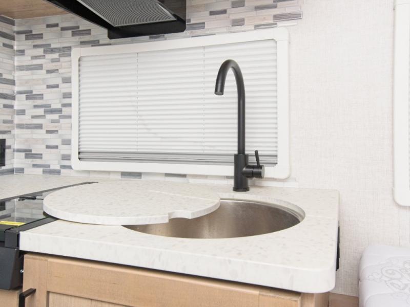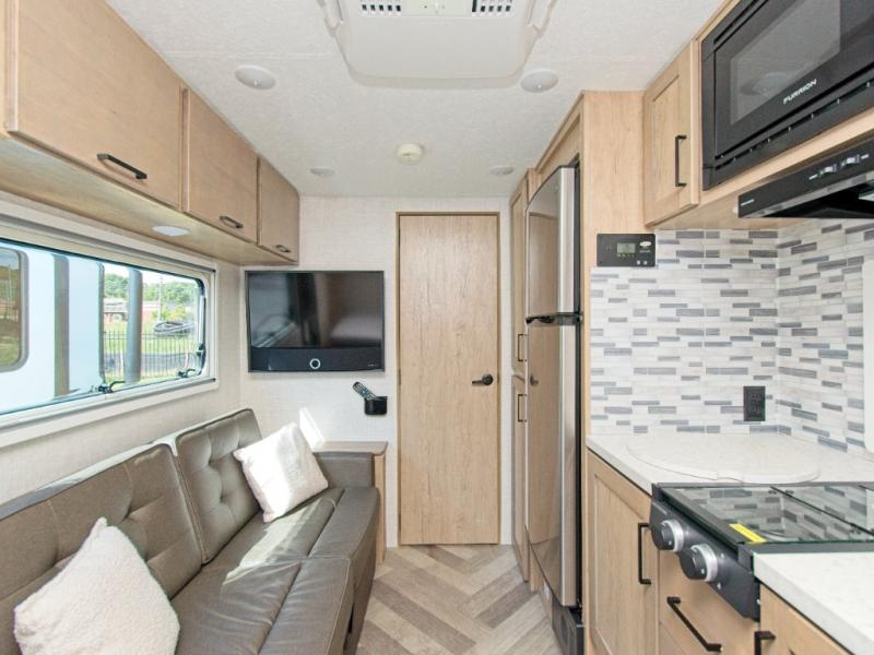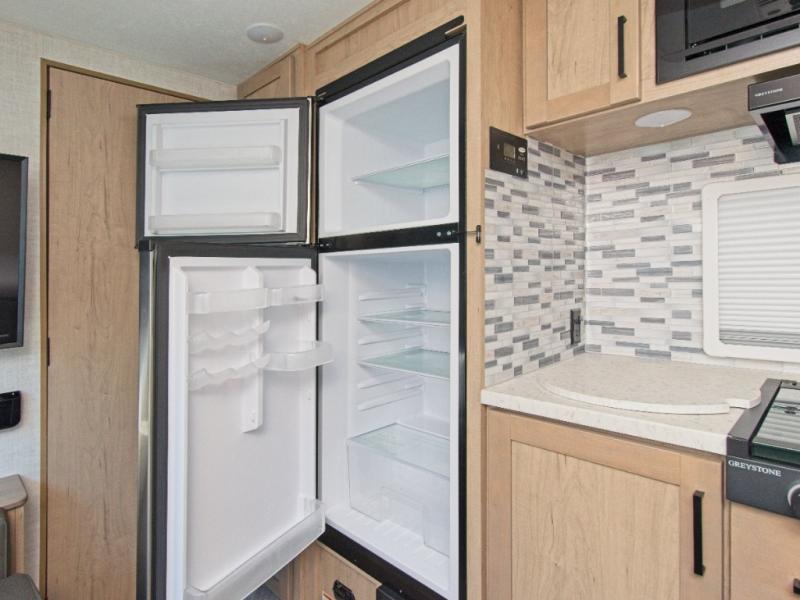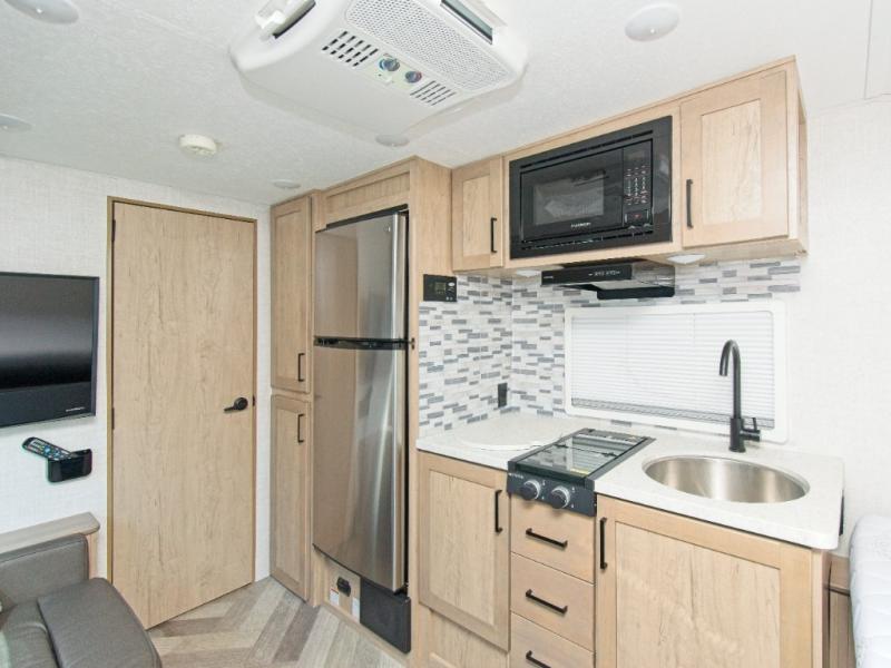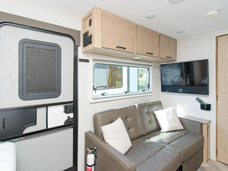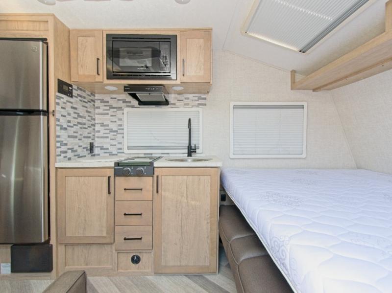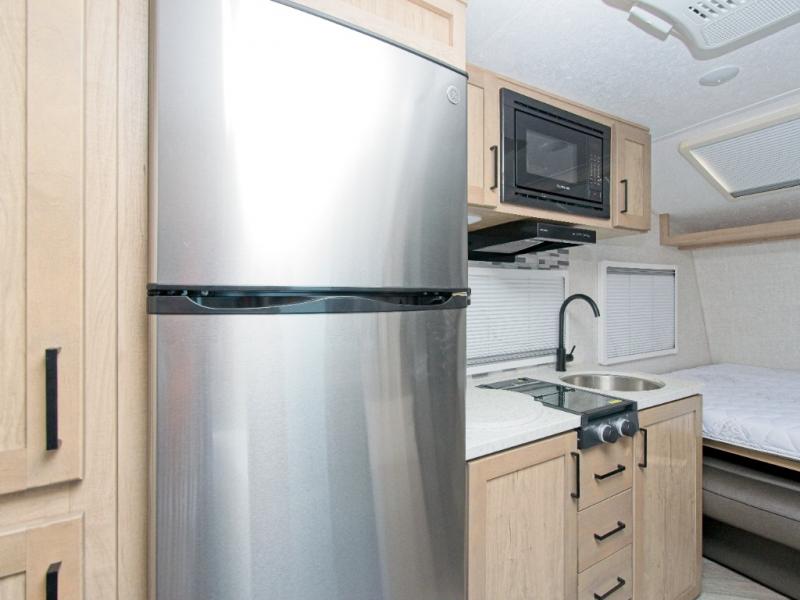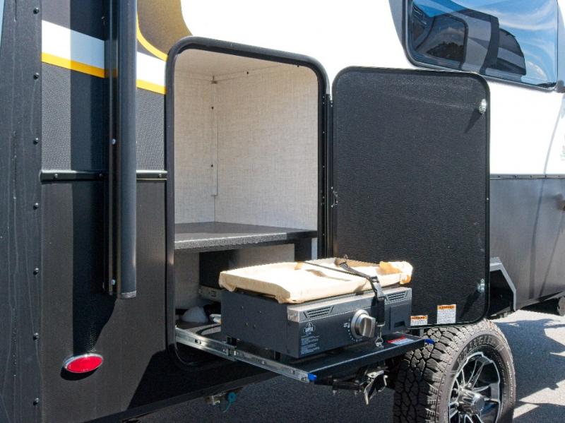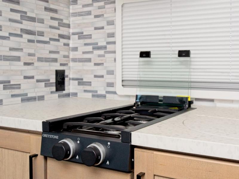 Enjoy meals at the jackknife sofa with a removable table, perfectly positioned across from a 12V HDTV/AV system with a hidden wardrobe. Cook indoors with a two-burner cooktop and 8 cu. ft. refrigerator, or take it outside with the outdoor kitchen equipped with a 1.6 cu. ft. fridge and optional griddle.