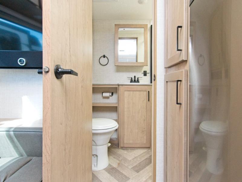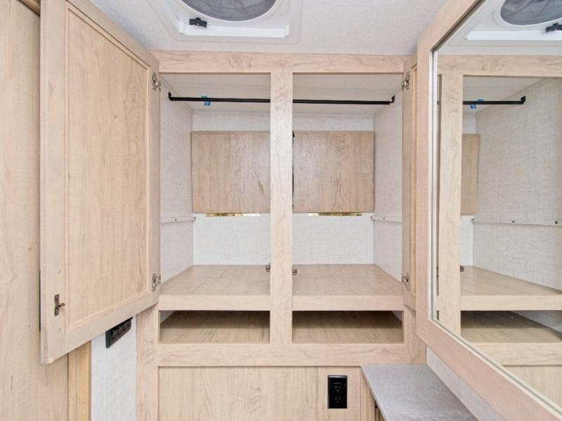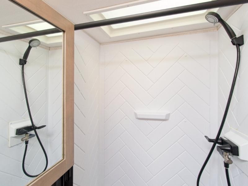 Unwind in the full rear bathroom featuring a roomy 24" x 40" shower and a dedicated wardrobe/linen closet. The front Murphy bed transforms your living space by day and offers a restful sleep by night under the stunning Stargazer Skylight.