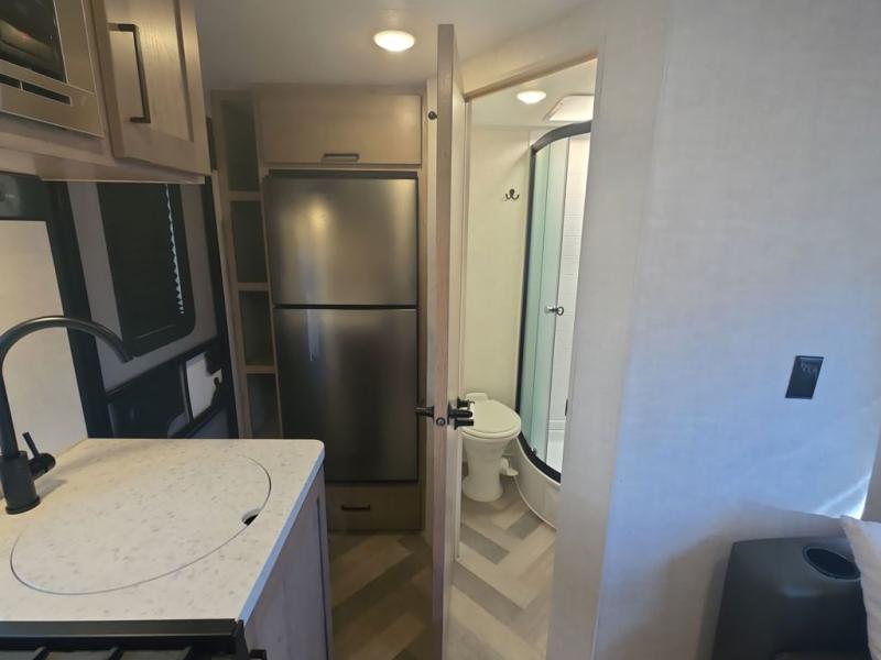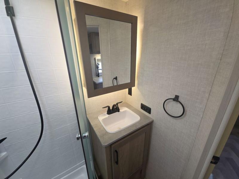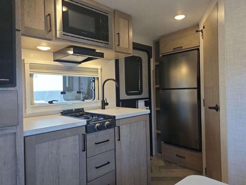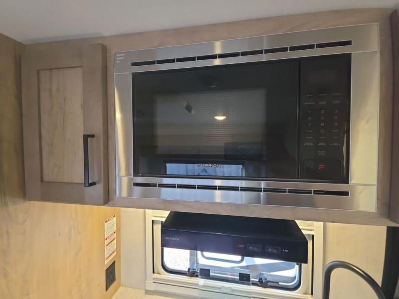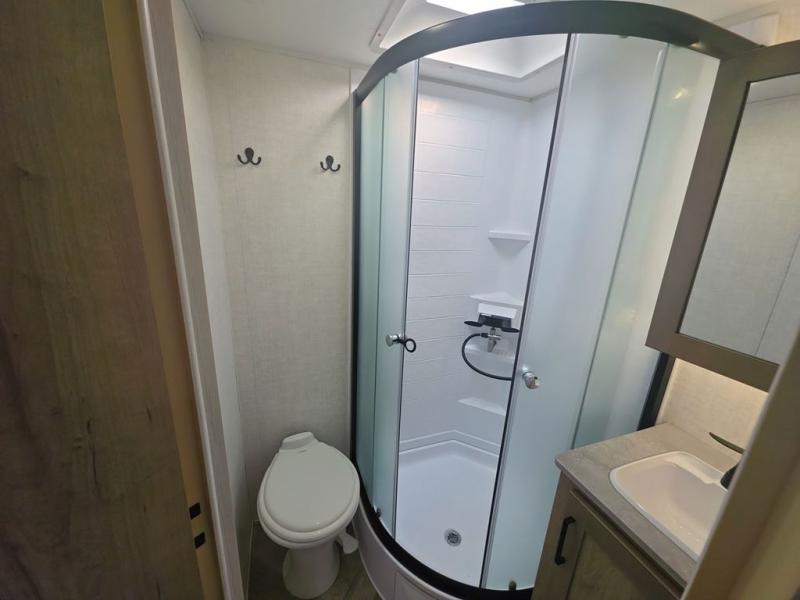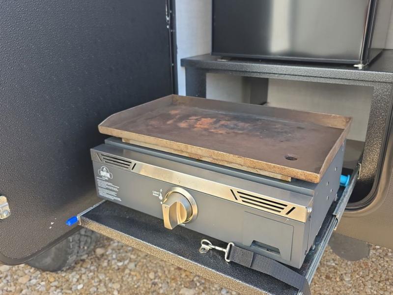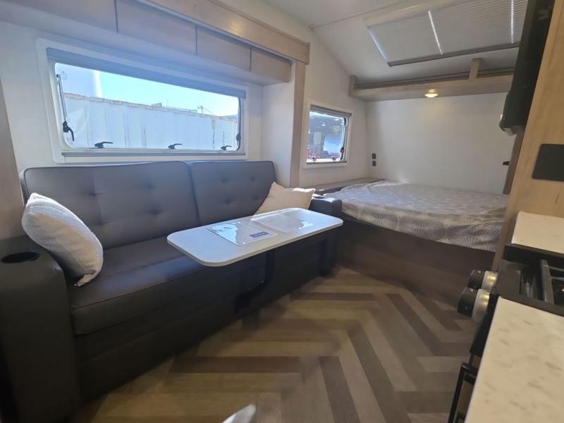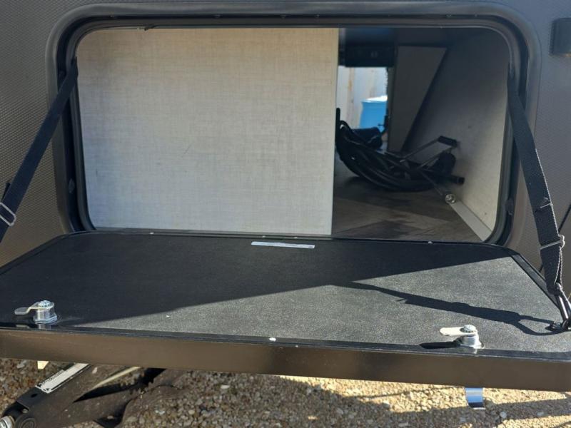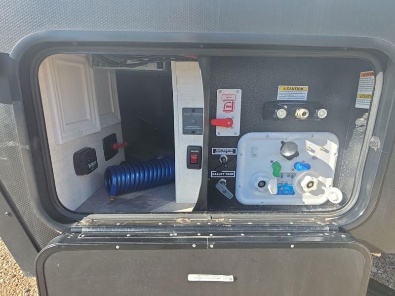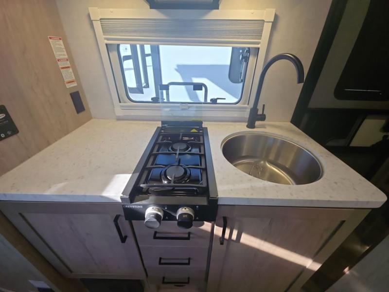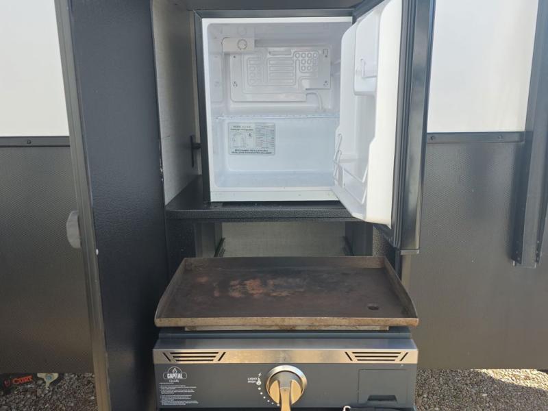 Pack your bags and hitch up this travel trailer for an unforgettable camping trip! Start each day feeling well rested after sleeping on the front queen bed and look up at the beautiful sky through the "Stargazer" skylight. Another friend can join in on the fun too and sleep on the jackknife sofa slide when you are done relaxing on it while watching a movie with the 12V HDTV/AV system which even has a hidden wardrobe behind it. On one side of the 8 cu. ft. refrigerator there is a pantry for your snacks, and on the other side you will find the rear corner bathroom with a 32" radius shower to freshen up. You can prepare delicious home cooked meals indoors with the two burner cooktop or head to the outside kitchen where you will find a 1.6 cu. ft. refrigerator and an optional griddle. There is also an optional microwave you can add to the inside kitchen for those nights when you don't feel like cooking!