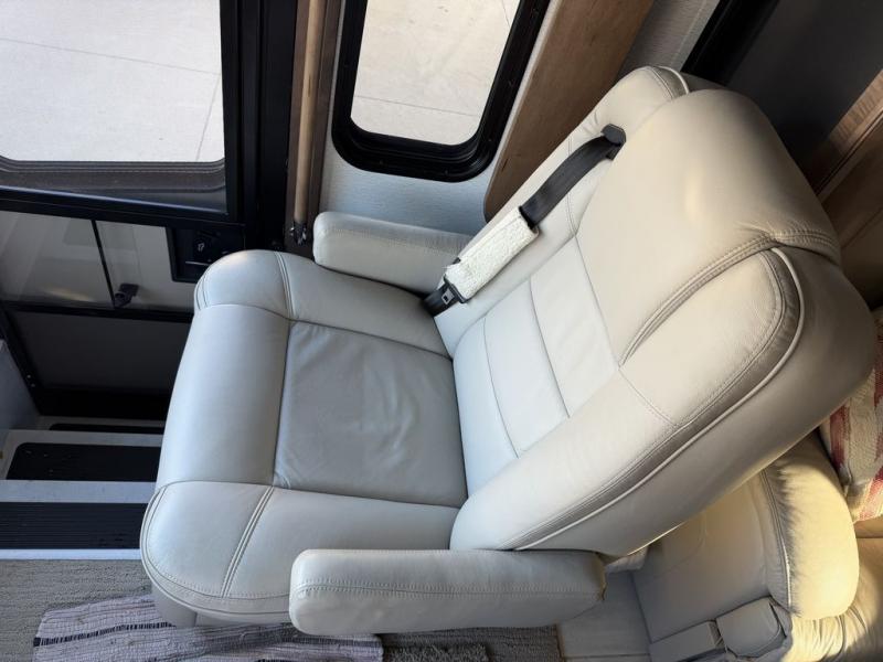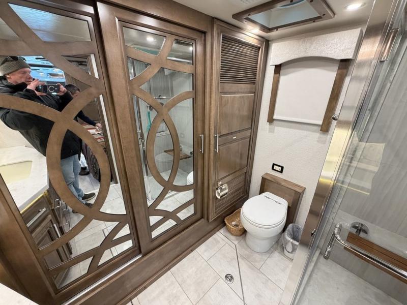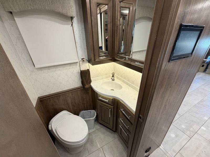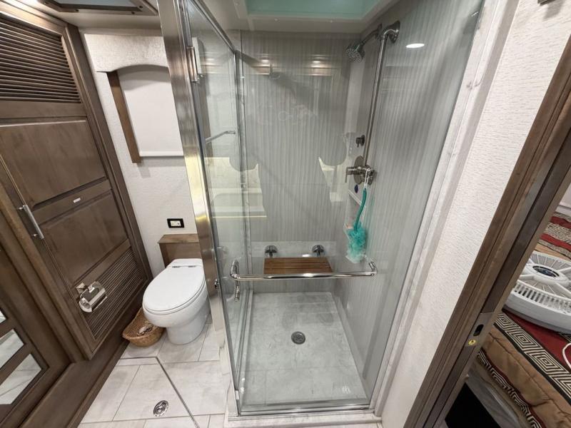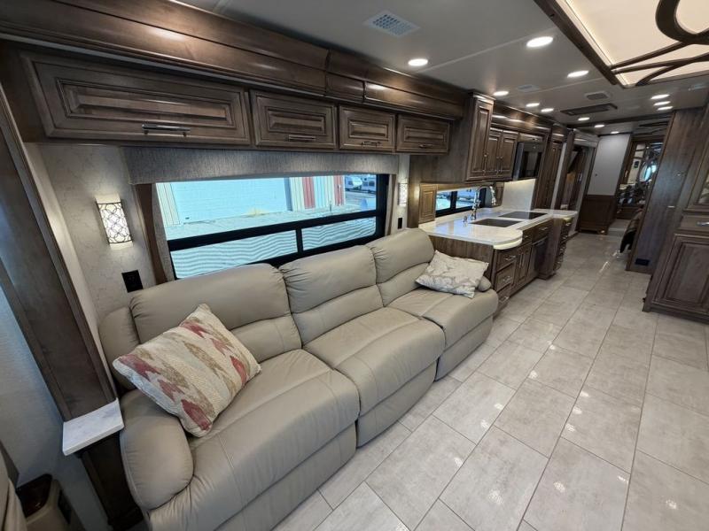 The cook will love the kitchen on this Anthem Class A diesel motorhome! From the induction cooktop which is easy to clean and the convection microwave to the slide out storage tray in the overhead cabinet and the Fisher & Paykel dishwasher, you can cook in style. The two ottomans in front of the sofa offer more seating or a place to put your legs up after a hike outside or shopping in town. Head to your master suite which has a Select Comfort Sleep Number king-size mattress, nightstands with USB ports, a set of wardrobes, and a 32" QLED 4K UHD Smart TV. The rear full bathroom offers a large cedar-lined wardrobe, a washer/dryer, a shower, and everything you will need to stay refreshed, and the mid-coach half bath is an additional convenience for all. You might like to add a few options such as a 100" reclining sofa.
