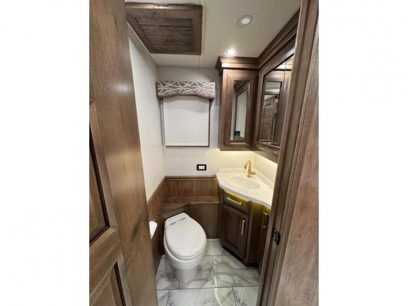 This motorhome with four slides is your ticket to luxurious camping or full-time RV living. Once you arrive at your destination, you may want to get cleaned up in the full bath. Here, you'll find dual bath sinks, porcelain tile shower walls, a skylight, and a Maxxair Deluxe power exhaust vent fan to keep everything fresh. There is also a large walk-in wardrobe with plenty of storage and a Whirlpool stacked washer and dryer if you need to get a load done. Head to the main living area to relax on the hide-a-bed sofa, the sofa with ottomans, or at the free-standing table with an expansion. The induction cooktop and Whirlpool convection microwave will allow you to cook up your best meals, and the Fisher and Paykel dishwasher will make clean up easy as 1-2-3!