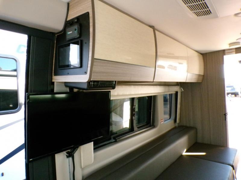 The Ultraleather swivel captain seats provide unmatched comfort during your travels, and the flip-out table behind the passenger seat gives you a practical workstation on the go. After a day of adventures, settle in and catch a movie on the 24" TV positioned at the rear, or simply enjoy the peaceful ambiance that this motorhome offers.