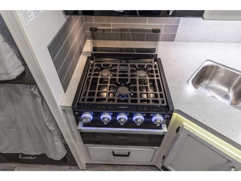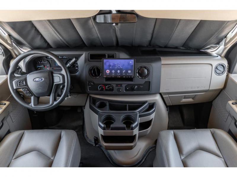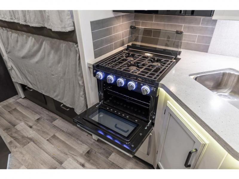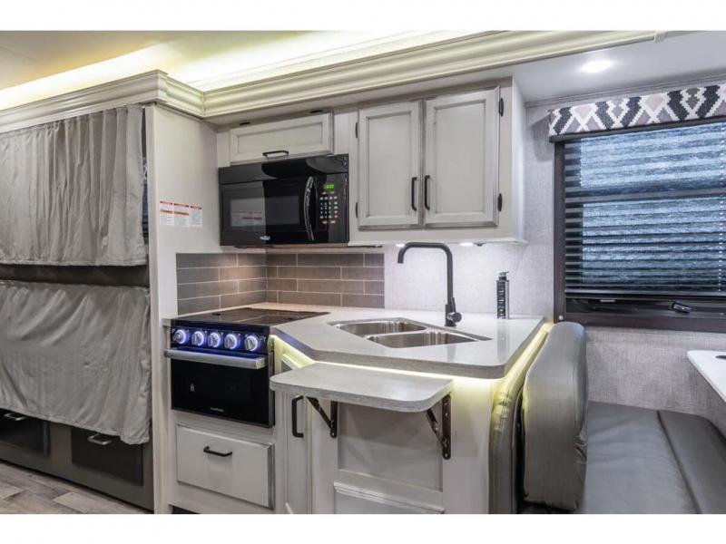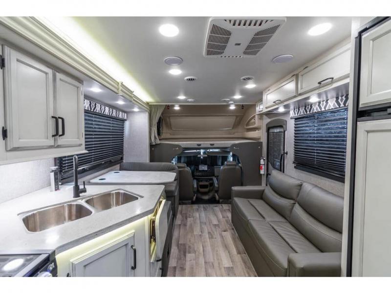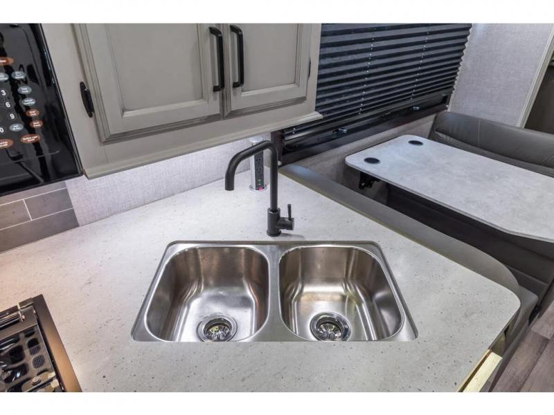 With any Odyssey Class C gas motorhome by Entegra Coach, the driver will appreciate the power from the 350 HP engine, the towing capacity from the 7,500 lb. hitch, the Tire Pressure Monitoring system, the navigation from the Sony infotainment center with Apple CarPlay and Android Auto, plus the backup and side-view cameras when parking and driving down the highway. The kitchen offers full amenities including a recessed stainless steel sink with a cutting board sink cover, LED-lite pressed countertops, a decorative backsplash, and a pop-up charging station with 110 outlet and USB plugs to keep your smart phones charged. Get ready for luxury in a Class C, choose your favorite today!
