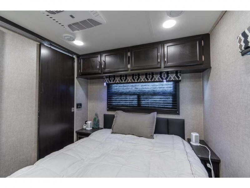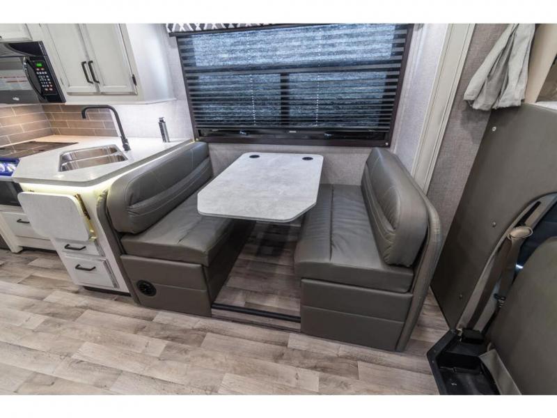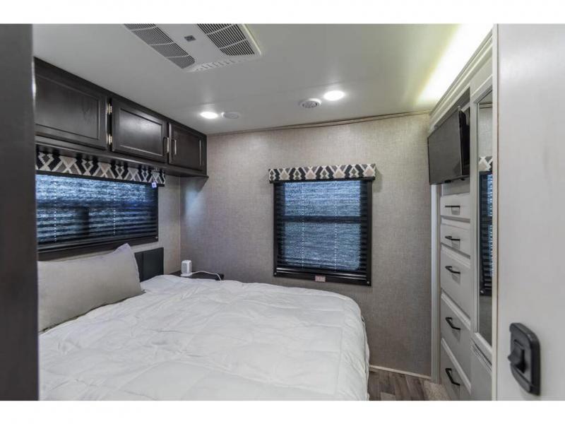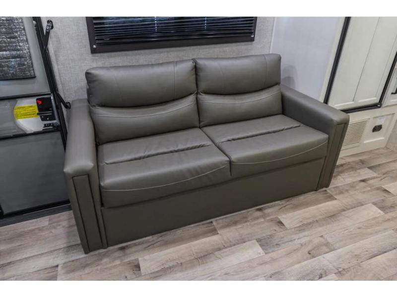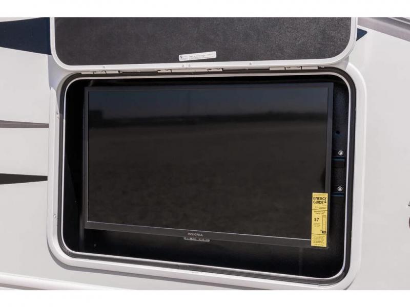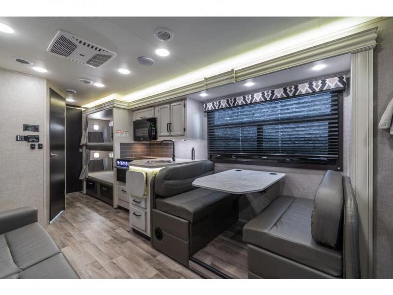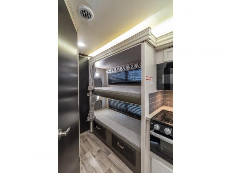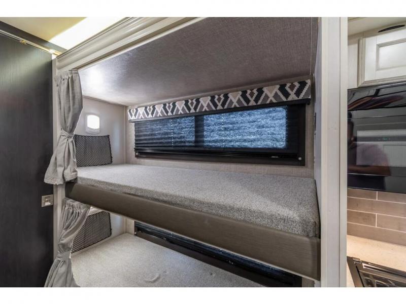 Gather your family and load up for travel games, camping games and all around comfort and luxury! The full-wall slide provides extra floor space from just behind the swivel captains chairs all the way back to the private rear bedroom with a queen bed and clothing storage. The bunk beds are across from the main entry to the bathroom, and your kids or grandkids will love this space as well as the front cab-over bunk. You even have more sleeping space provided by the booth dinette and sofa once easily setup for bedtime. And the cook will have a residential-size microwave, a Furrion all-in-one cooktop and oven, plus an 8 cu. ft. refrigerator to keep everyone fed, and the pantry will hold the snacks. Everyone can also enjoy the 18' electric awning while at the campsite either day or night thanks to the LED lights, and the exterior TV will allow you to watch the big game in the great outdoors.