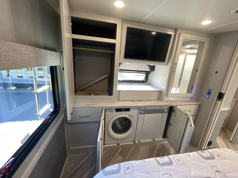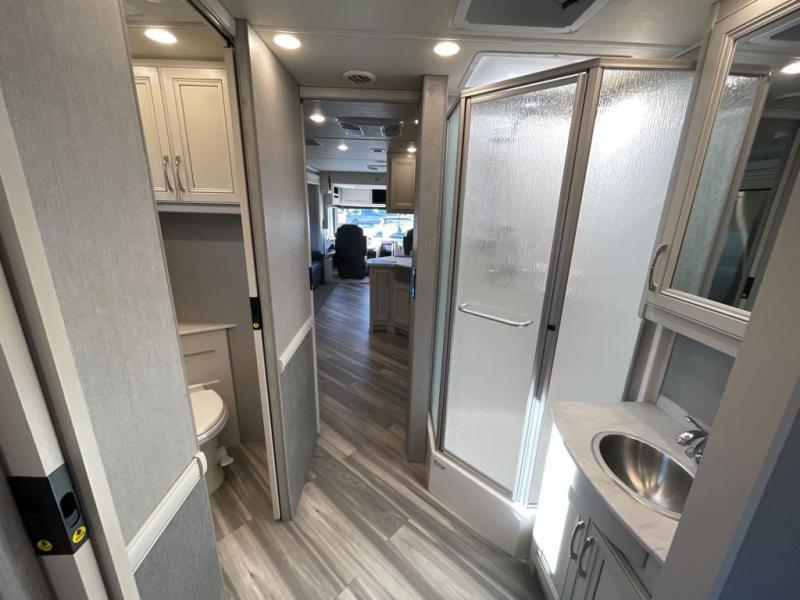Looking for a spacious RV with a mid-coach entry, four distinct areas, and offers a way to work while on the road plus be able to host a dinner party for friends and family? This Bounder gives you all that and so much more like a stainless steel farmhouse sink, a solid surface top in the galley, and full extension drawer guides with latches, plus full amenities to make any meals including a convection microwave and residential refrigerator. The split bathroom is super convenient when trying to get ready in the mornings. One person can be washing their hands in the private sink and toilet room while another person can be using the second sink beside the neo-angled shower. Yet you can also close two sliding doors to make this one big bathroom for yourself. And the multi-purpose Adapt-table dinette allows you to work or eat breakfast for two, and you can easily swing the table out vertically to host four. The rear bedroom offers a slide out king bed, plus plenty of storage and an LED TV to watch before falling asleep. If you like to host overnight guests, the jack knife sofa is available, and you might like to add the optional Hide-A-Loft power drop-down overhead bunk so they have that choice as well.