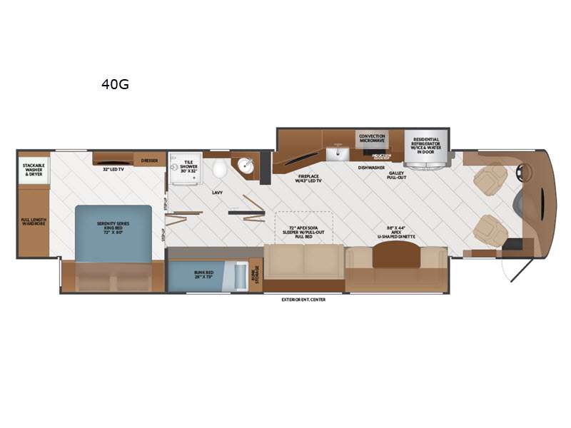 Wow! Check out this coach that can sleep eight for whole-family fun! The bunk beds are right across from the full bath for convenience, and there is even bunk storage for your guests' belongings and accordion doors so they can enjoy their own space. You can enter the full bath from the living area, the bunk area, or the rear master bedroom. Now, that's convenient! After a great night's rest on the king bed, choose your outfit from the full-length wardrobe, and start a load of laundry in the stackable washer and dryer. Head to the kitchen to prepare breakfast on the two burner induction cooktop, or use the convection microwave. There is also a dishwasher here for easy clean-up and a residential refrigerator with ice and water in the door. Your crew will love hanging out in the main living area that includes an Apex sofa sleeper, an Apex U-shaped dinette, and a fireplace with a 43" LED TV!