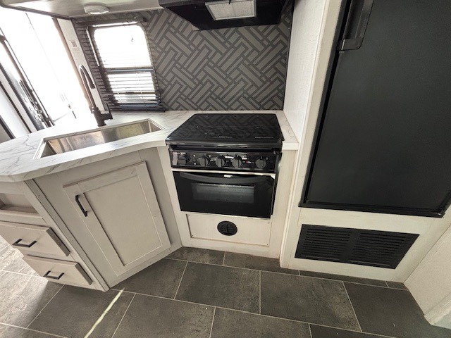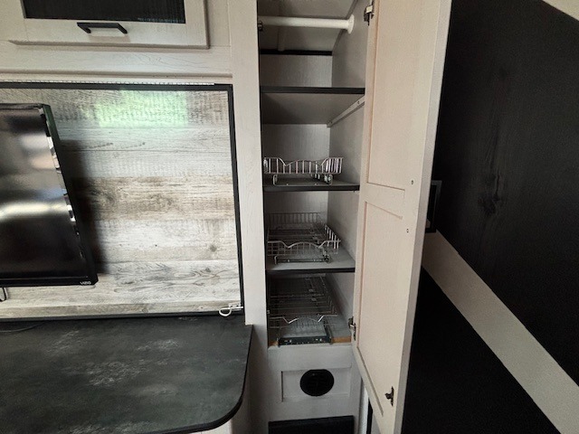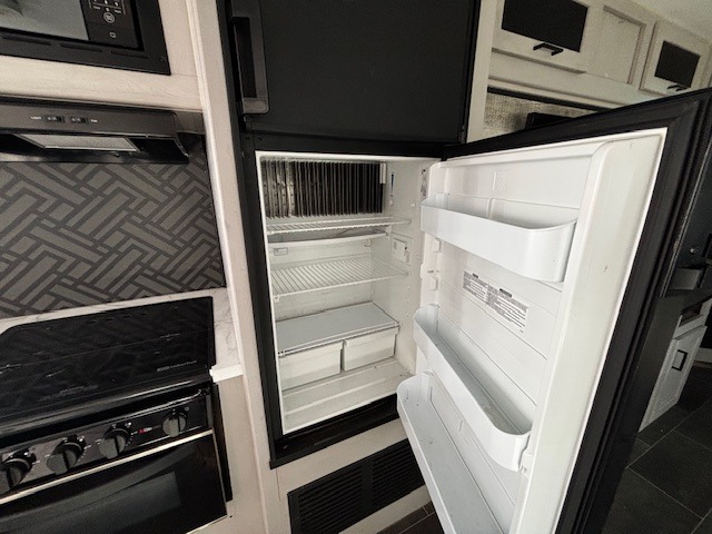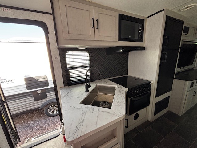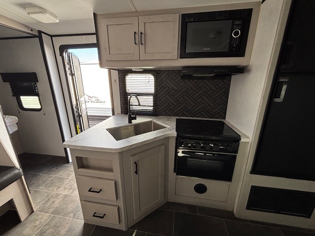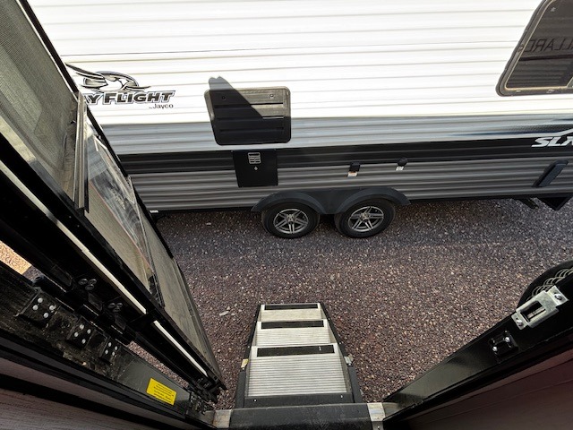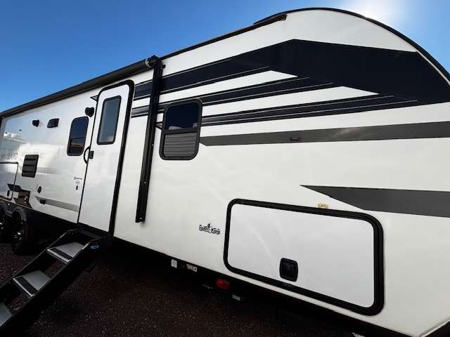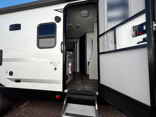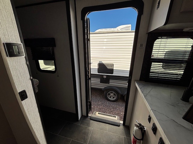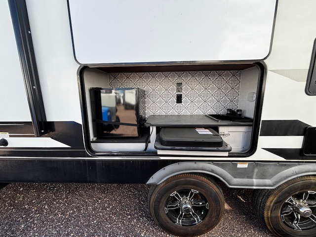 Step outside to find even more to love, including an exterior slide cooktop for outdoor cooking, a 16' power awning with LED lighting, and pass-through storage for all your gear. The flip-down entry steps provide stability and convenience, while the Wide Traxx axle system and enclosed heated underbelly ensure a smooth and reliable tow in any season.