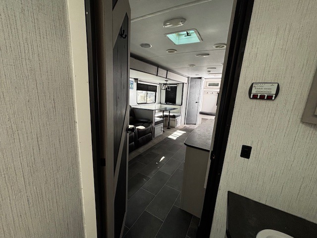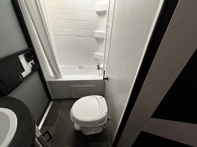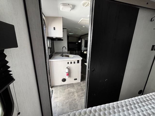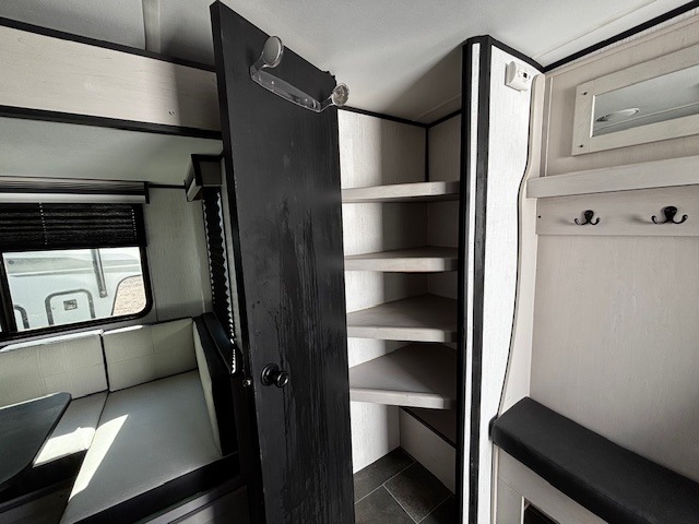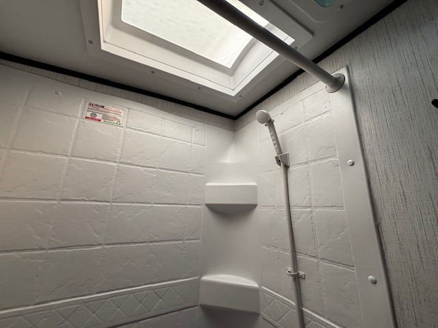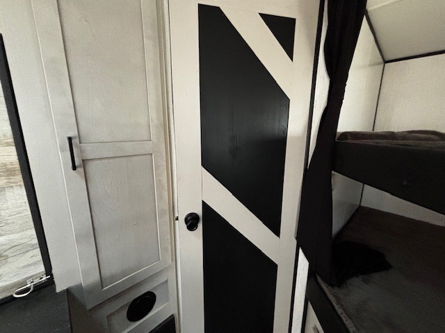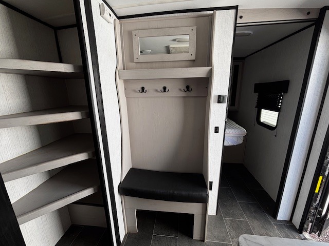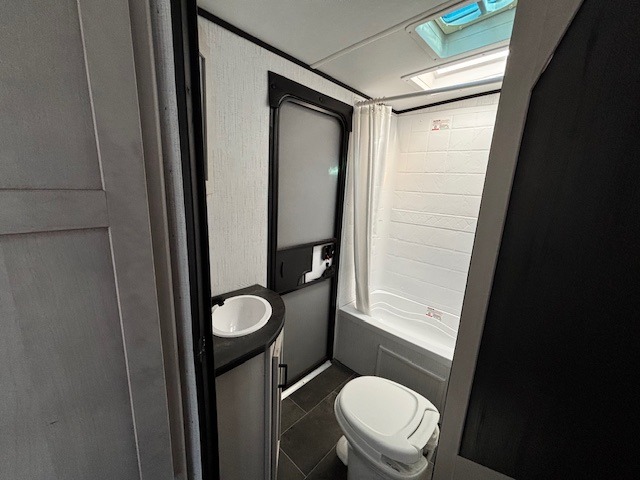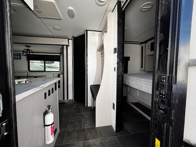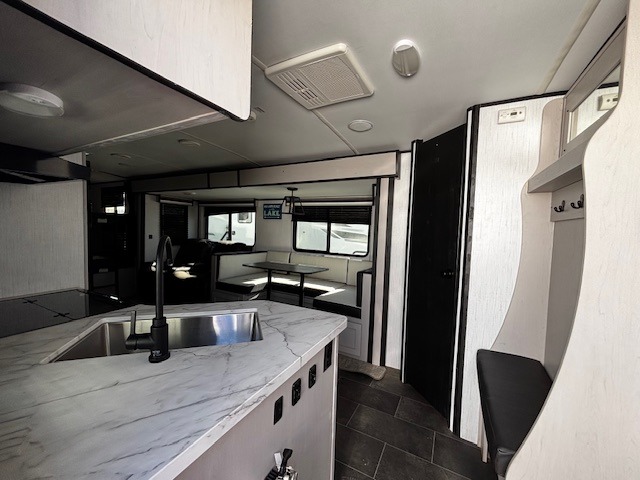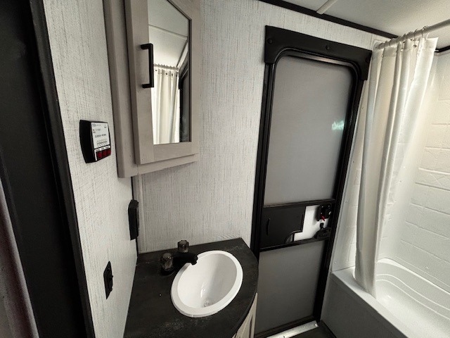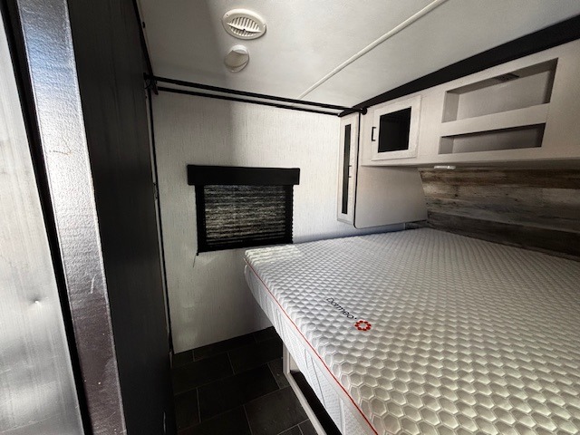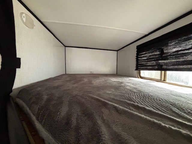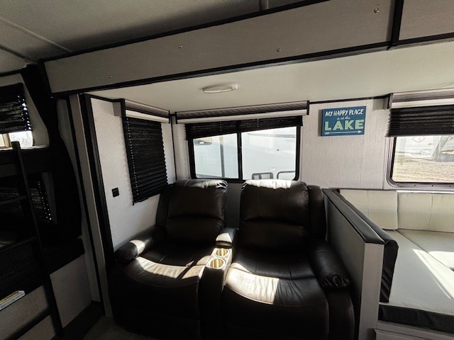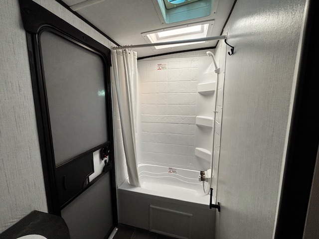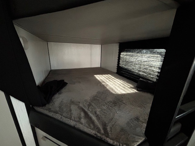 Step inside to discover a spacious layout perfect for family camping. The rear private bunk area features queen-size bunk beds, giving the kids or guests their own space to relax. A full corner bathroom with its own exterior door provides added convenience, allowing quick access from outside without tracking through the main living area.